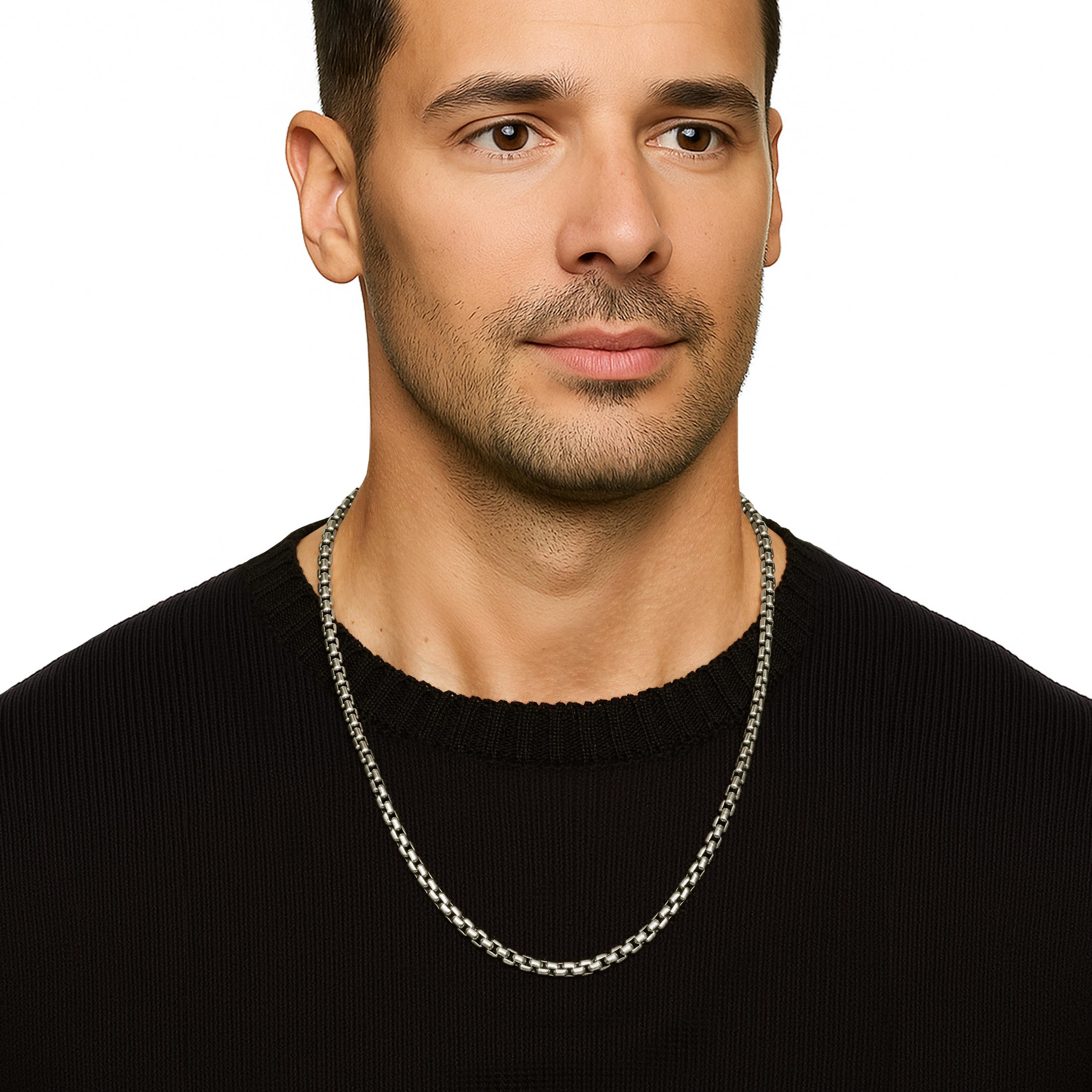 Trendy 5mm box link chain necklace, crafted in high polished stainless steel. Our chains are inspired by classical and original motifs, and are meticulously crafted by artisans, with an high precision lobster clasp riveted directly into the chain, making it virtually unbreakable.