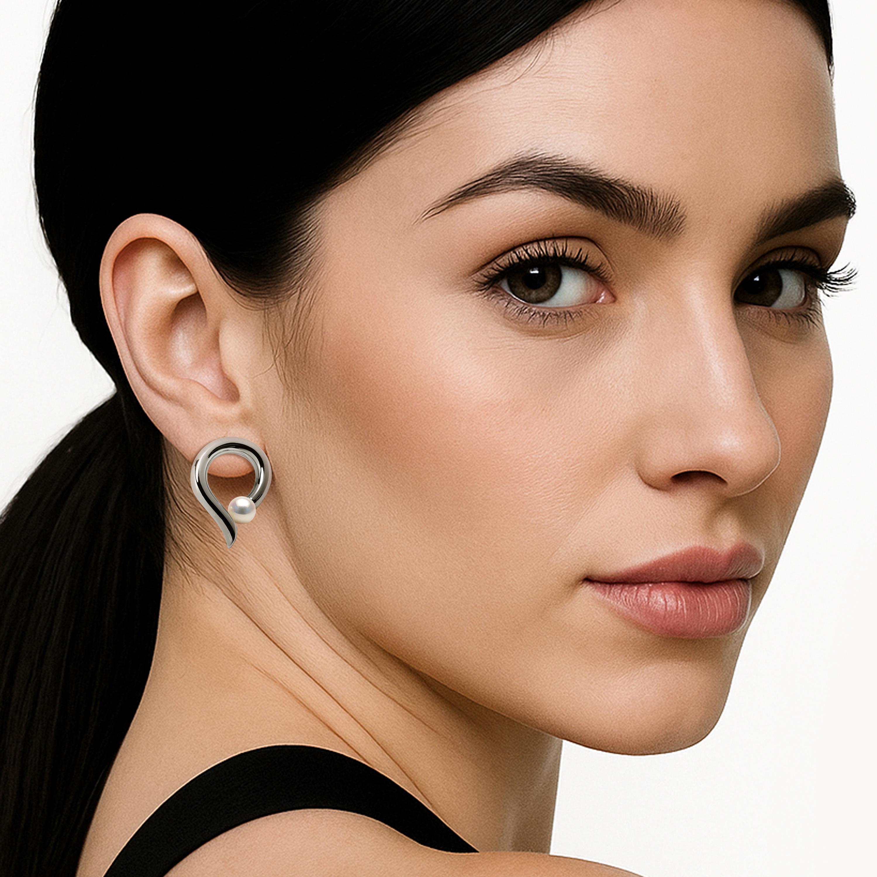 This dramatic yet understated design turns the earlobe into architectural canvas, with the tension-set pearl capturing light from every angle. The open teardrop allows gentle movement, reflecting Taormina’s ethos of modern geometry fused with timeless wearability.