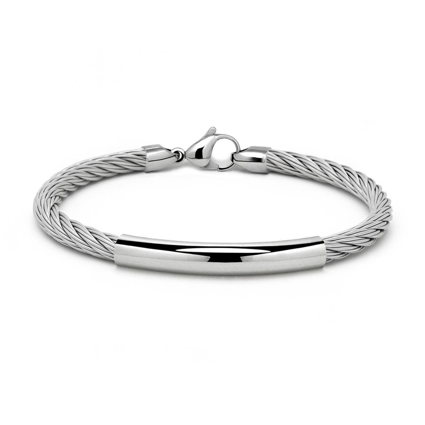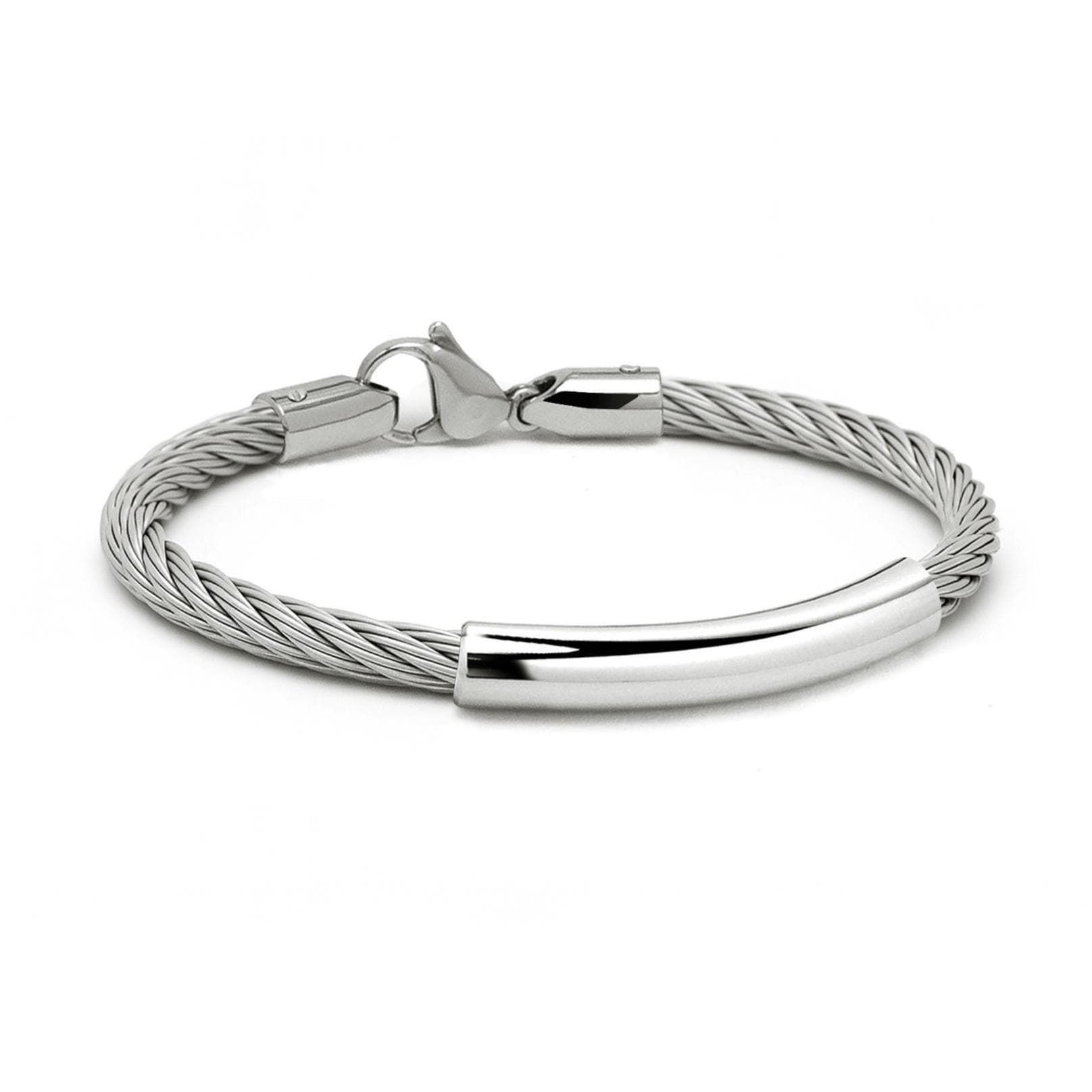 The clean, curved steel element follows the natural shape of the wrist, ensuring a comfortable fit. Finished with high-polish stainless steel lobster clasp. The side caps are securely riveted into the cable, ensuring a robust and reliable connection , this bracelet is perfect worn solo or layered with other pieces for a personalized look. Lightweight and versatile, it transitions seamlessly from office to evening.