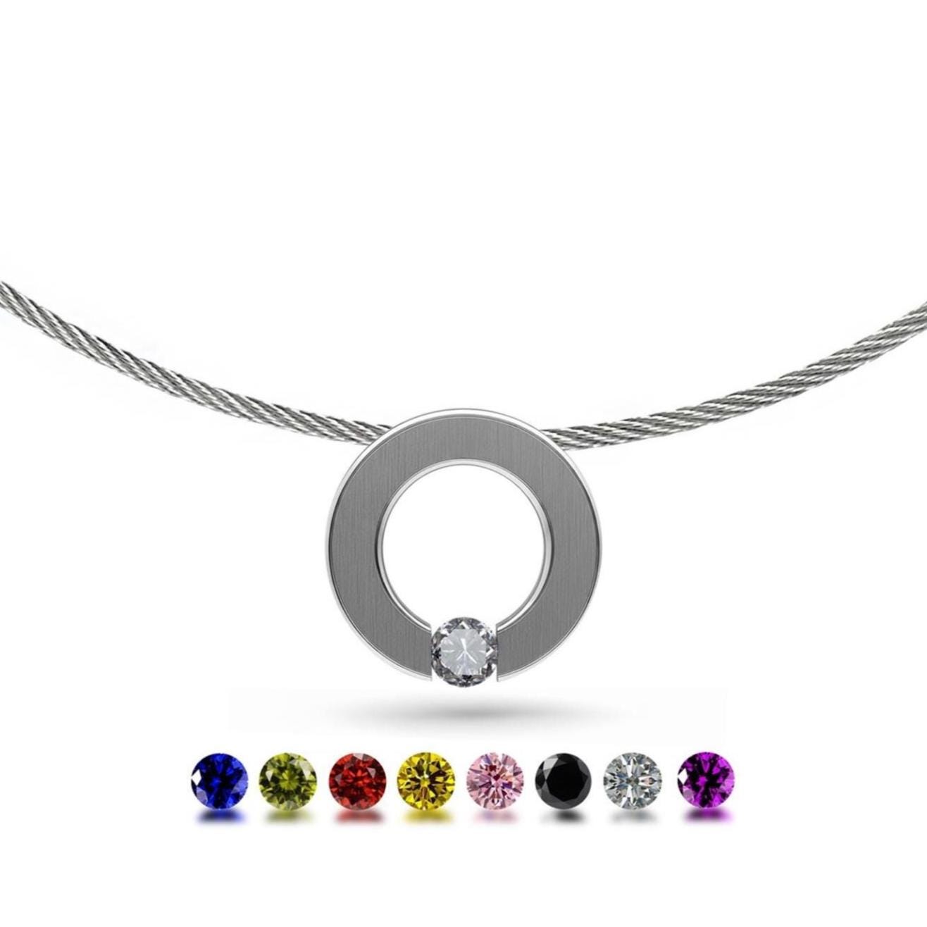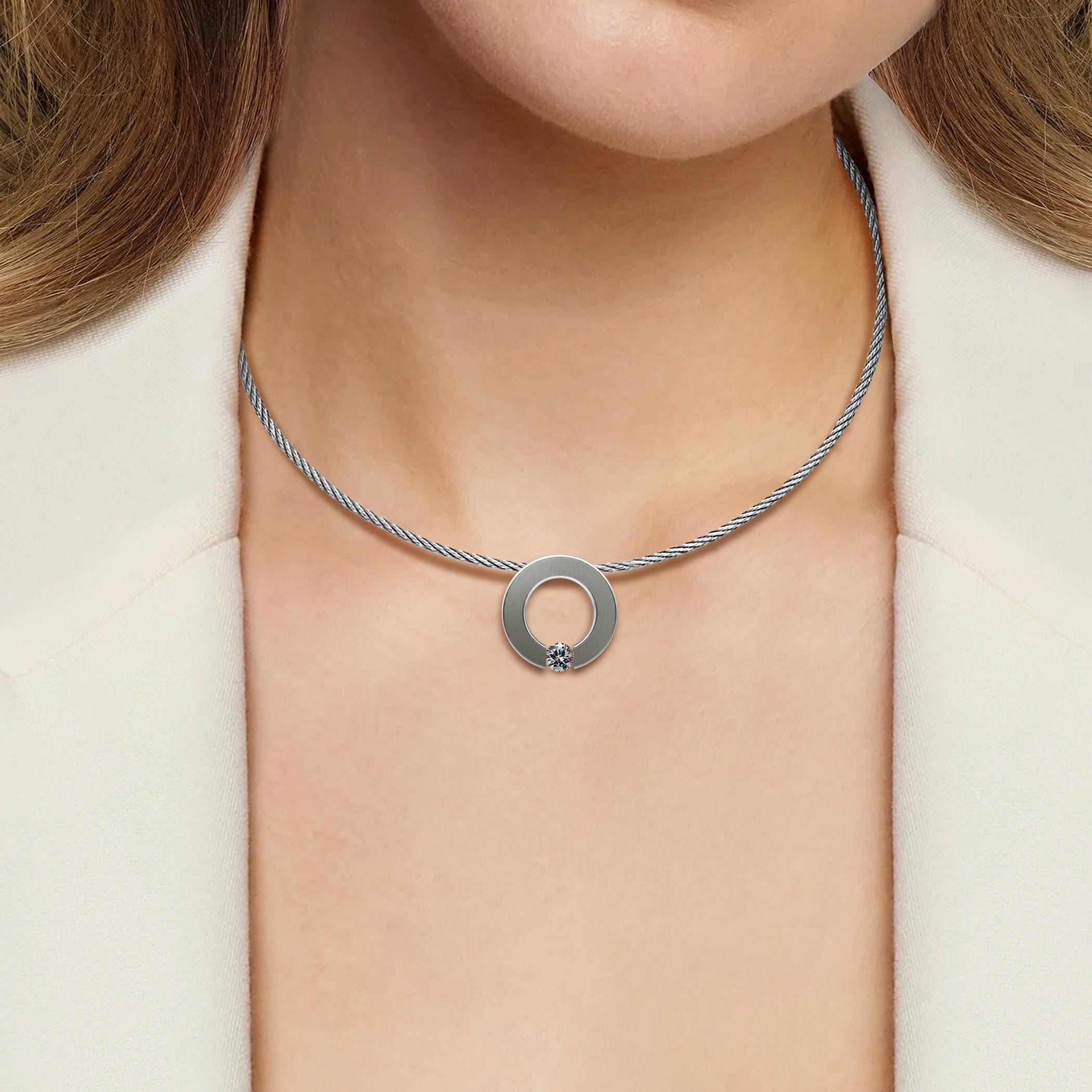 Round flat center ring with tension set White Sapphire hanging on a thin stainless steel rope cable. The brilliant-cut Gemstone rests between the ring ends in center position, surrounded by light, it shows off its full sparkling beauty.