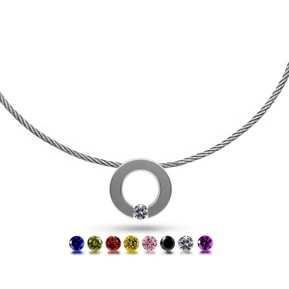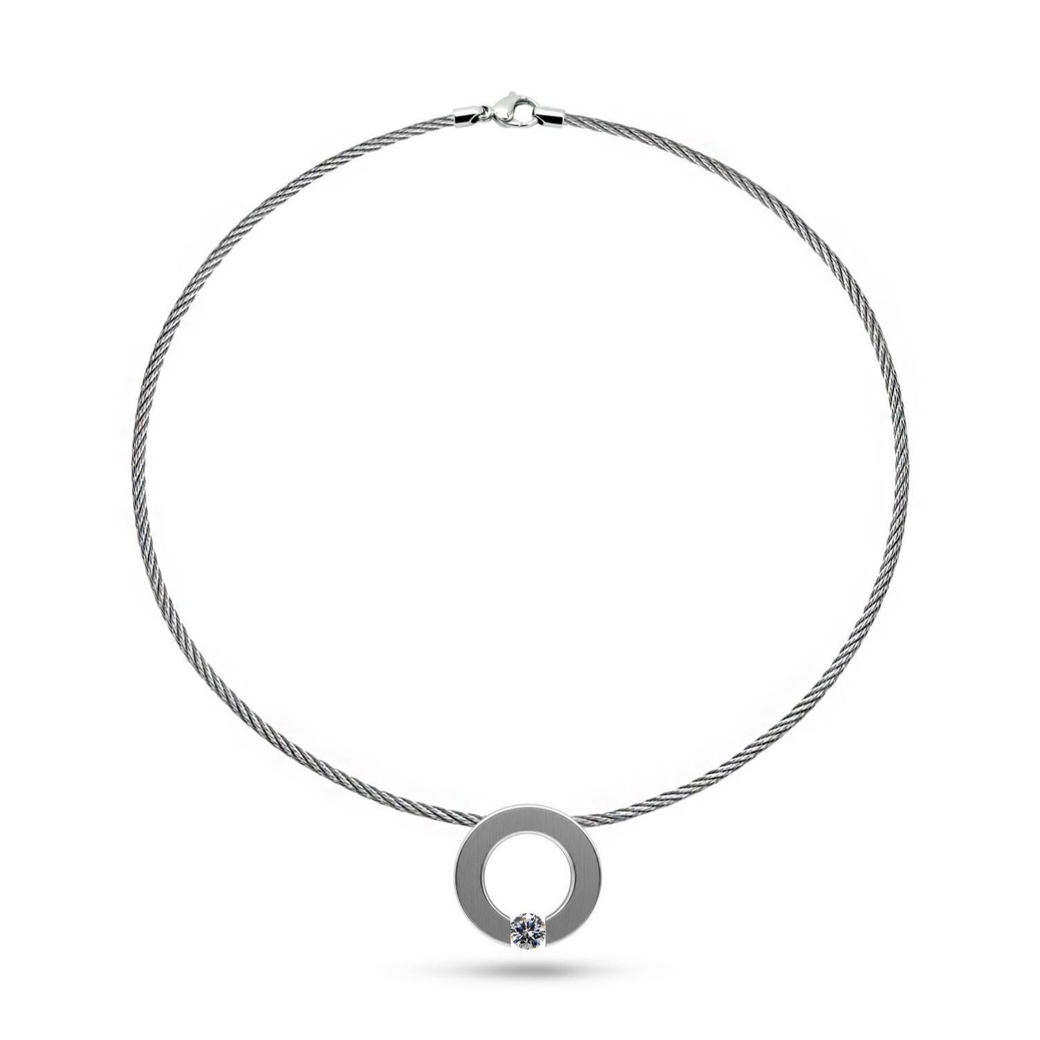 Round flat center ring with tension set White Sapphire hanging on a thin stainless steel rope cable. The brilliant-cut Gemstone rests between the ring ends in center position, surrounded by light, it shows off its full sparkling beauty.
