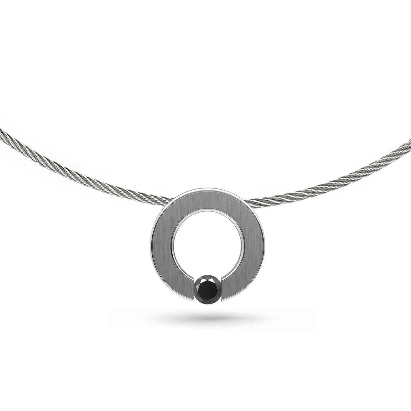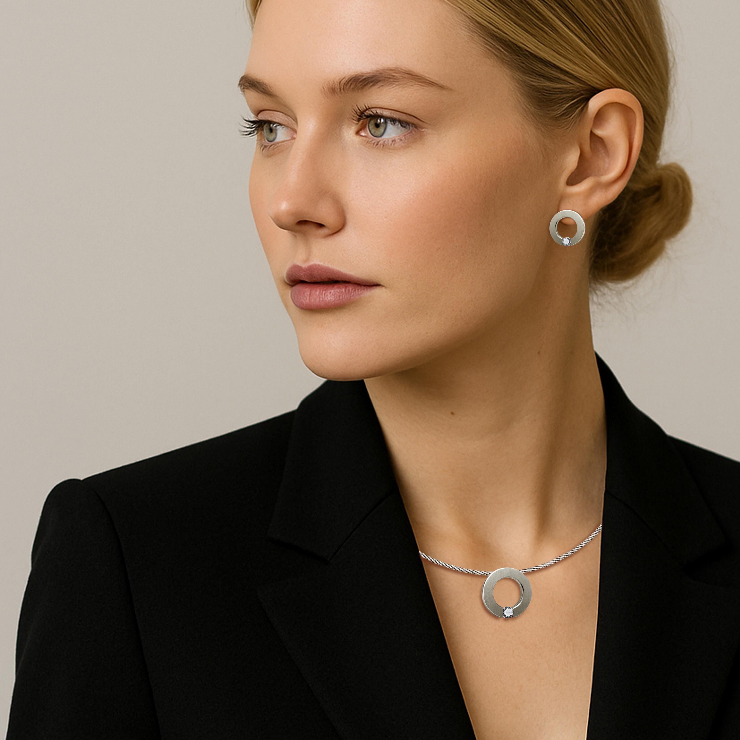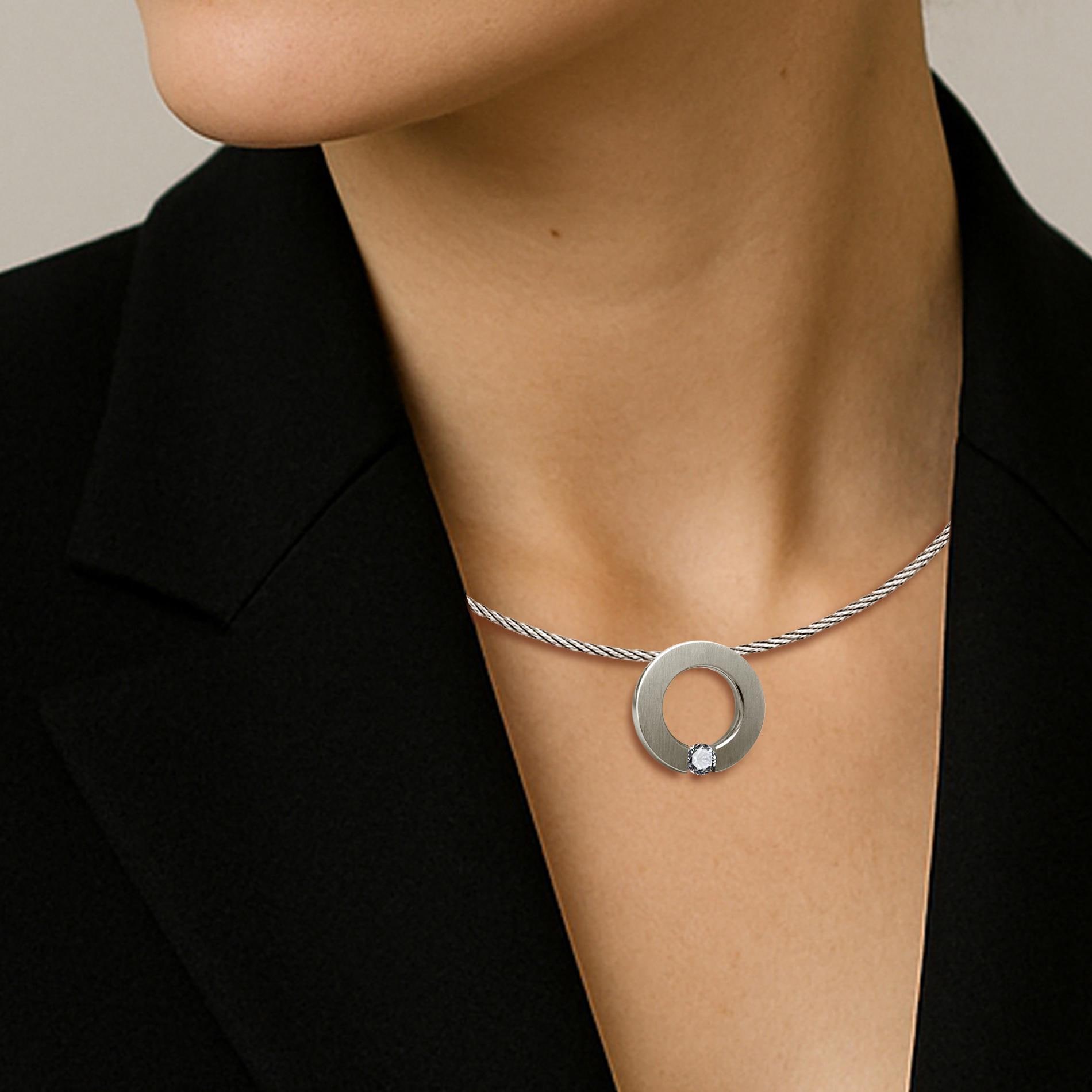 Radiant and refined, the Abbracci pendant captures the quiet poetry of the night sky. A perfectly round gemstone, tension-set within a brushed with polished edges stainless steel flat O-ring, glows at the heart of the design—an emblem of balance, purity, and enduring elegance.