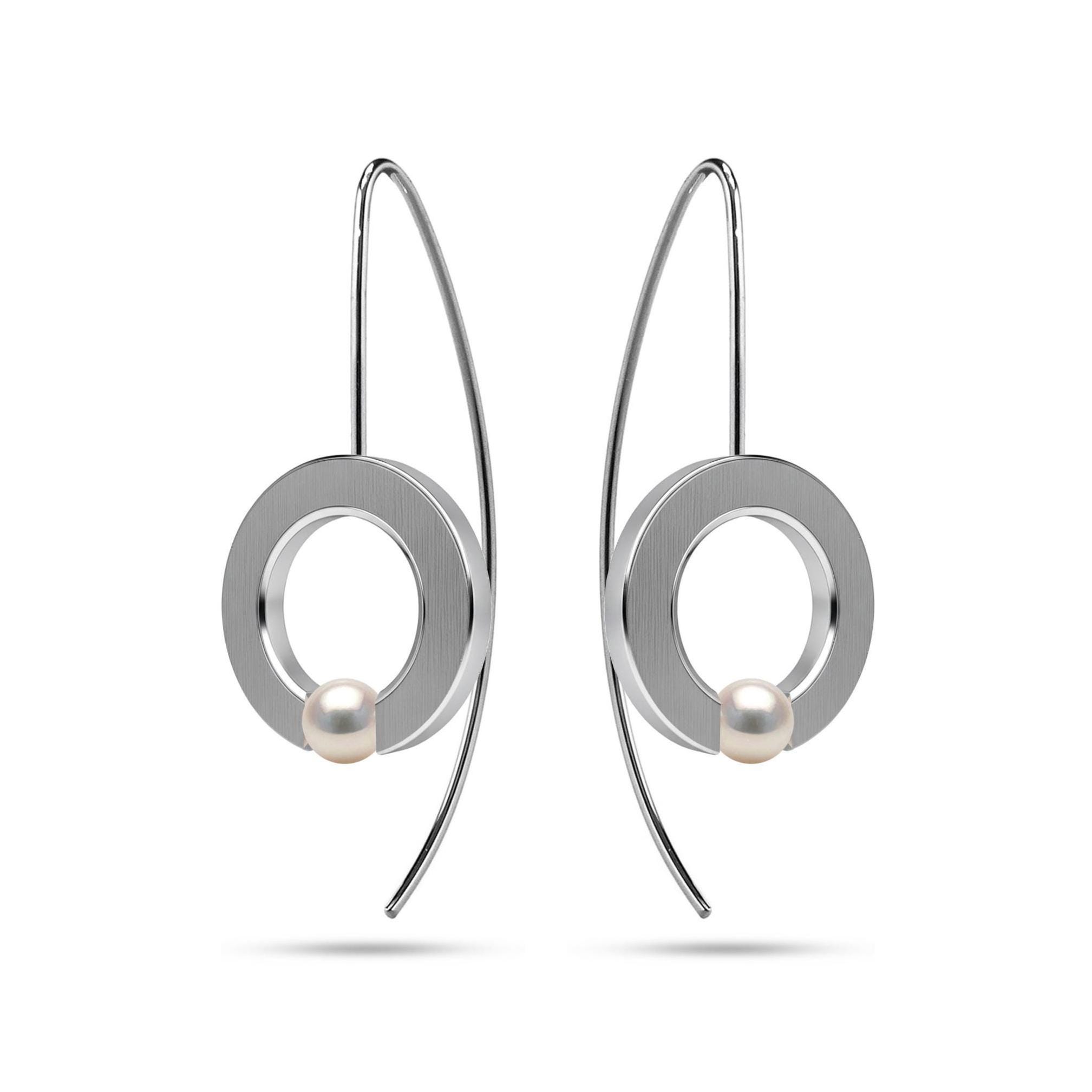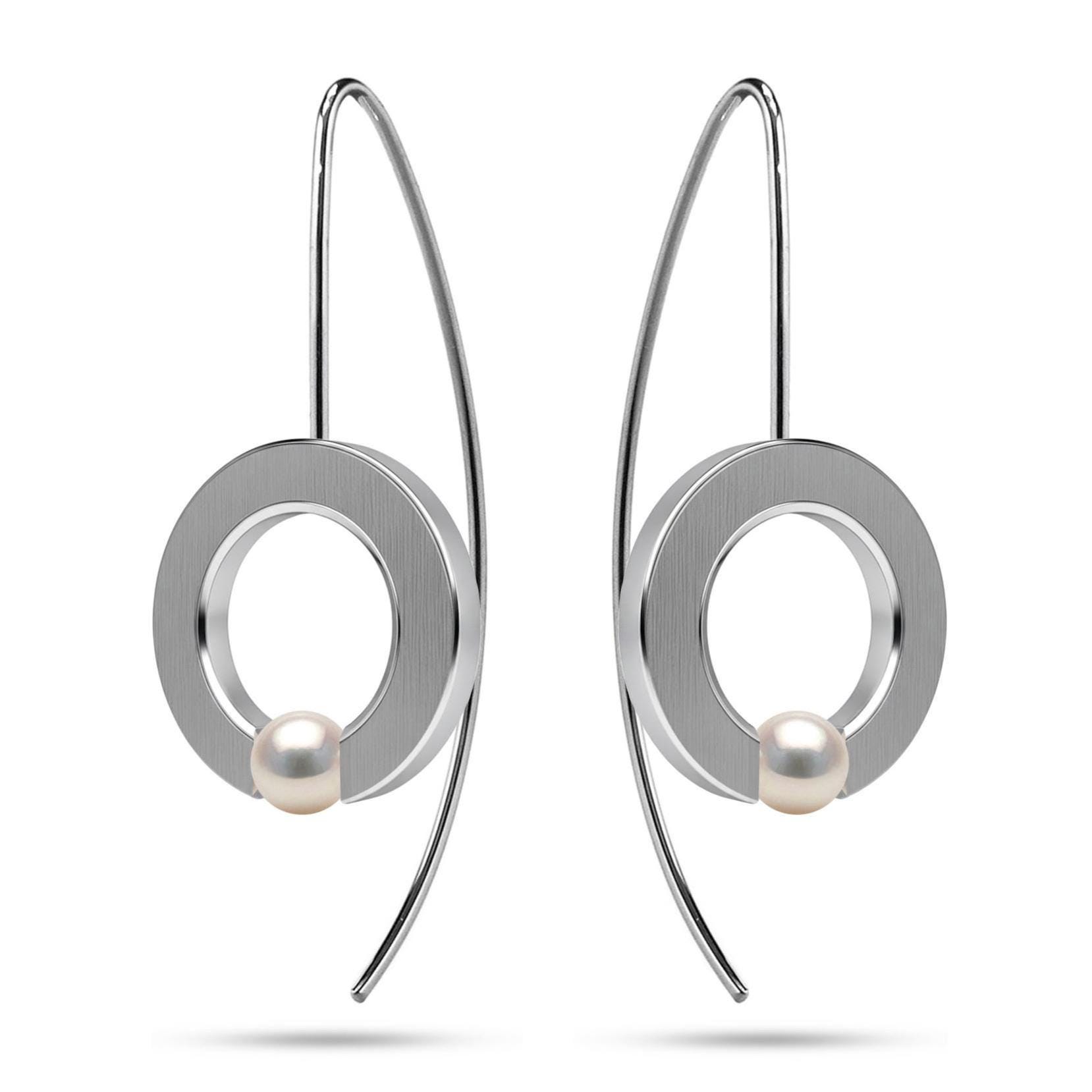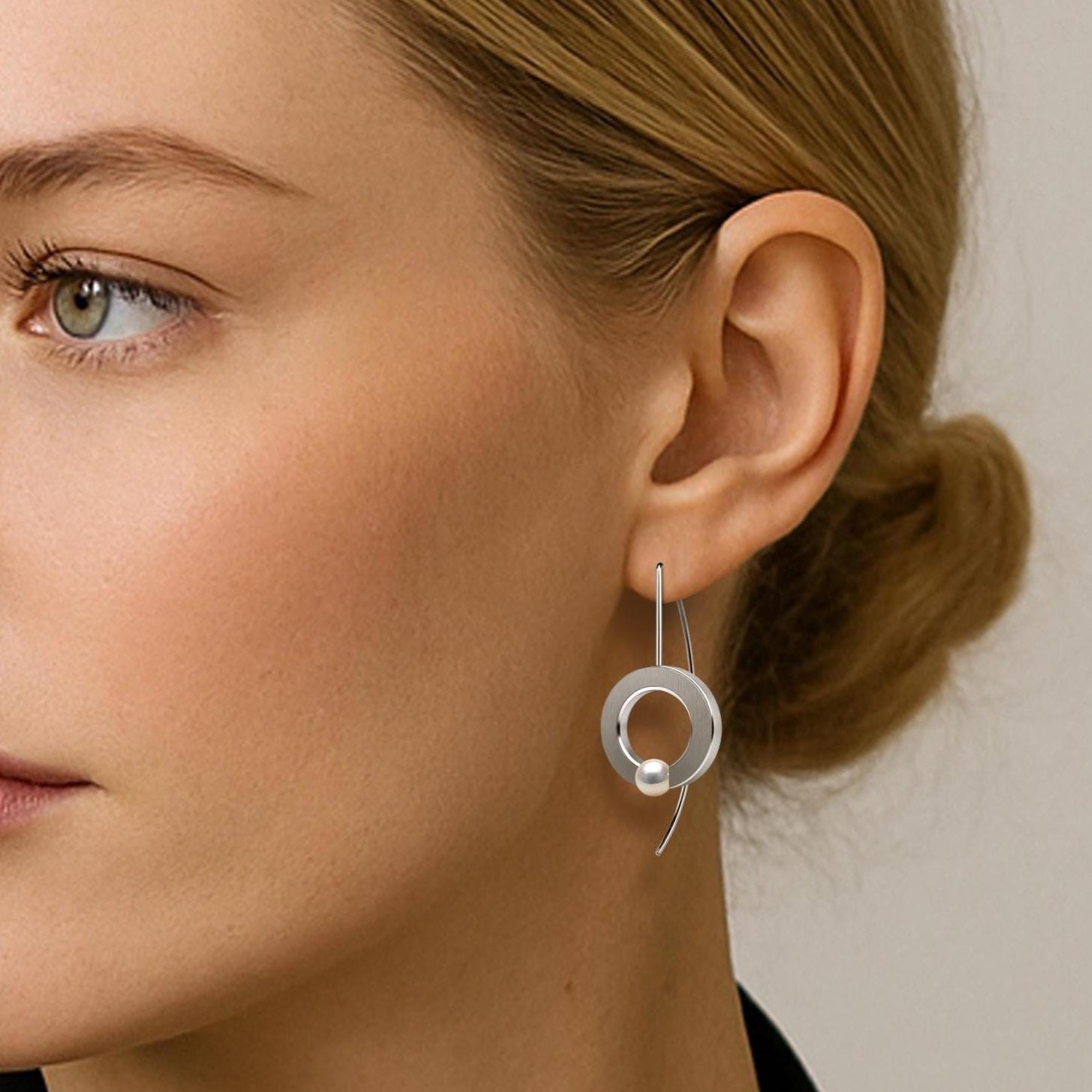 Discover the ABBRACCI flat round drop earrings by Taormina Jewelry, where Italian-inspired craftsmanship and minimalist elegance unite in perfect harmony. These sophisticated drop feature a precision tension‑set white cultured pearl—nestled seamlessly between sleek stainless steel flat circles, suspended from a slender ear wire. The front brushed finish captures and reflects light with a striking, radiant effect, while the outer rim offers a polished contrast for added depth.