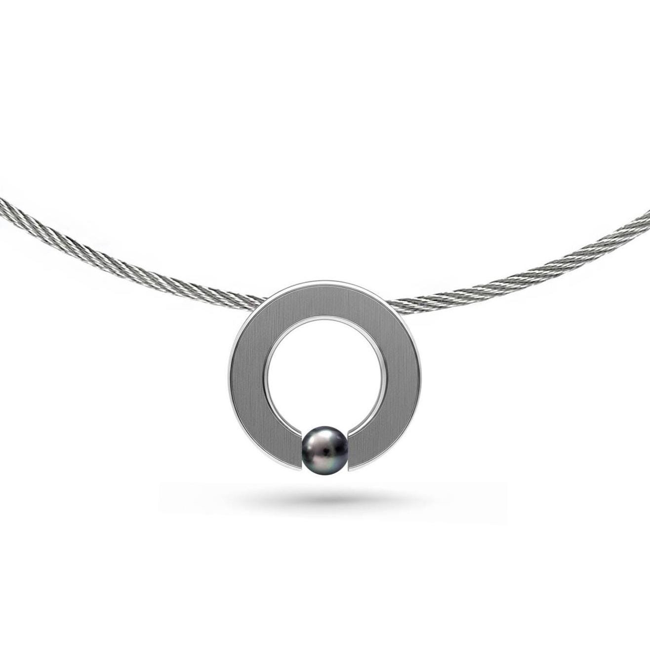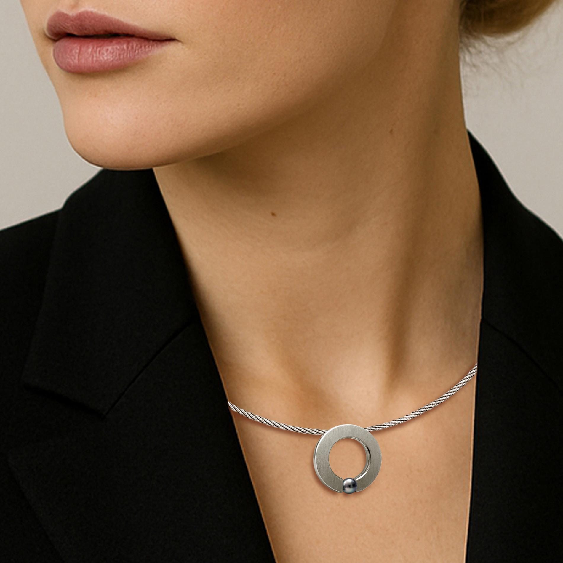 Radiant and refined, the Abbracci pendant captures the quiet poetry of the night sky. A cultured black pearl, tension-set within a brushed with polished edges stainless steel flat O-ring, glows at the heart of the design—an emblem of balance, purity, and enduring elegance.