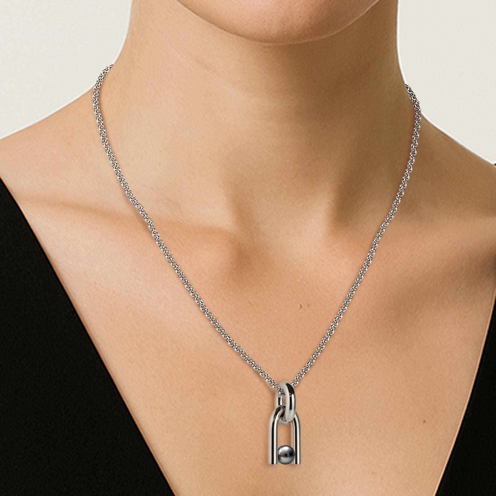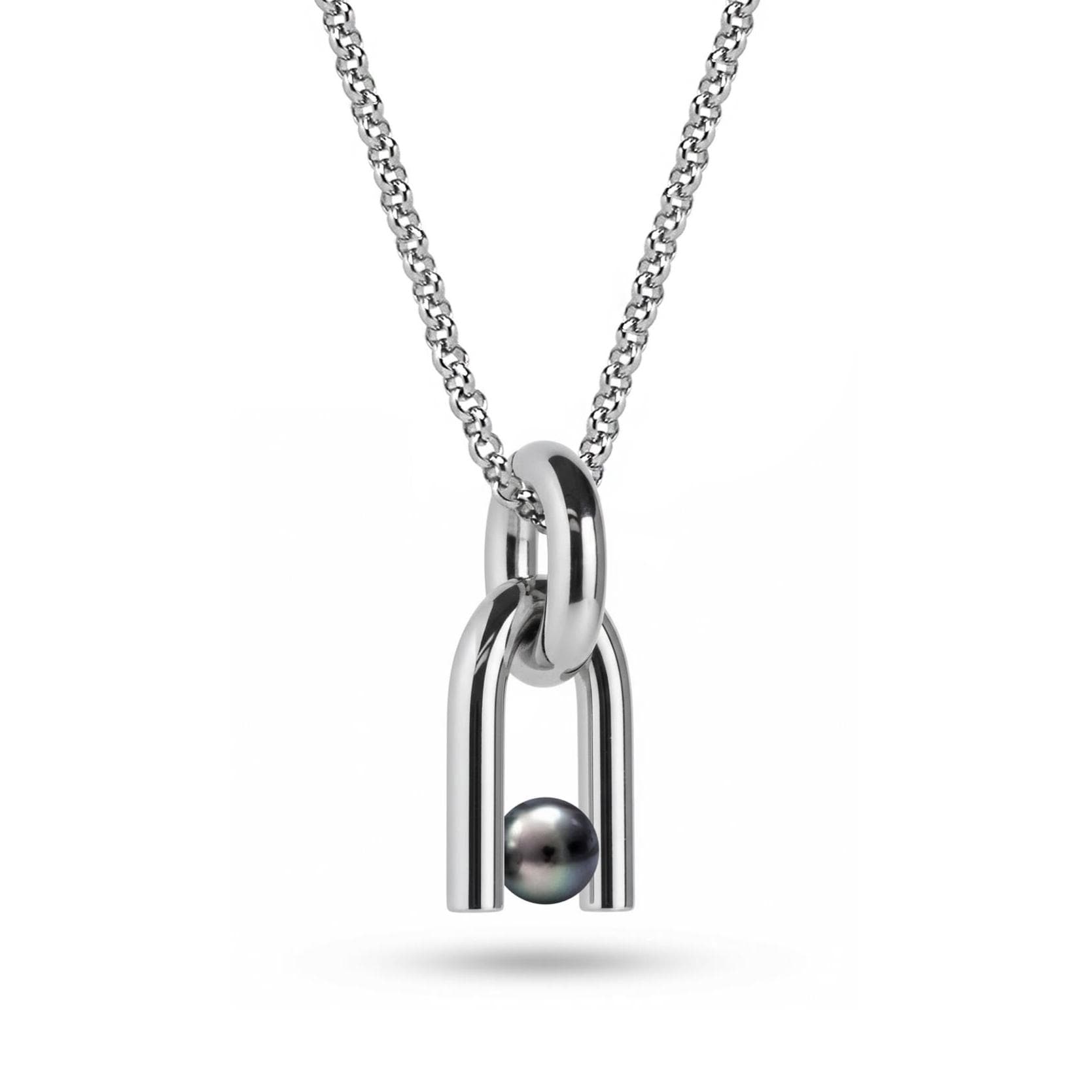 The Nexus Pendant is the embodiment of modern, architectural elegance. Crafted from durable, highly-polished stainless steel, this statement piece features a bold, interlocking design: a clean, symmetrical U-shaped structure embracing a Tension Set single, radiant, Cultured Black Pearl. This unique setting creates a captivating illusion of the stone floating mid-air, a testament to quality craftsmanship and clean lines.. The mirror-like finish and exceptional longevity align perfectly with a sophisticated, everyday aesthetic.