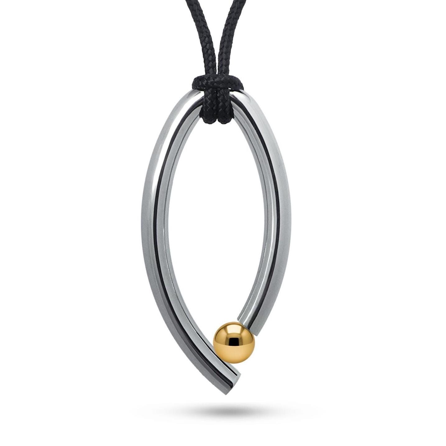 Introducing a minimalist yet bold piece from the OVUM Collection. This single oval pendant showcases a sleek, aerodynamic design with a beautiful polished finish on its metal surface. The striking centerpiece is a single, Gold Sphere, held securely and dramatically in a signature tension setting off-centered at the base of the oval. This setting allows light to pass through the stone from nearly every angle, maximizing its brilliance.