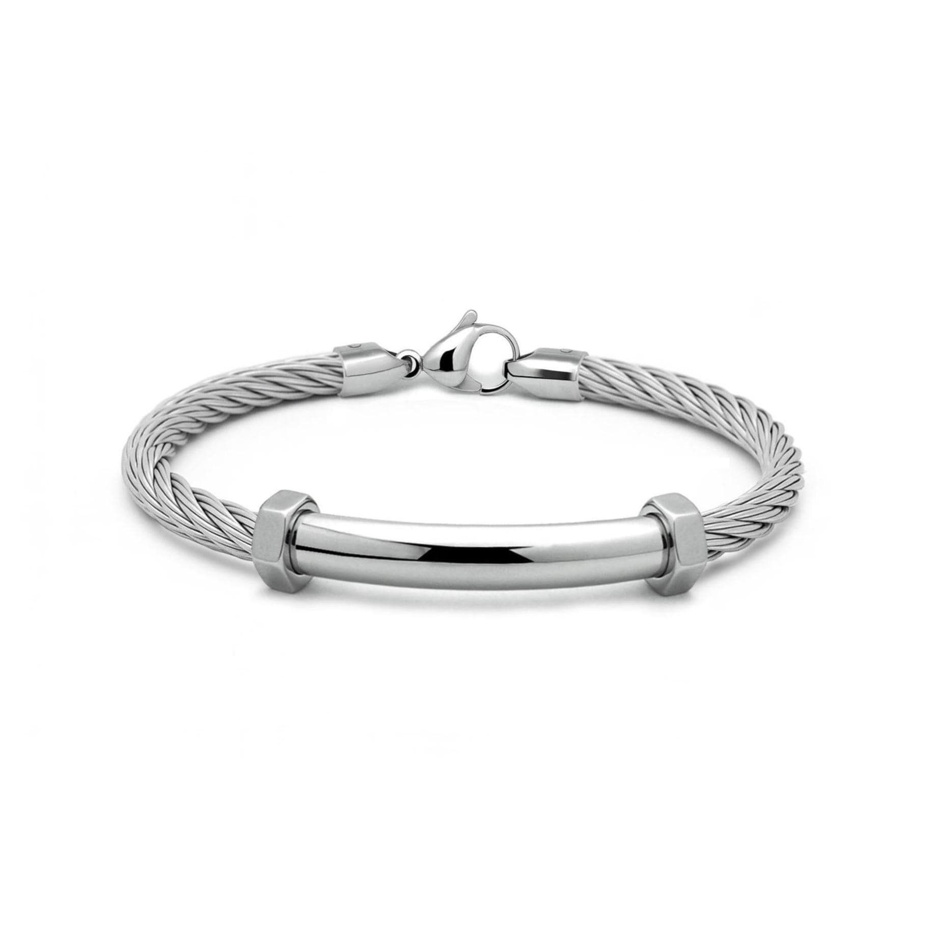 This 4mm Industrial wire twisted rope bracelet by Taormina Jewelry embodies refined industrial minimalism, featuring a polished curved tubular centerpiece flanked by two hex-nut accents for a bold, mechanical-inspired touch.