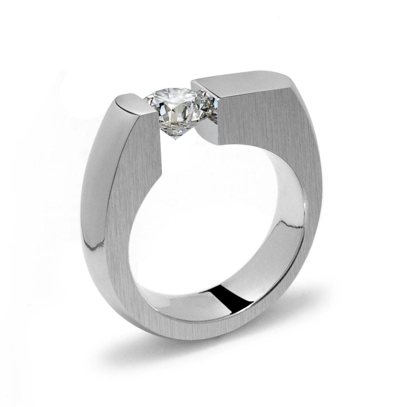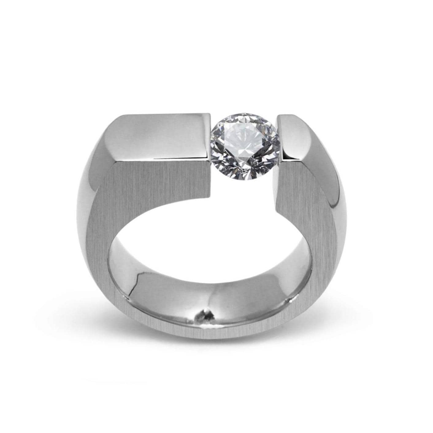 Handcrafted to order in hypoallergenic 316 stainless steel, this bold flat-top Colonna's ring features a sleek modern design with a single round white sapphire held in tension, set off-center for asymmetric appeal. The band offers a comfortable flat profile, approximately 6 mm wide tapering to 3mm at the sides, and comes in either fully polished or a polished & brushed finish. The tension-mounted stone measures about 6mm, and the ring is ideal as a statement piece for any finger—especially the pinky.