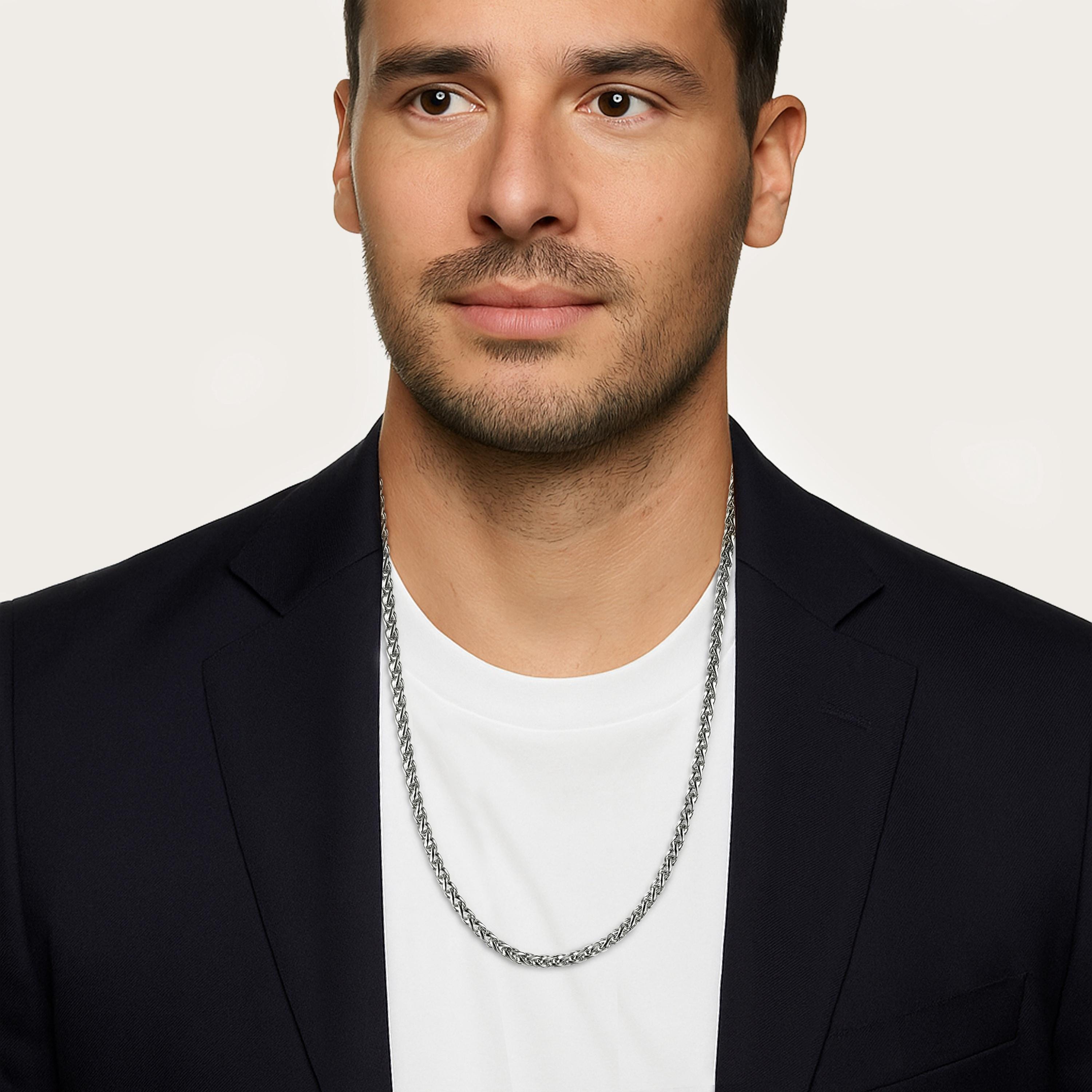 Experience the perfect fusion of classic design and modern durability with this 4mm Wheat Link Chain Necklace. Meticulously crafted by artisans and inspired by original motifs, this piece is an effortless statement of quality.