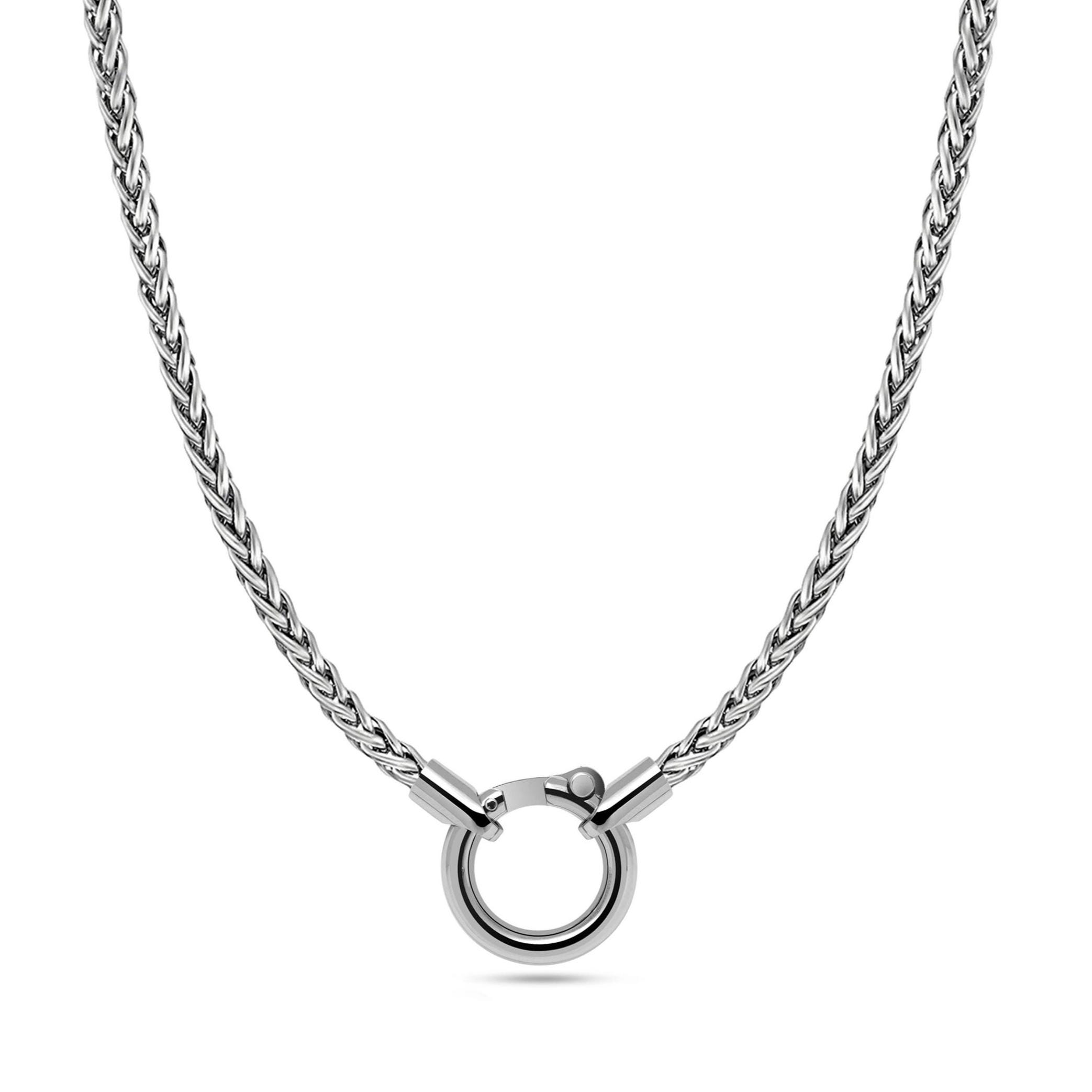 Sleek, bold, and contemporary — this unisex wheat chain necklace is crafted in high-polish stainless steel for a clean, modern look that suits any style. The standout feature is the circular clasp, designed not only for secure closure but also for functionality: it opens effortlessly, allowing you to add your favorite pendants or charms. Minimal yet expressive, this necklace can be worn alone for a refined statement or customized with personal touches. Perfect for both men and women who appreciate understated luxury and versatility in their jewelry.