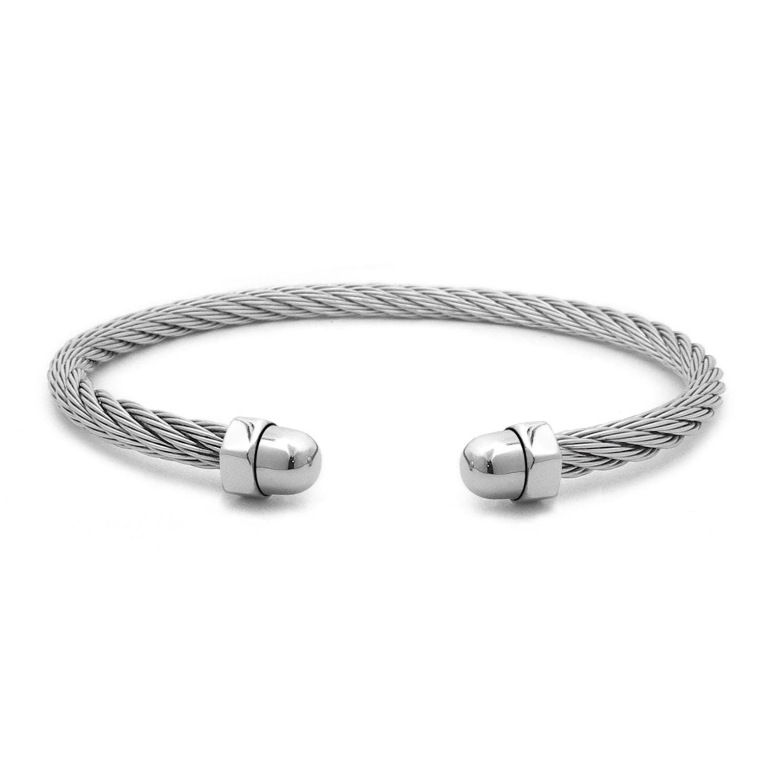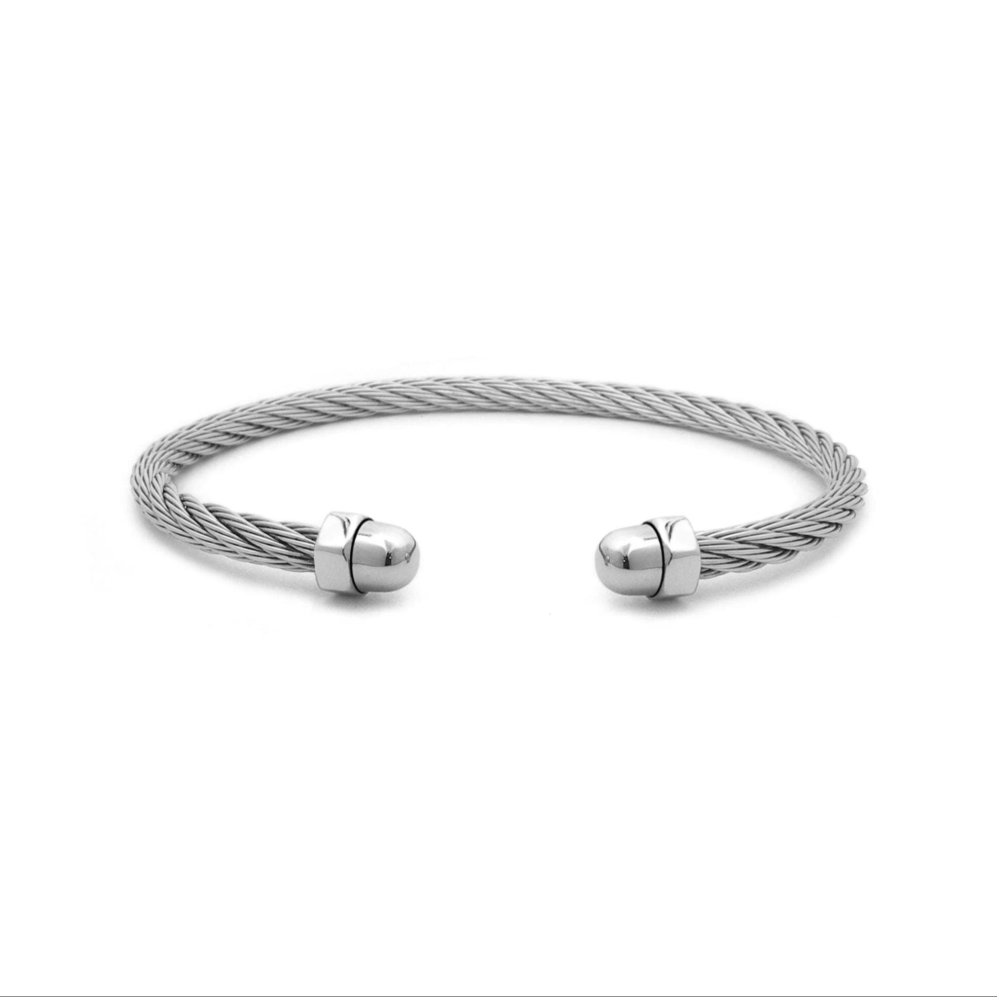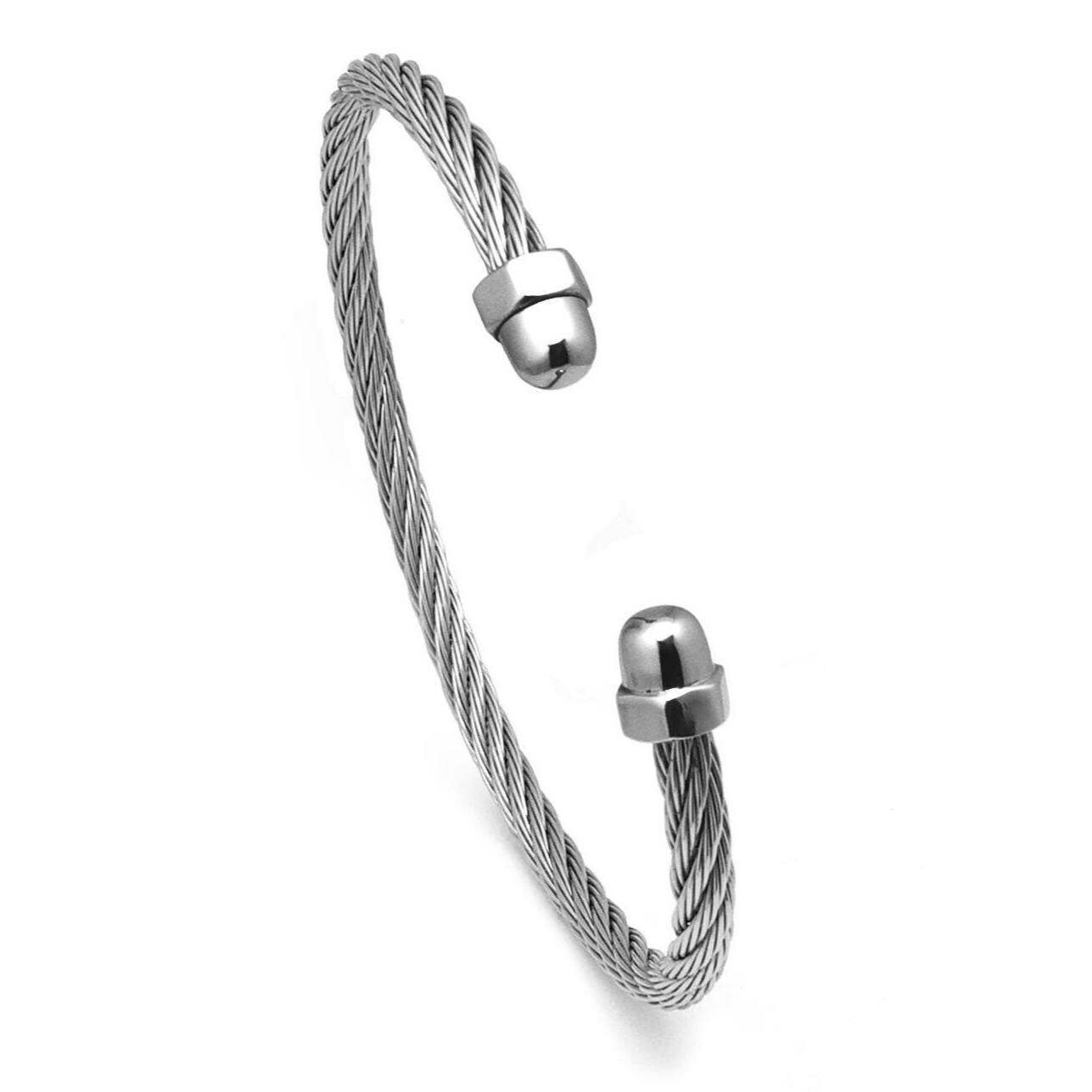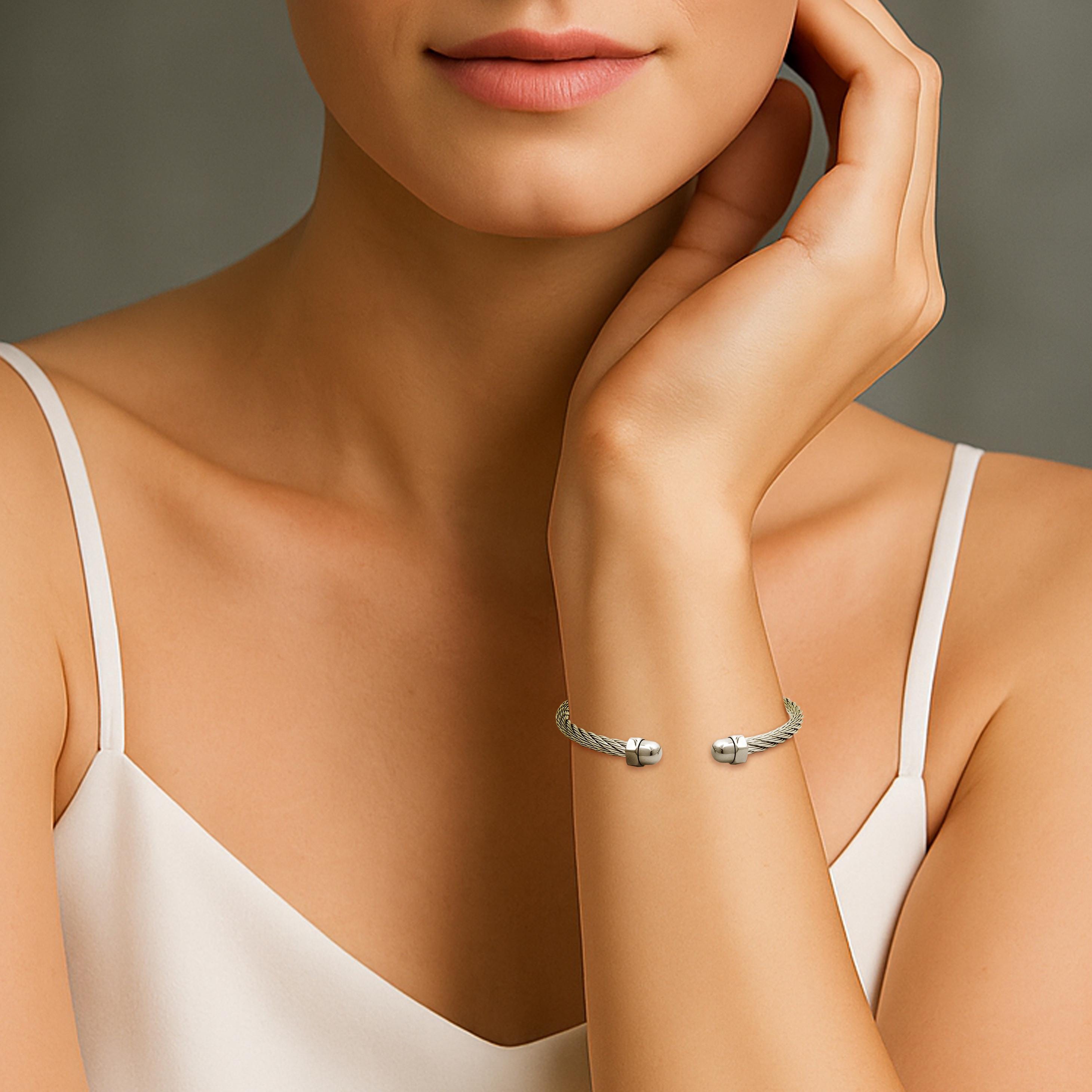 Engineered for minimalist sophistication, this open cuff bracelet features a clean, clasp-free silhouette made entirely from high-tensile flexible stainless steel cable ending with two hex-nut accents for a bold, mechanical-inspired touch. The open-ended design ensures a seamless look while offering exceptional flexibility and security through natural cable tension — no moving parts, no closures, just effortless functionality.