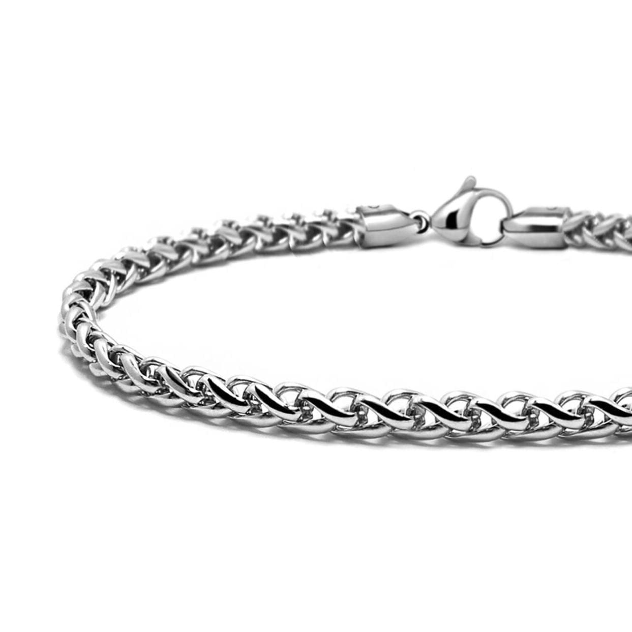 Crafted from stainless steel, this Wheat chain bracelet is durable, resistant to tarnish, and has a sleek, polished silver-tone finish. The wheat chain, also known as a Spiga chain, is formed by four strands of oval links braided and intertwined, giving it a distinctive, textured look reminiscent of a stalk of wheat.