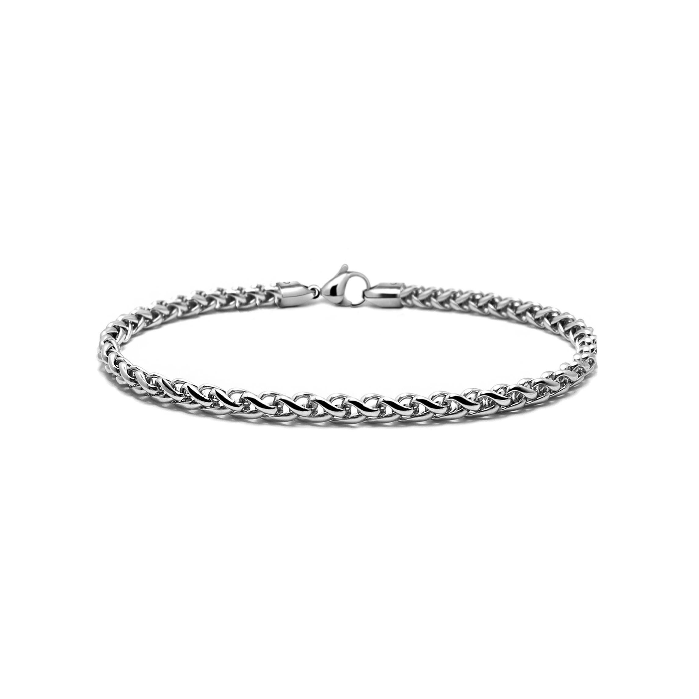 Crafted from stainless steel, this Wheat chain bracelet is durable, resistant to tarnish, and has a sleek, polished silver-tone finish. The wheat chain, also known as a Spiga chain, is formed by four strands of oval links braided and intertwined, giving it a distinctive, textured look reminiscent of a stalk of wheat.