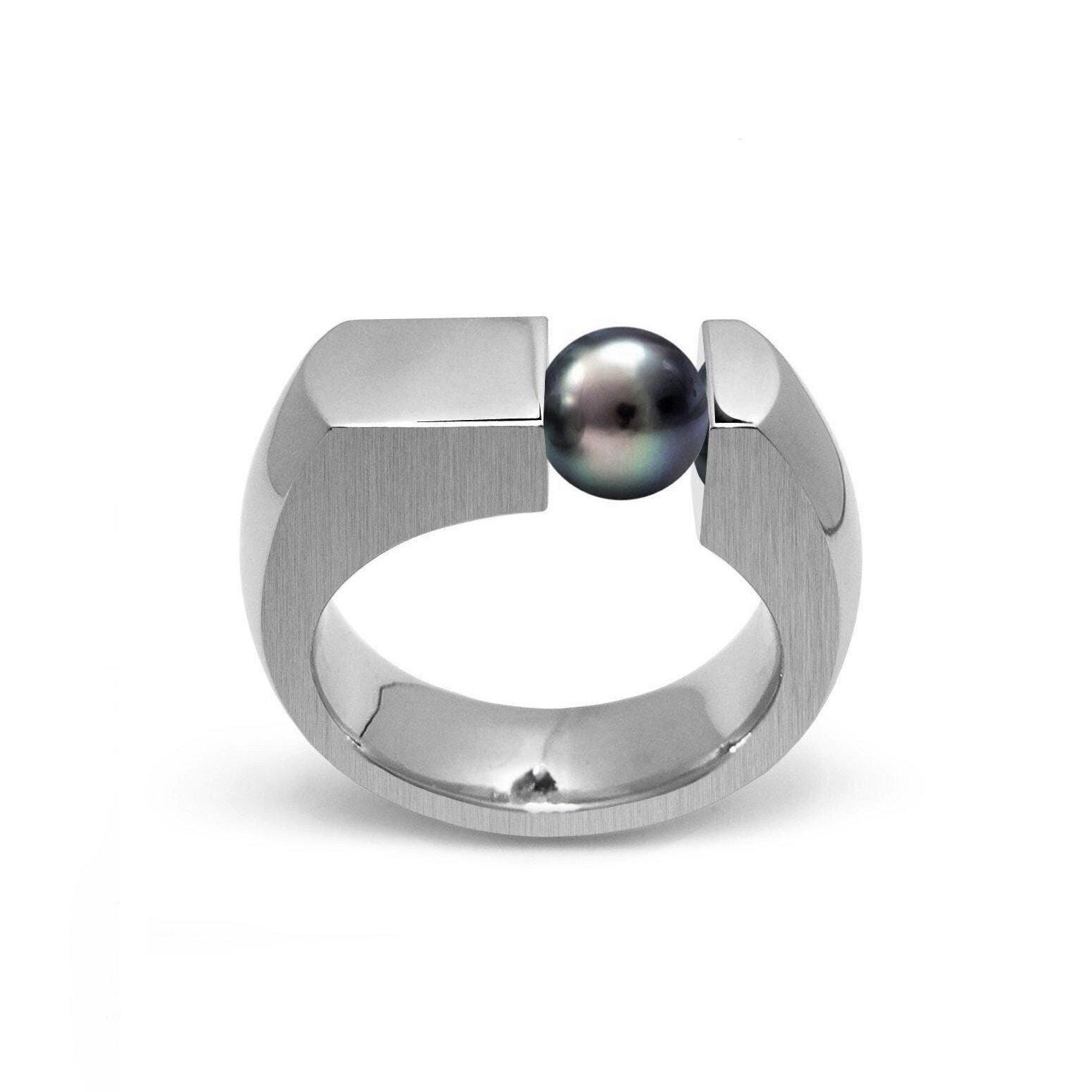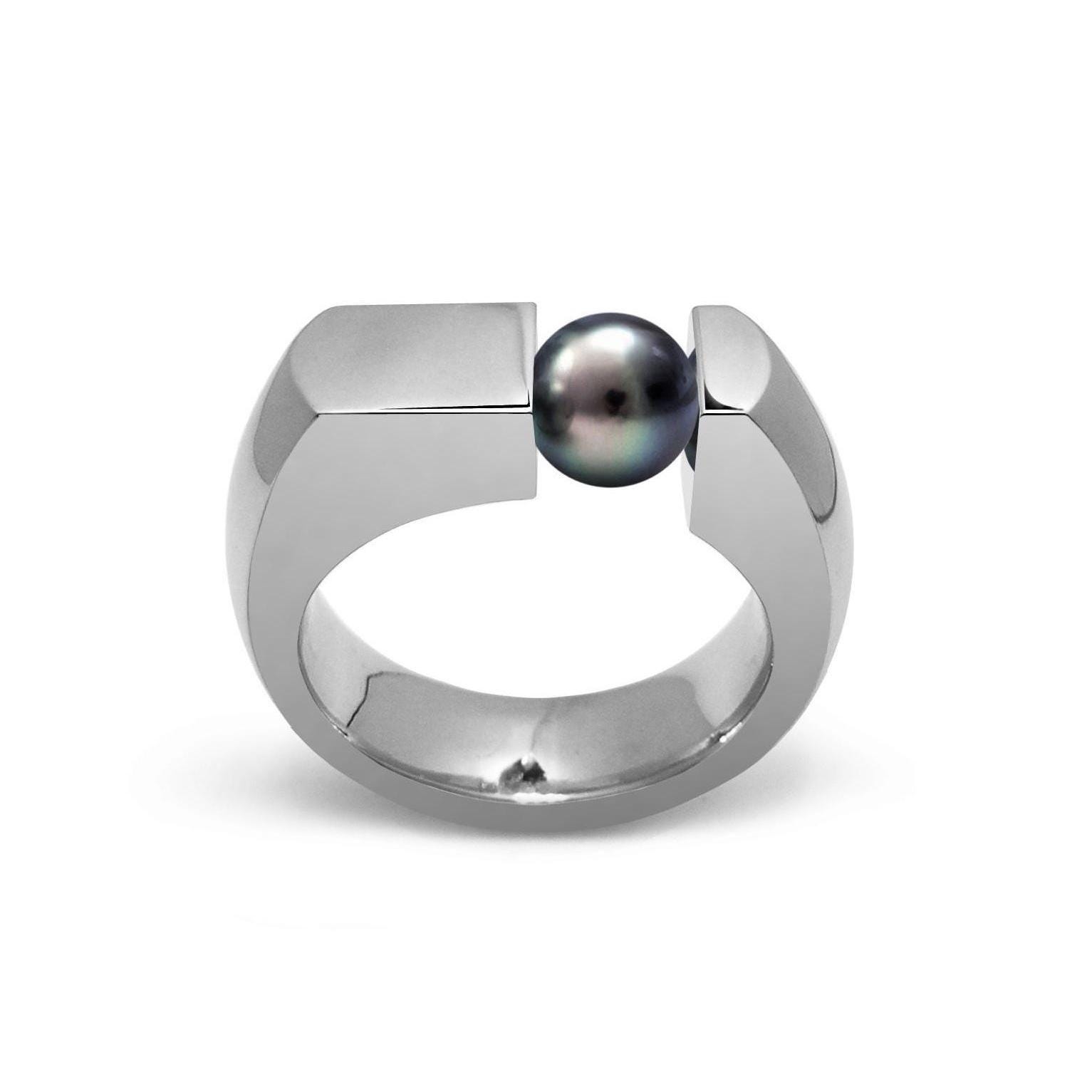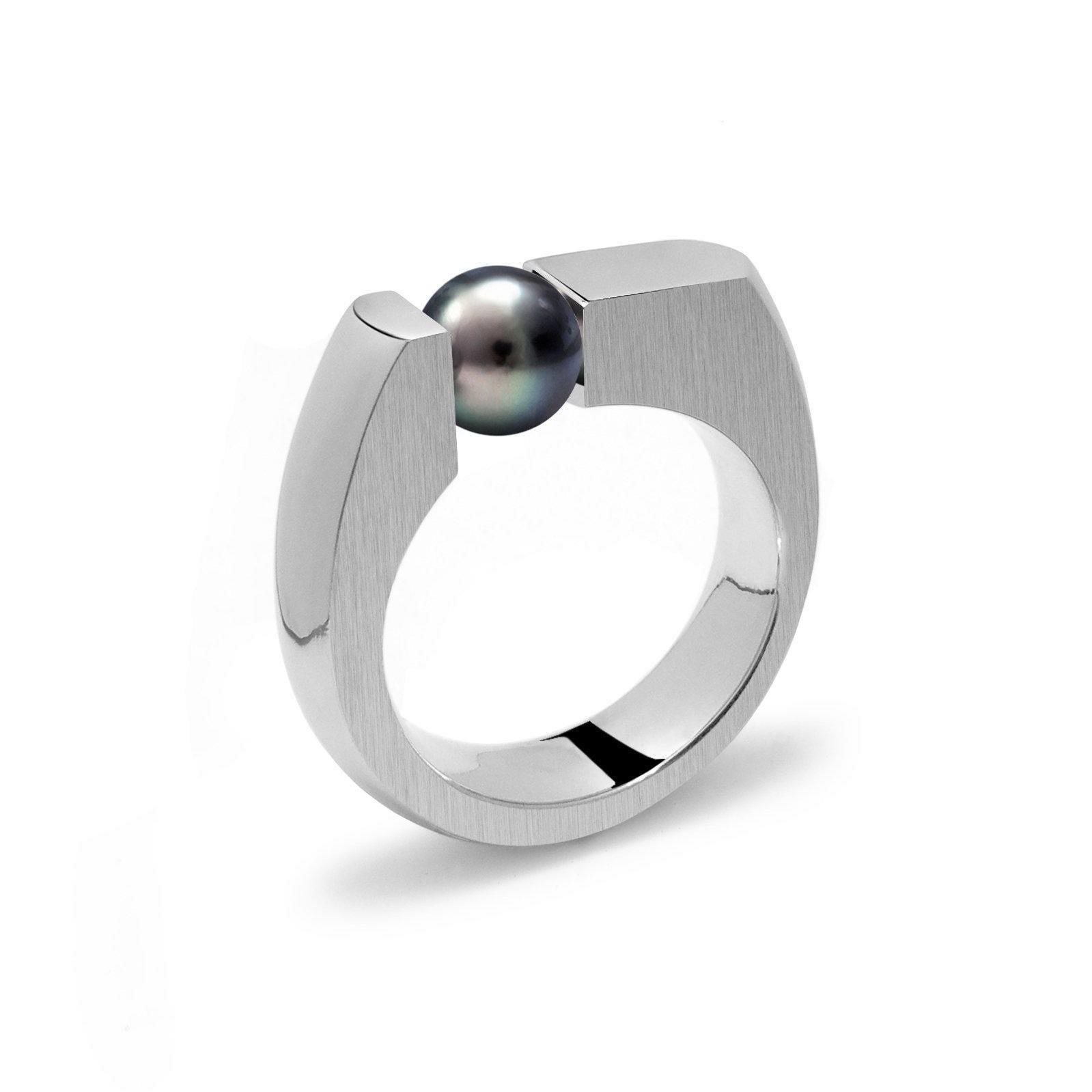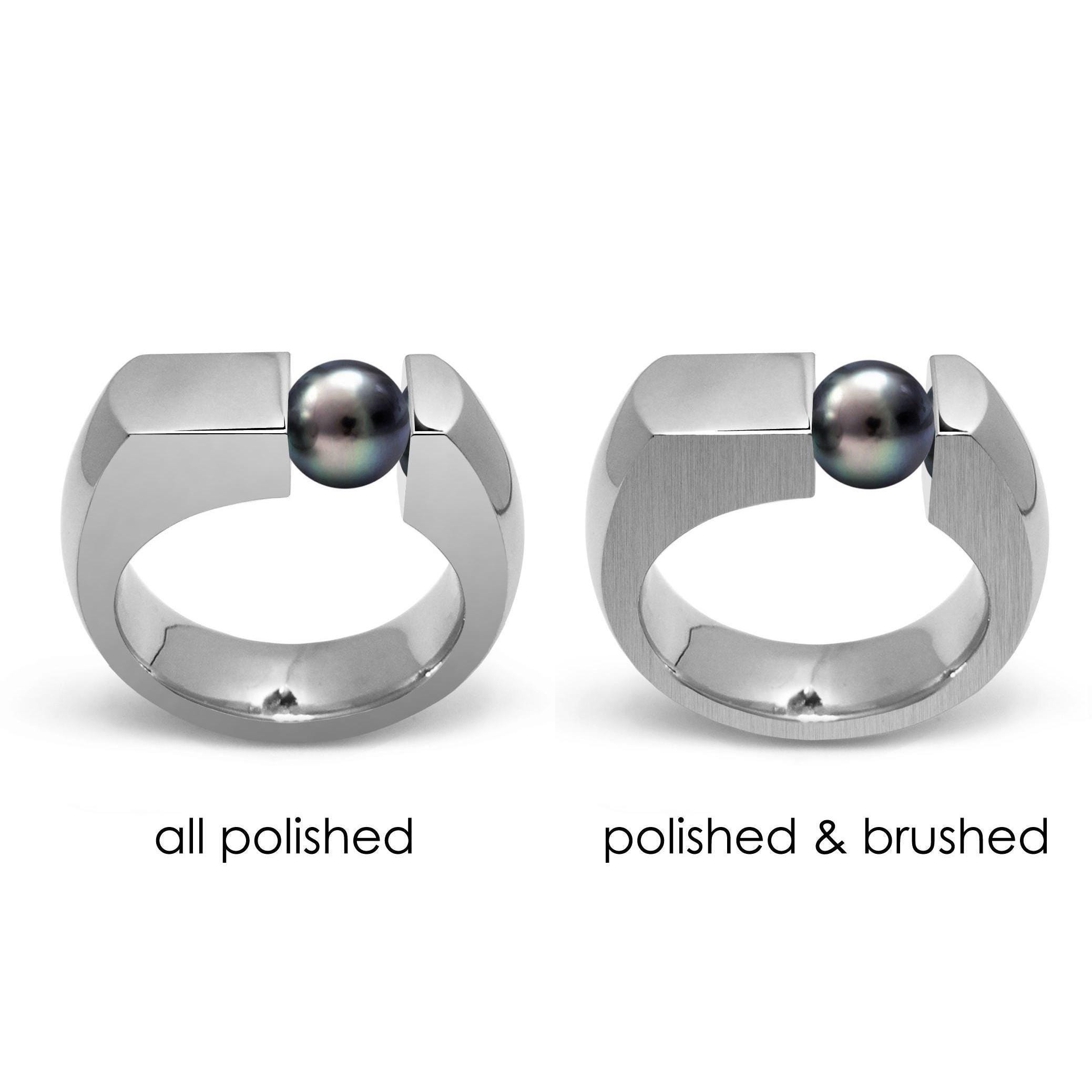 Handcrafted to order in hypoallergenic 316 stainless steel, this bold flat-top Colonna's ring features a sleek modern design with a single round natural black pearl held in tension, set off-center for asymmetric appeal. The band offers a comfortable flat profile, approximately 6mm wide tapering to 3mm at the sides, and comes in either fully polished or a polished & brushed finish. The tension-mounted pearl measures about 7mm, and the ring is ideal as a statement piece for any finger—especially the pinky. Perfectly balanced between strength and elegance.