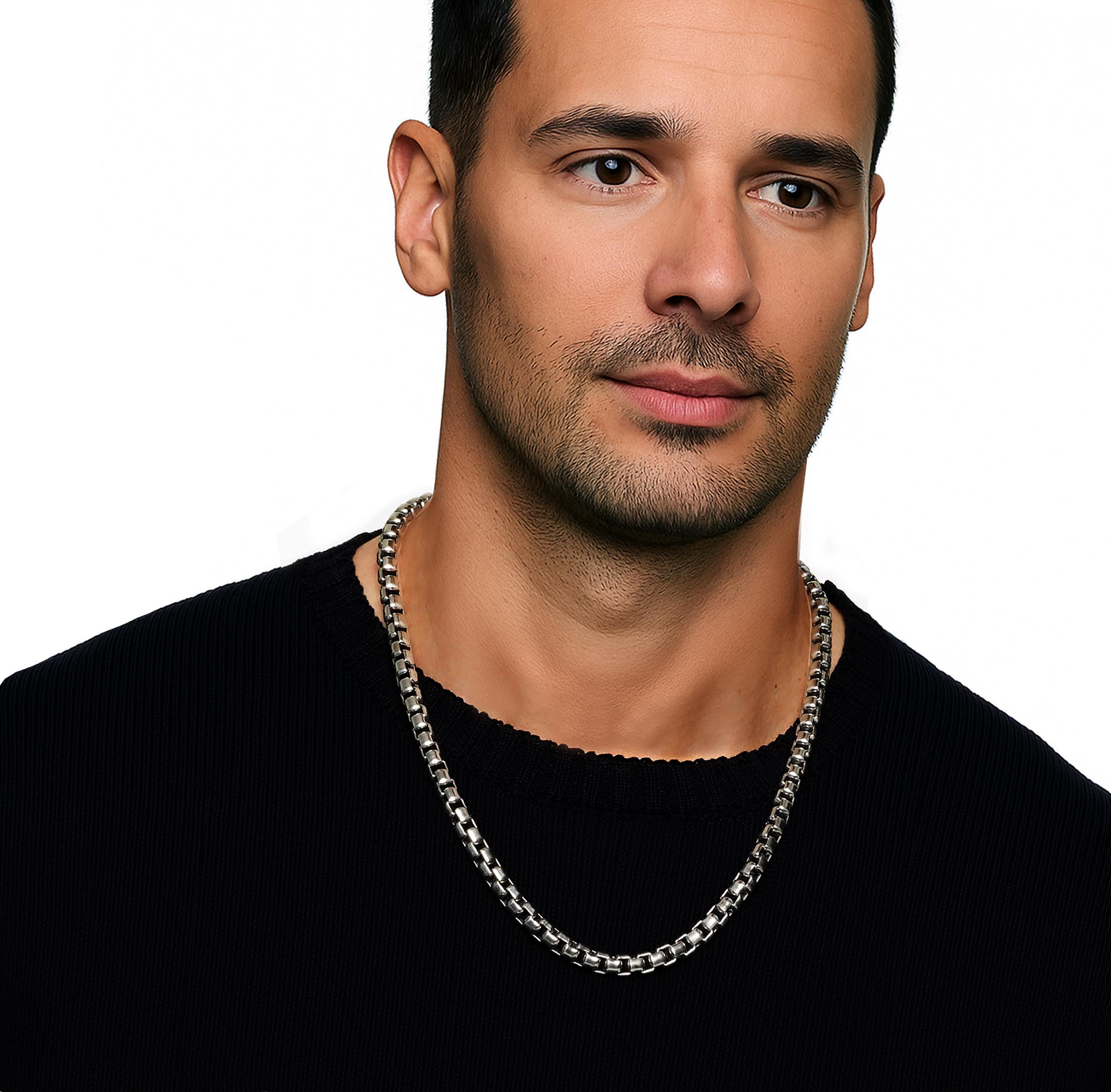 Trendy 6mm box link chain necklace, crafted in high polished stainless steel. Our chains are inspired by classical and original motifs, and are meticulously crafted by artisans, with an high precision lobster clasp riveted directly into the chain, making it virtually unbreakable.