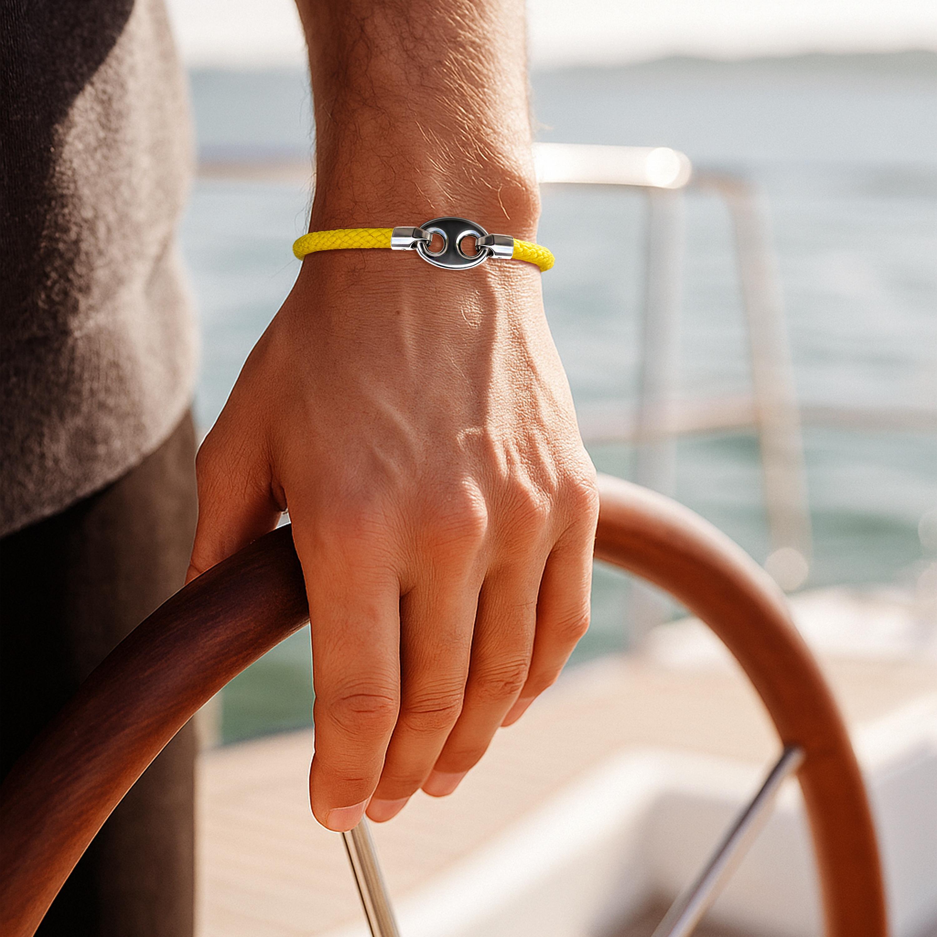 Bold and sunlit like summer itself, this bracelet features a vibrant yellow nautical cord, braided for durability and texture. At the center, a polished stainless steel link—reminiscent of an anchor chain—evokes the timeless strength of maritime tradition.
