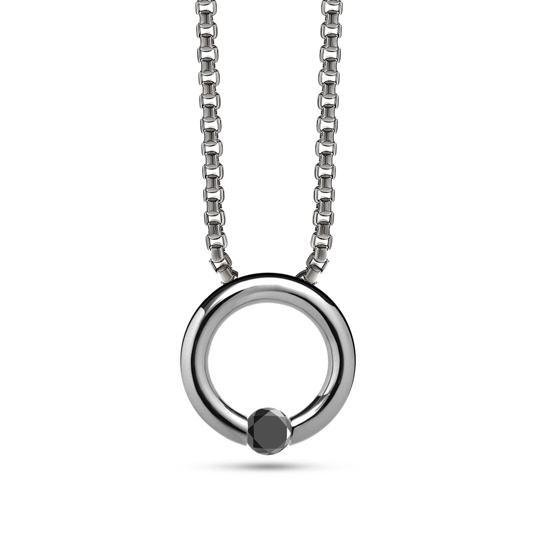 Tubular ring pendant with tension set Black Diamond. The gemstone rests between the ring ends in center position hanging by slender textile cord: surrounded by light, it shows off its full glowing beauty.