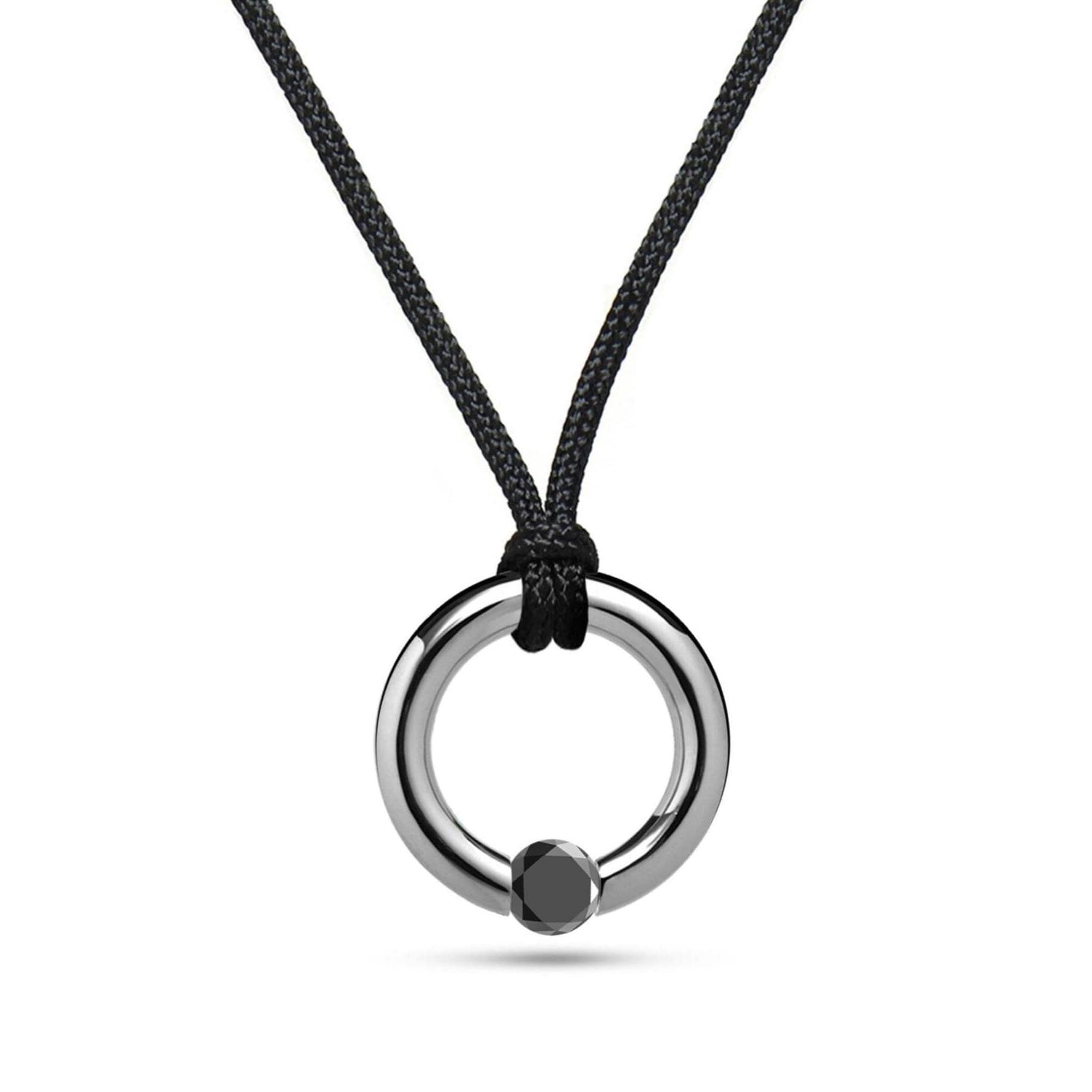 Minimalist yet expressive. This circular pendant is crafted from high-polish stainless steel and features a tension-set black diamond suspended seamlessly within its form — no soldering, no visible joints, only clean engineering. It hangs from a smooth, black nylon cord that adds a refined, lightweight touch and casual versatility. Sleek, unisex, and understated, this piece adapts effortlessly from daywear to evening simplicity.
