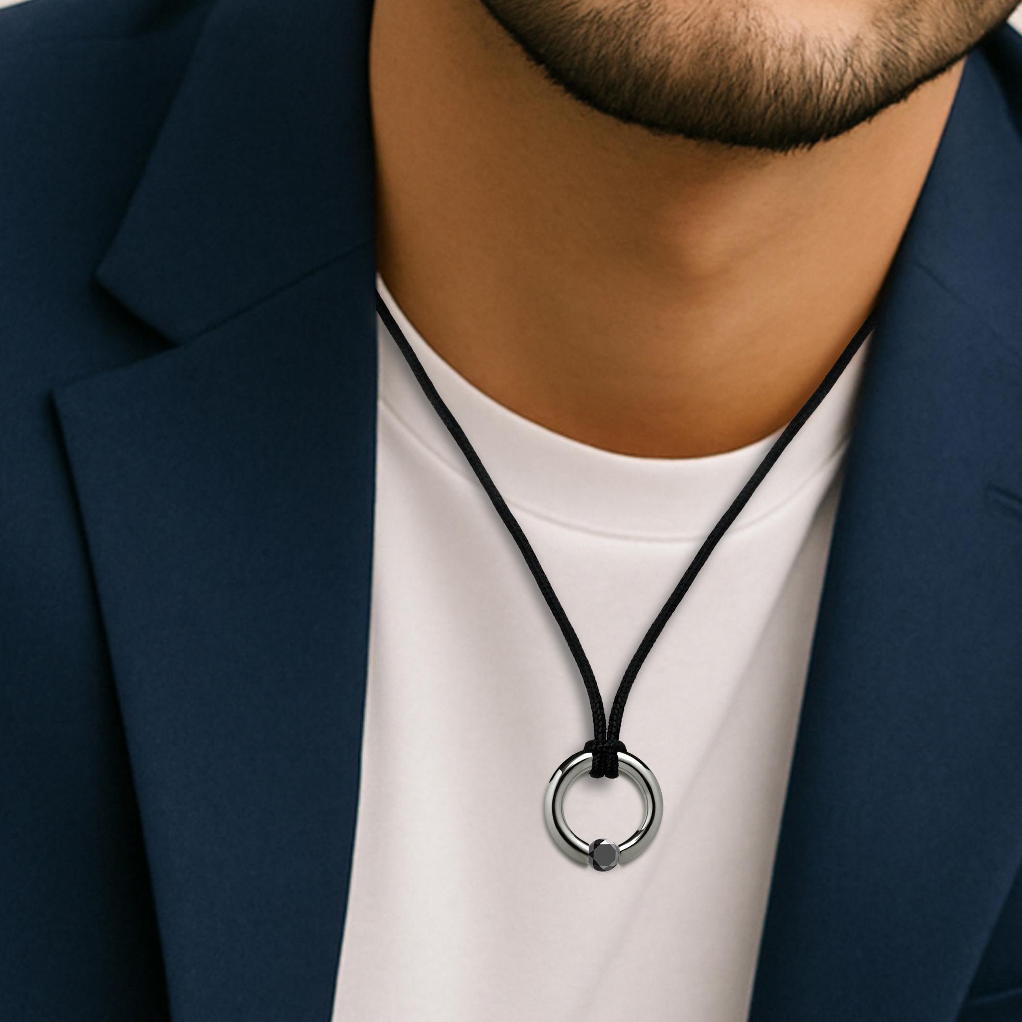 Minimalist yet expressive. This circular pendant is crafted from high-polish stainless steel and features a tension-set black diamond suspended seamlessly within its form — no soldering, no visible joints, only clean engineering. It hangs from a smooth, black nylon cord that adds a refined, lightweight touch and casual versatility. Sleek, unisex, and understated, this piece adapts effortlessly from daywear to evening simplicity.