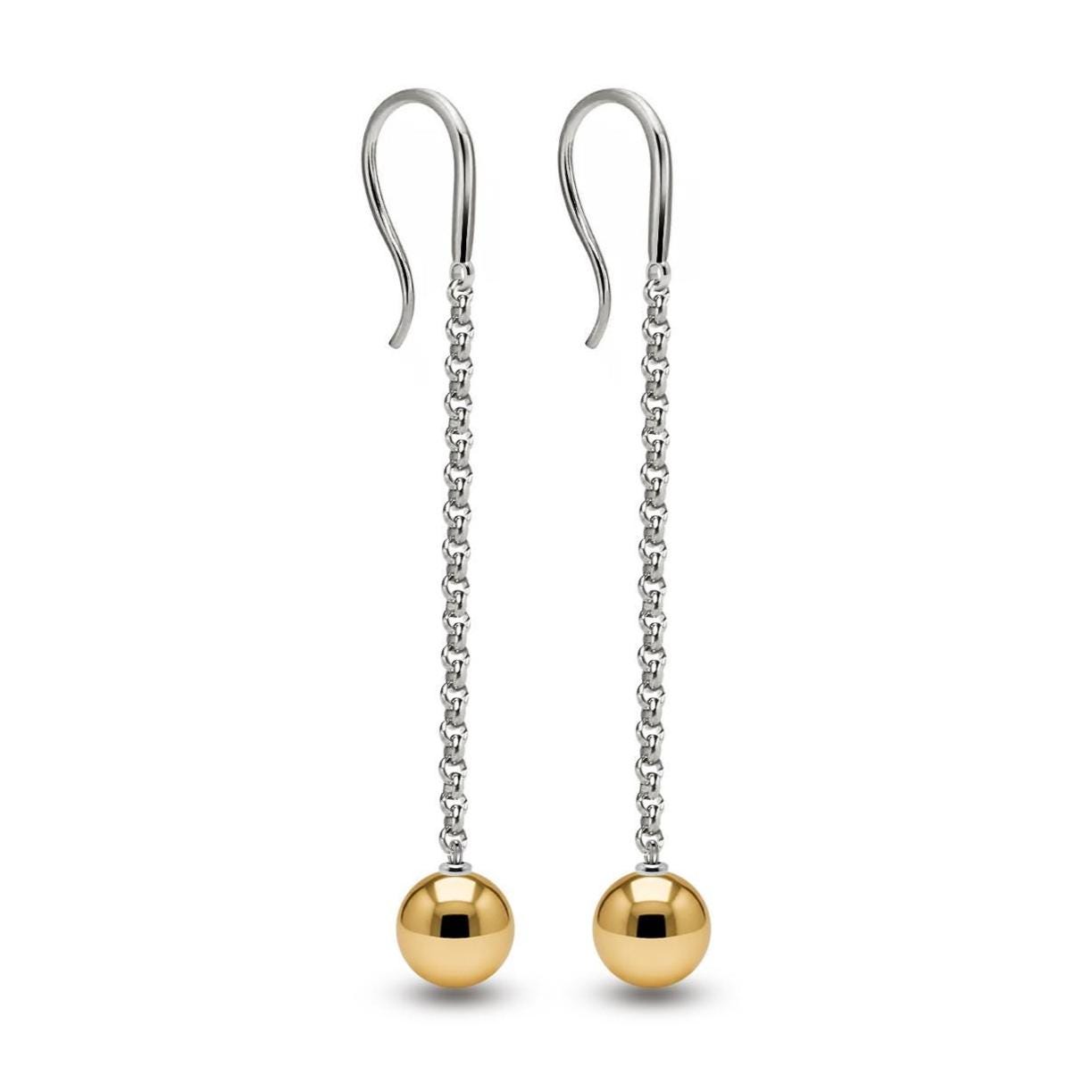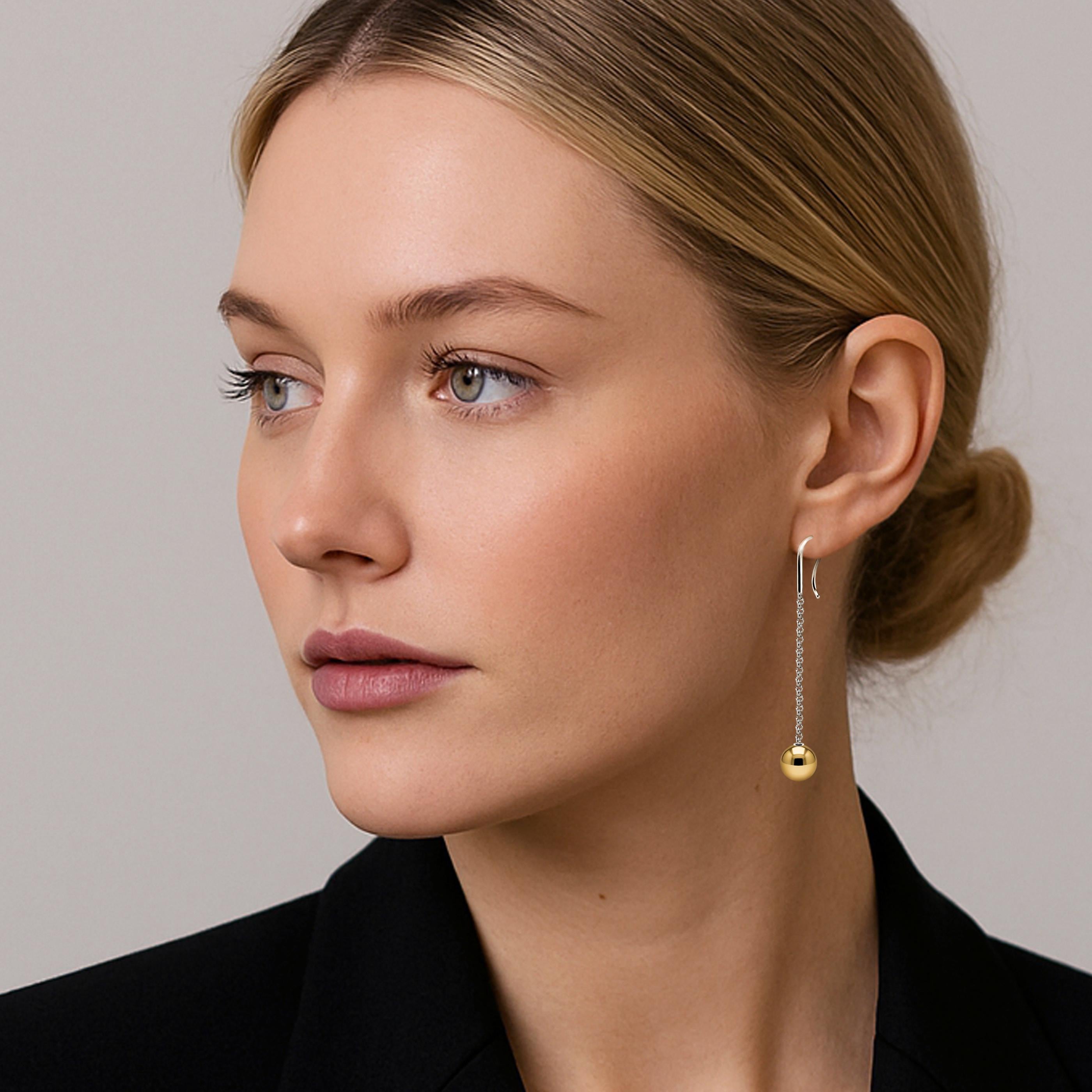 Refined and contemporary, these minimalist drop earrings feature a sleek stainless steel chain and hook, paired with a polished gold sphere. The sphere is securely fixed at the base, adding a bold yet elegant statement to your look. A perfect balance of clean design and distinctive charm—crafted for those who appreciate subtle luxury and timeless style.