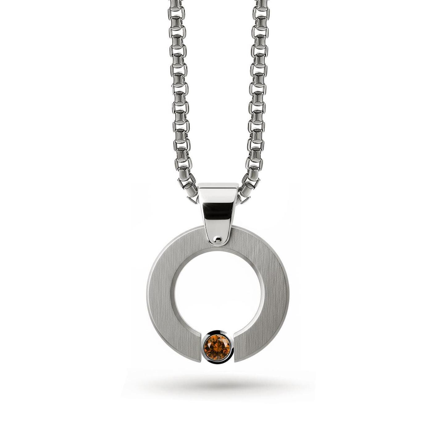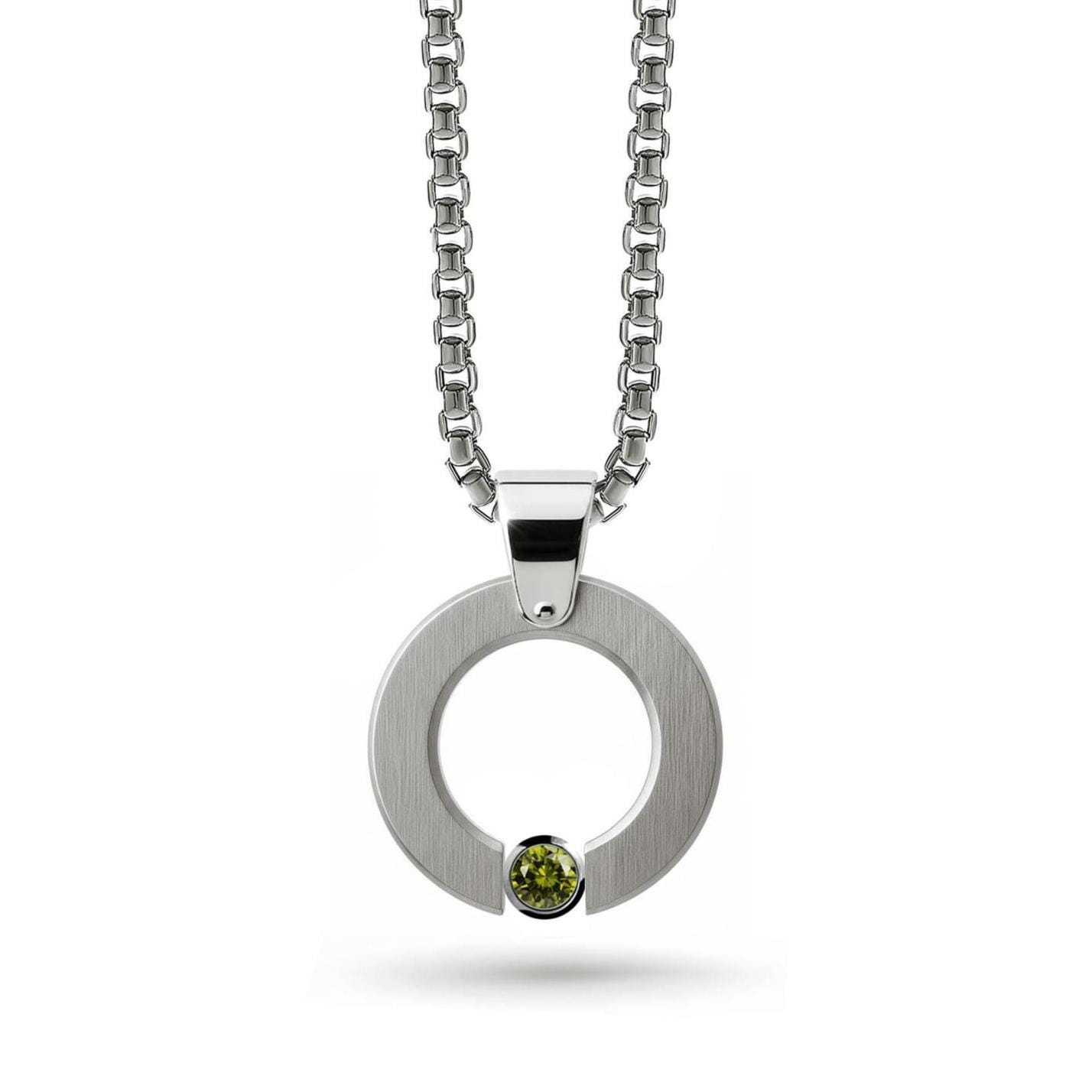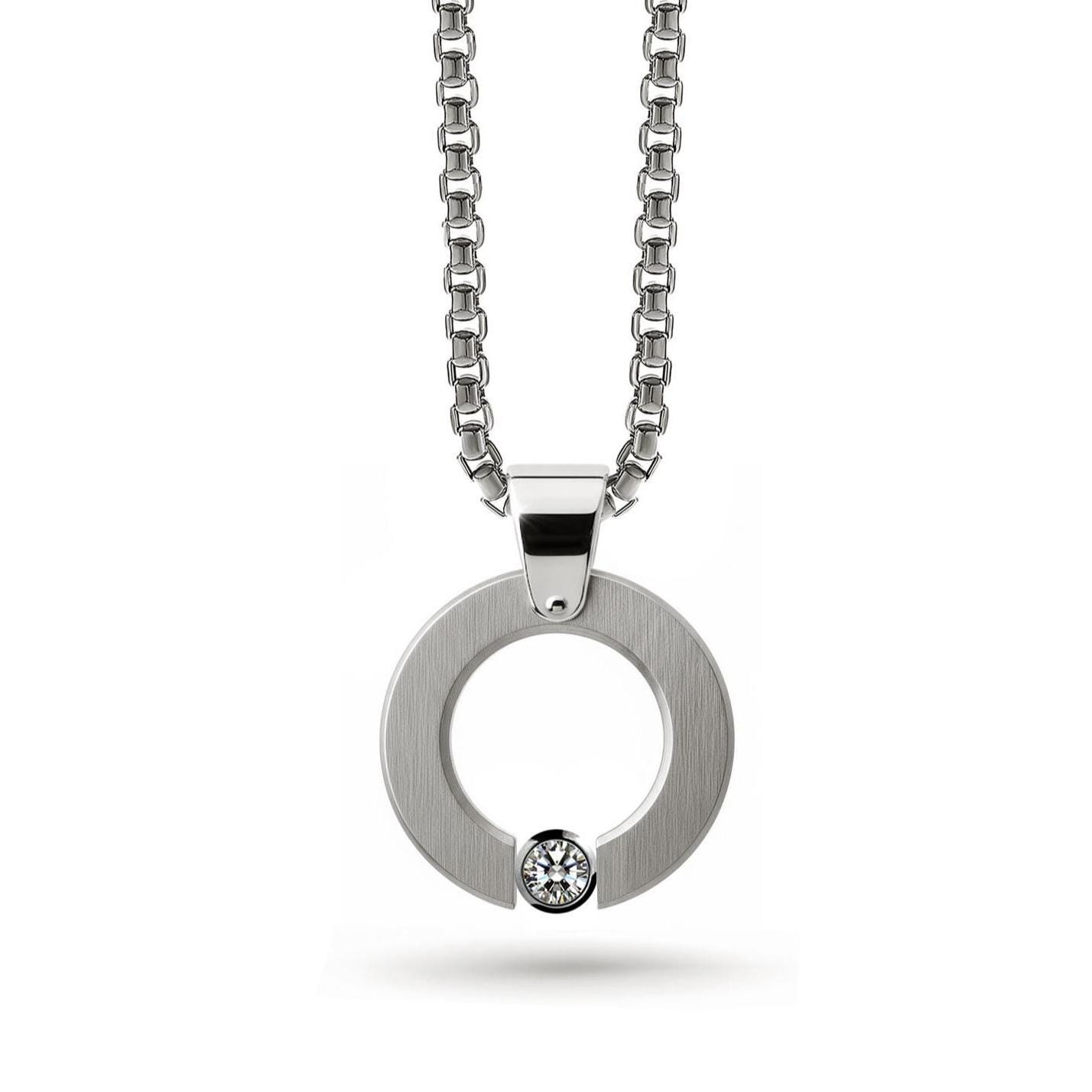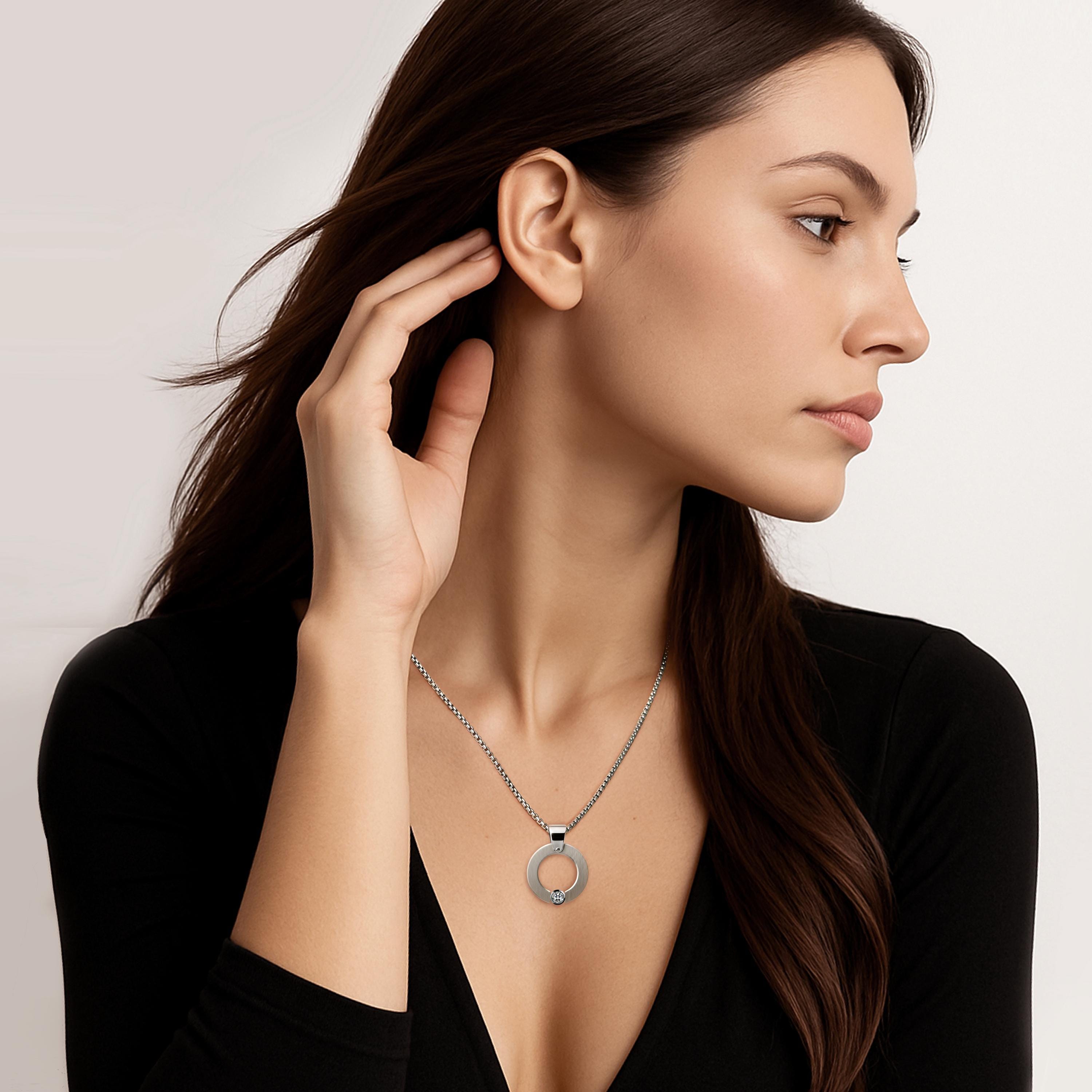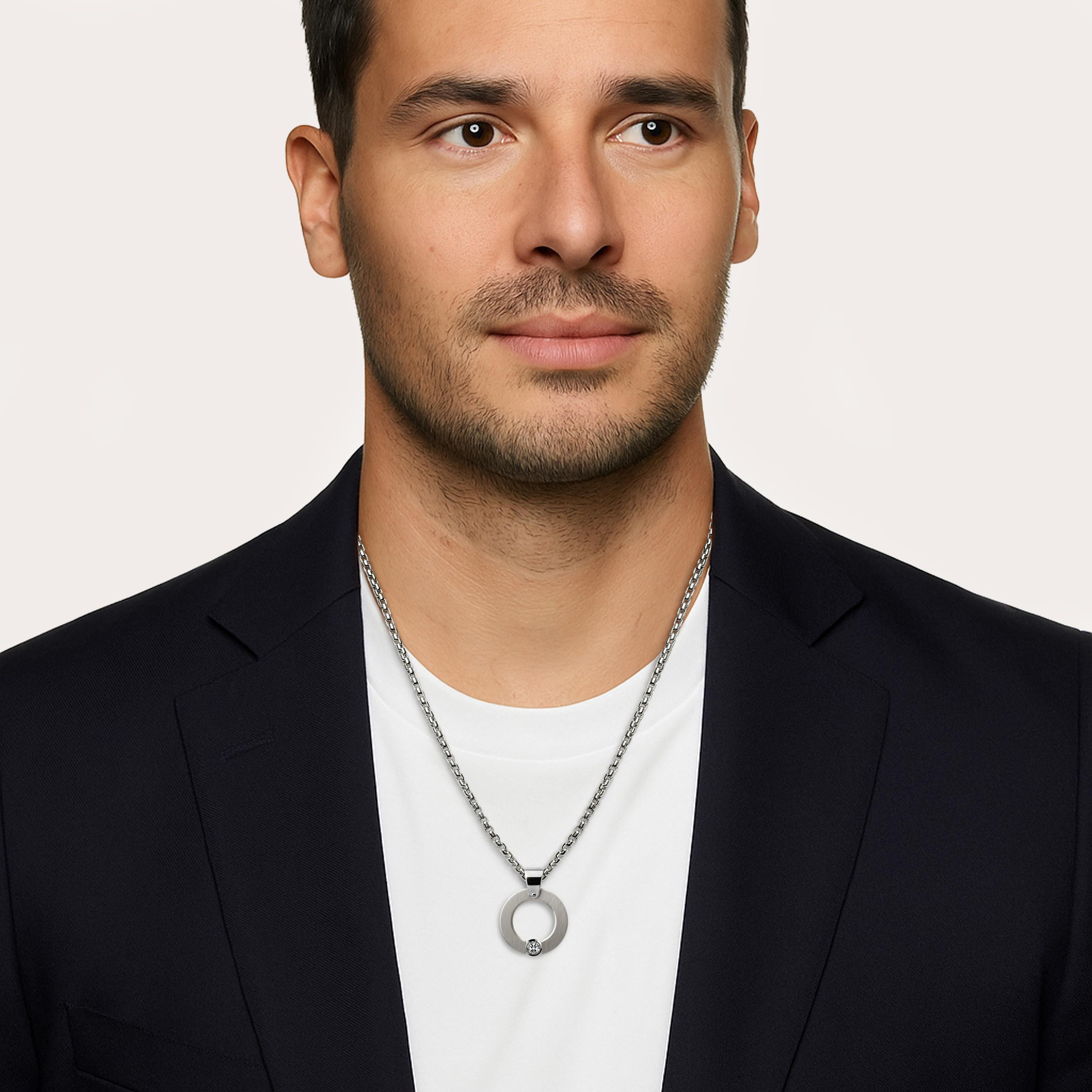 This unique pendant features a two-stage setting for superior security and aesthetic impact. The brilliant-cut gemstone is first meticulously secured in a Bezel Set mount (the bussolotto). This entire small mount is then held fast within the large O-Ring frame using our signature Tension Set technique, making the composite gem appear securely suspended within the loop. This composite, architectural design is a hallmark of Taormina's industrial mastery.