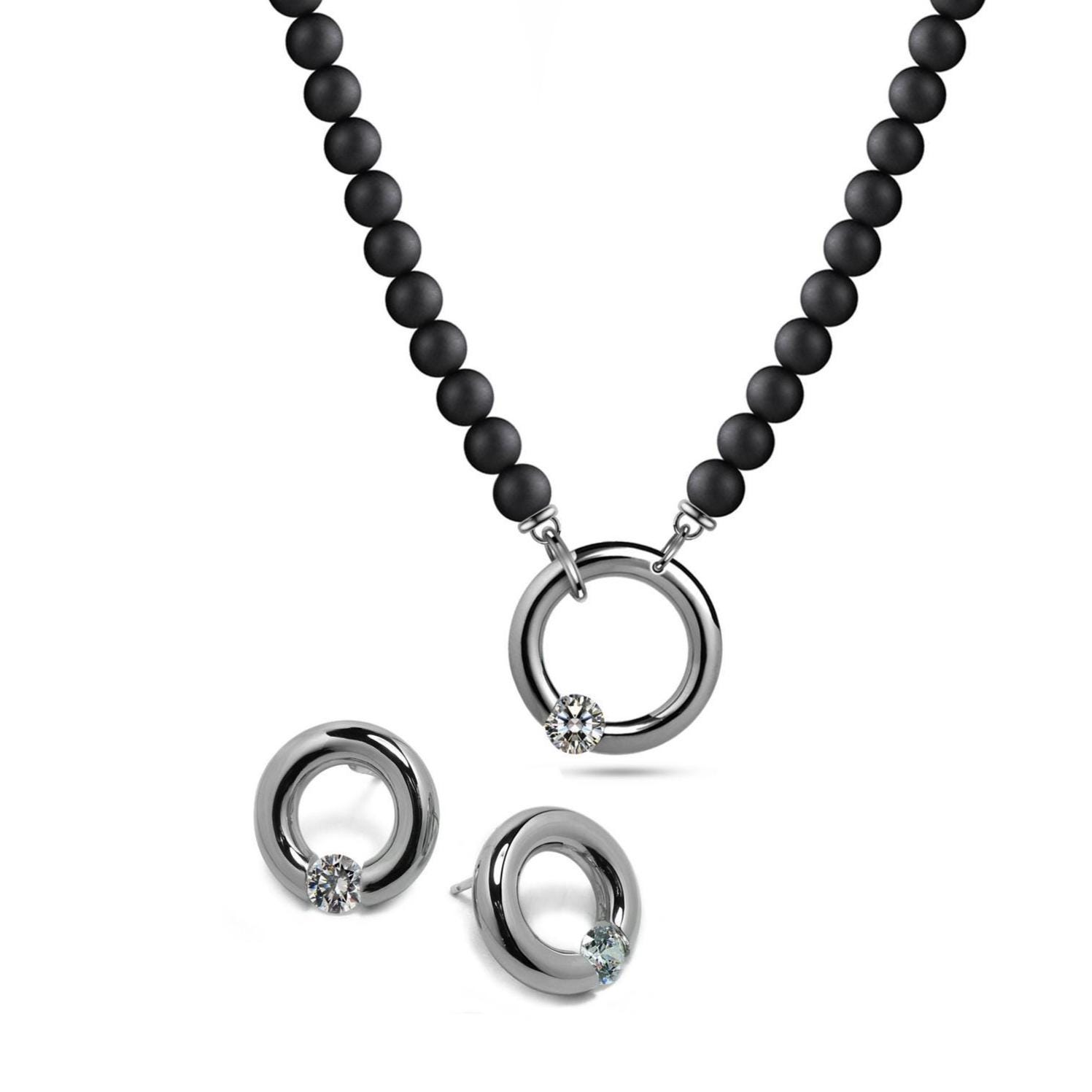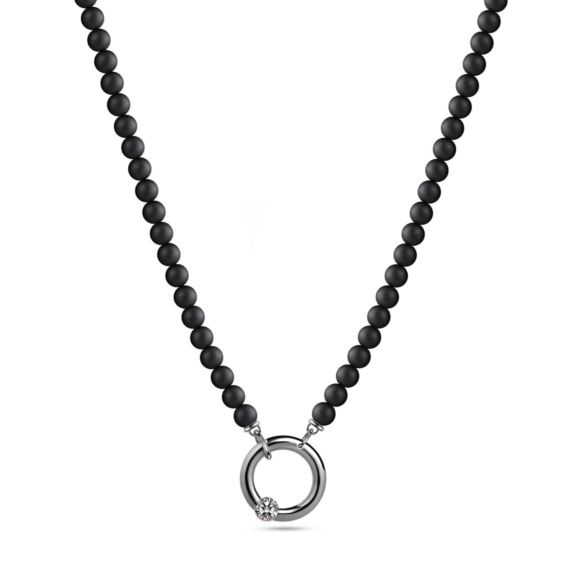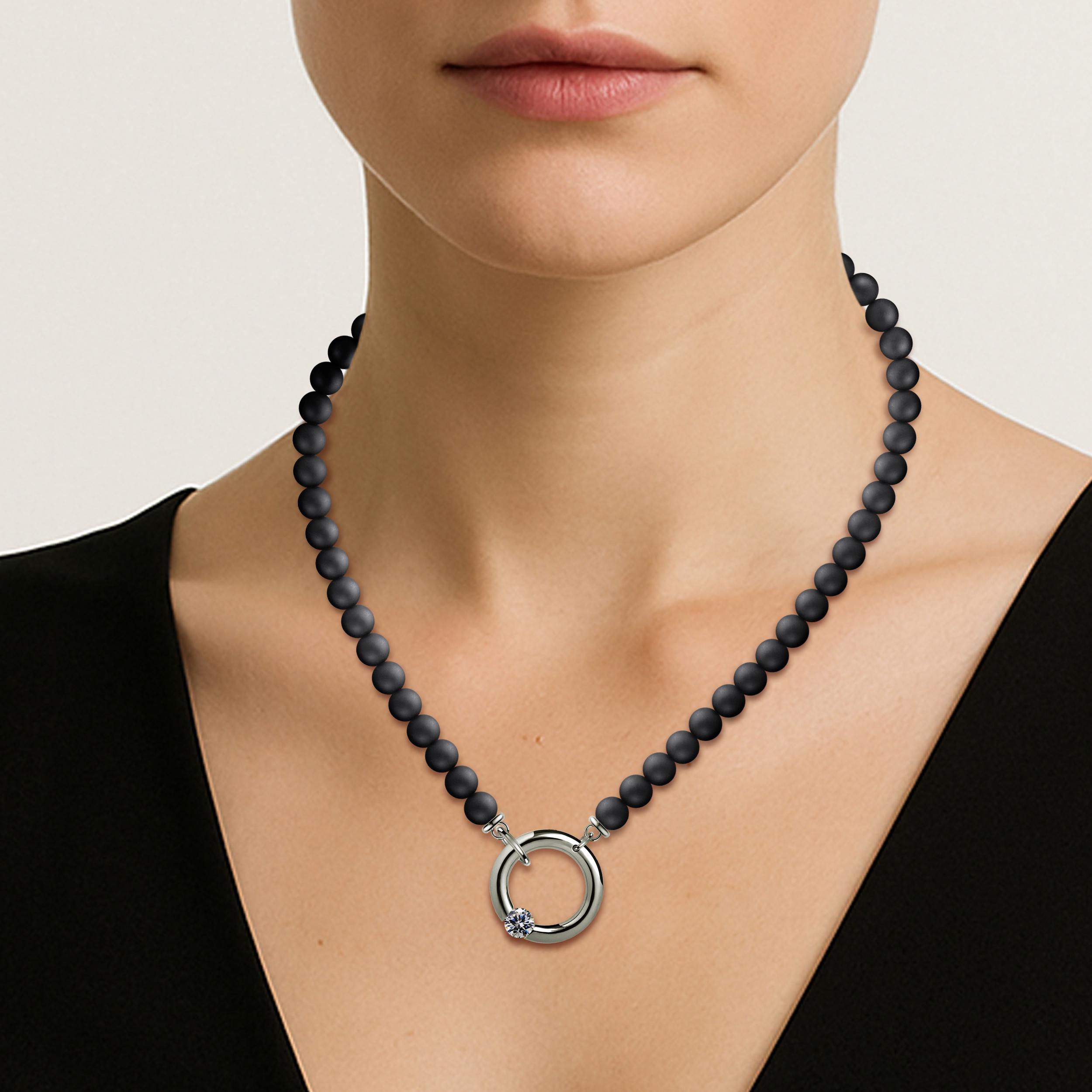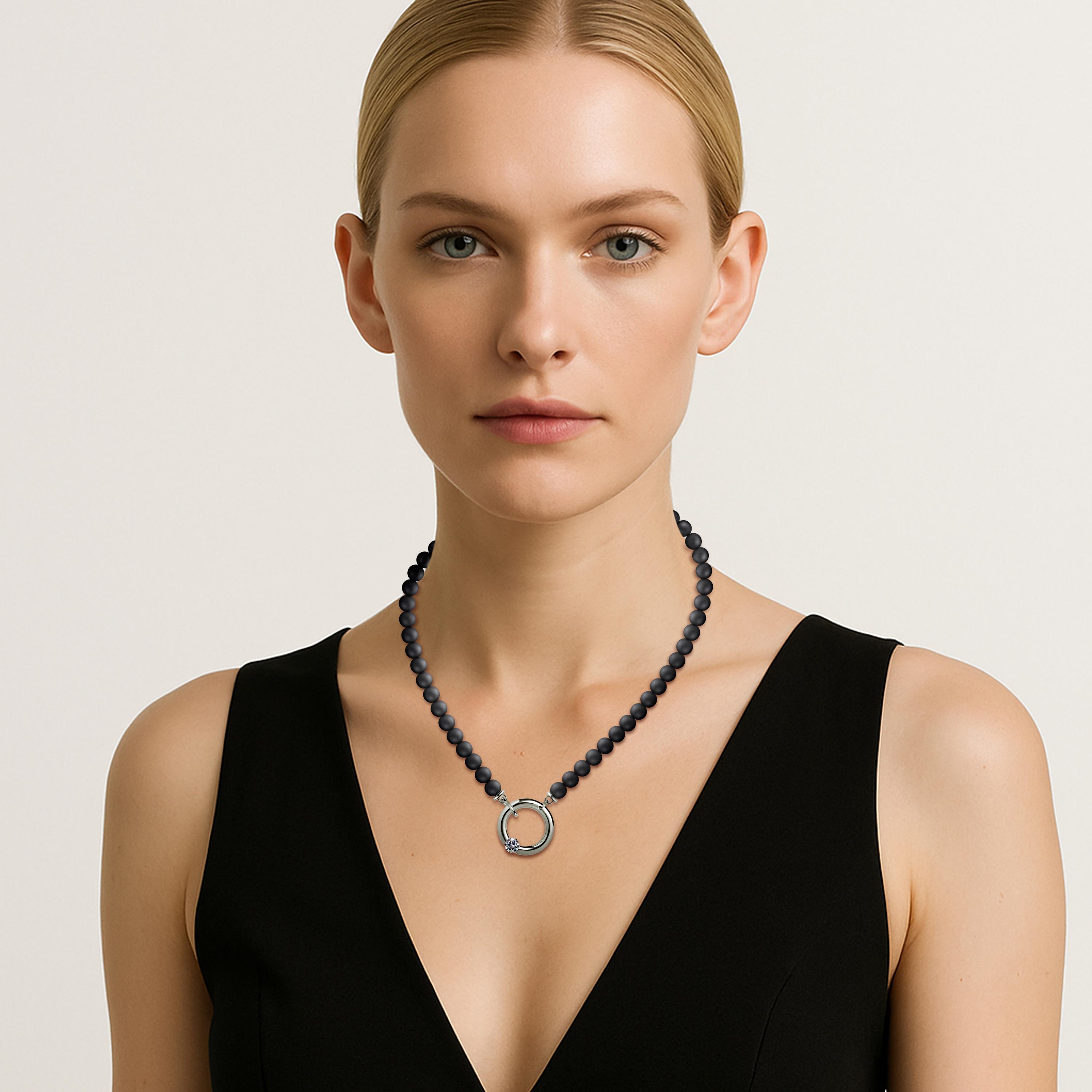 At its heart, a 18mm tubular stainless steel ring carries a tension-set White Sapphire, brilliantly offset to capture light and shimmer with every angle. The polished sheen of the steel contrasts against the deep matte beauty of the obsidian beads, creating an alluring tension between shadow and shine.
