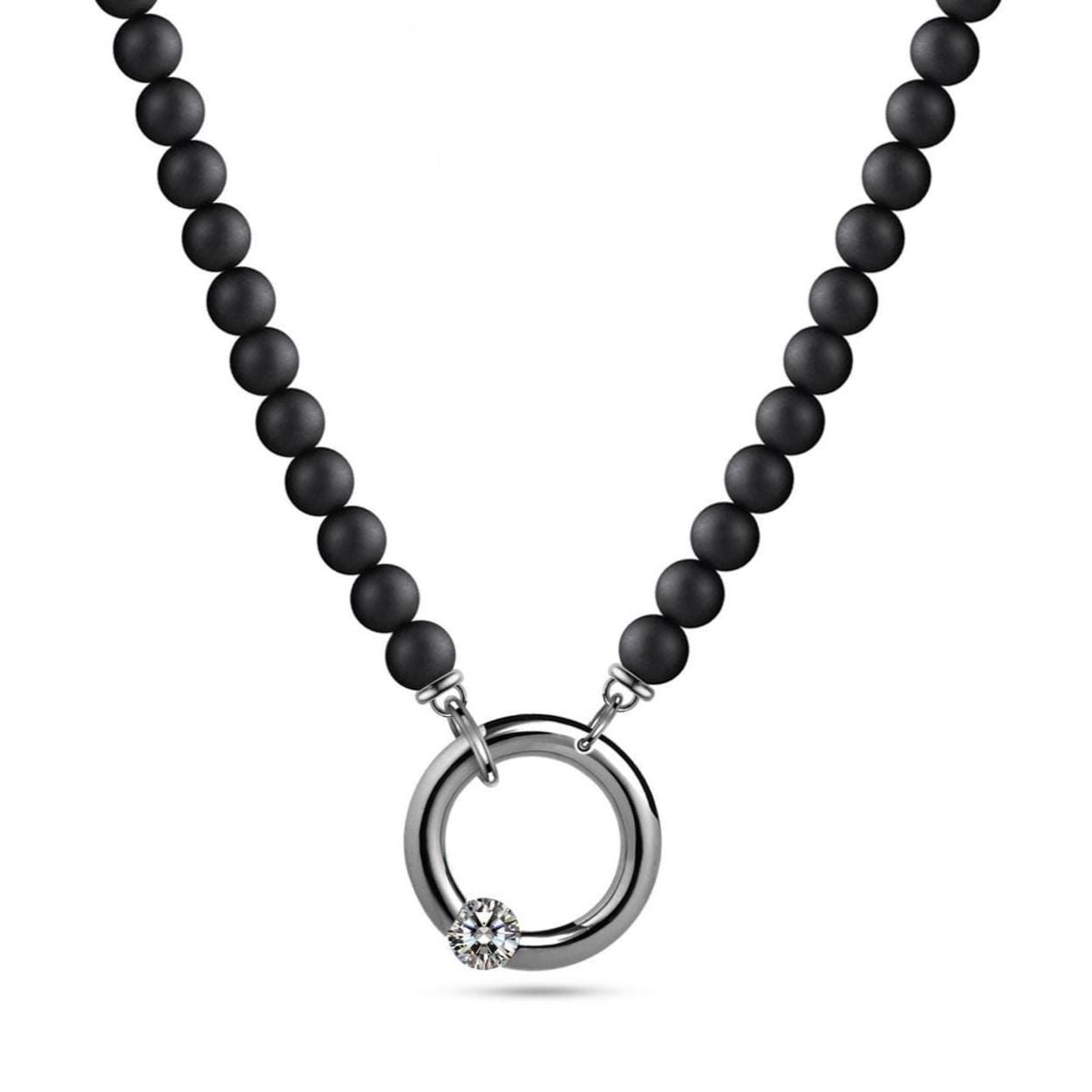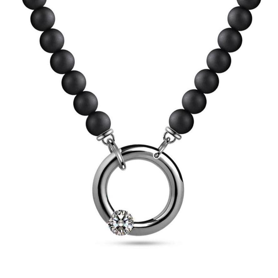At its heart, a 18mm tubular stainless steel ring carries a tension-set White Sapphire, brilliantly offset to capture light and shimmer with every angle. The polished sheen of the steel contrasts against the deep matte beauty of the obsidian beads, creating an alluring tension between shadow and shine.