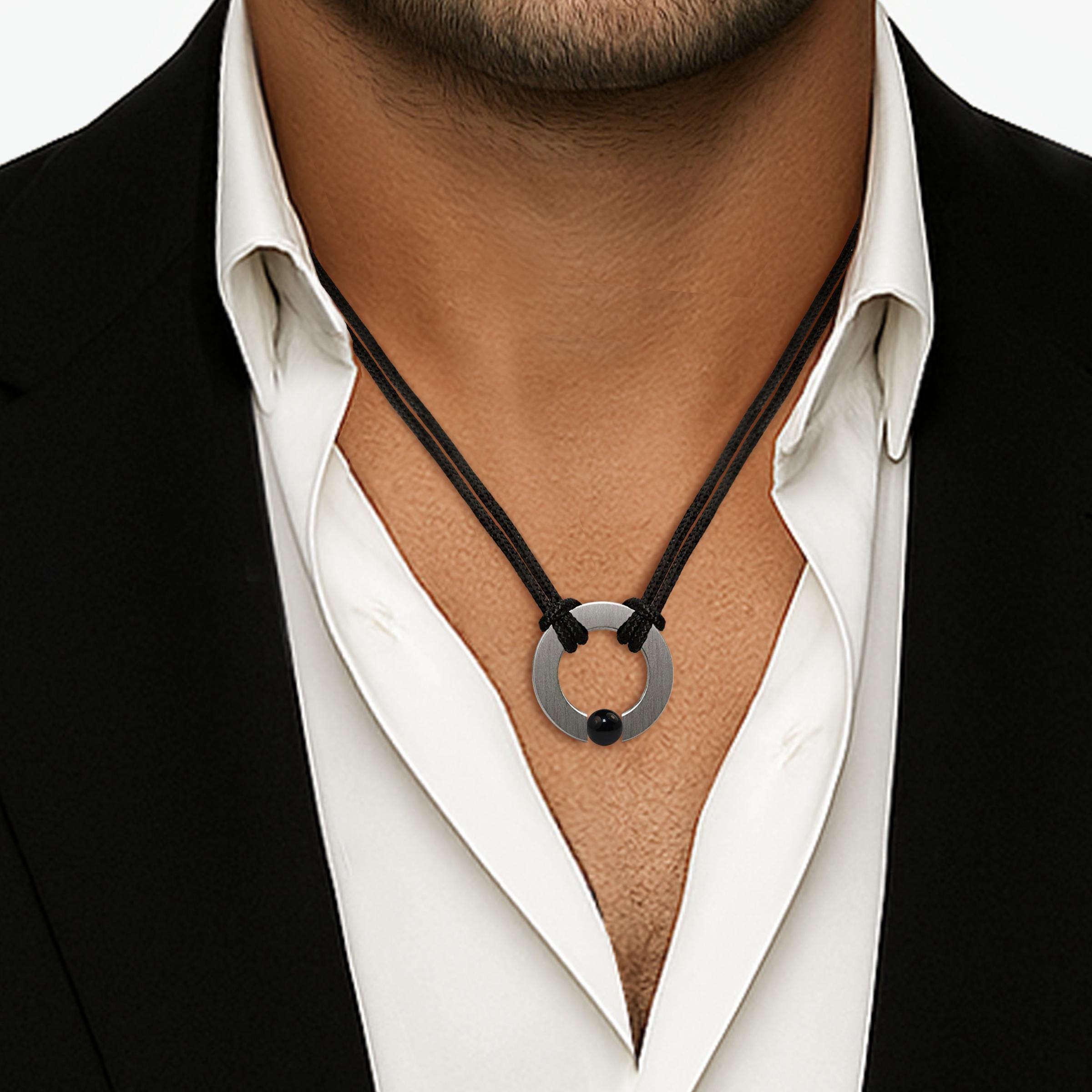 Held by a sleek double black cord, the design balances urban sophistication and organic elegance — a quiet statement for the modern wearer.