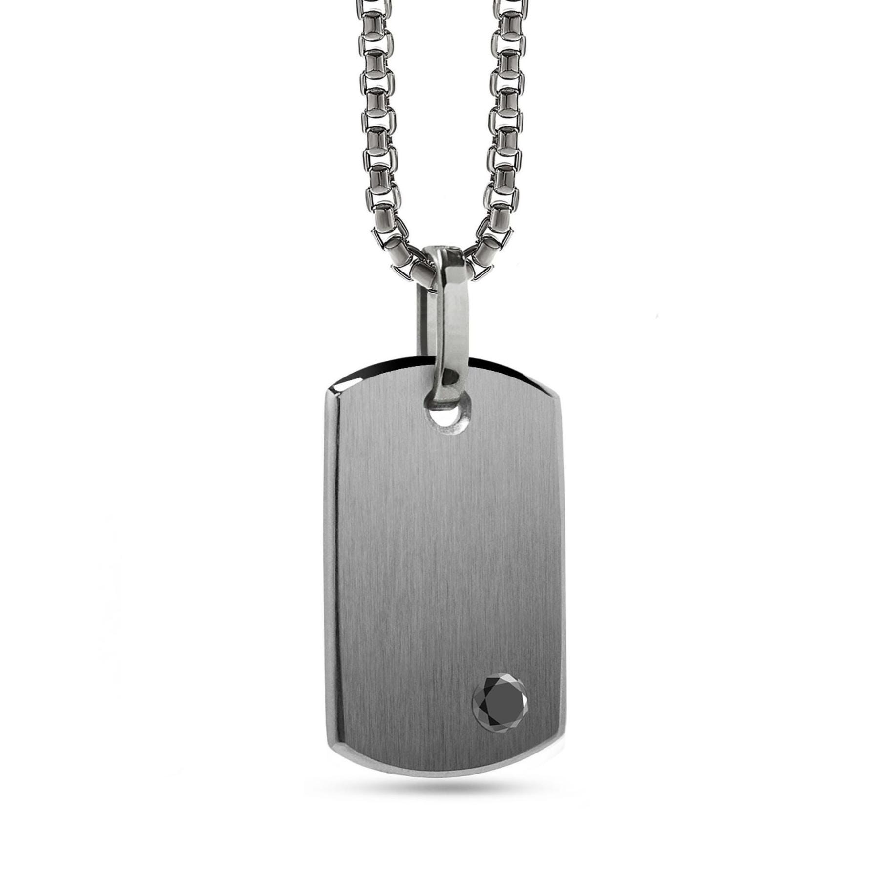 Elevate your everyday look with this Taormina Dog Tag Pendant. A perfect fusion of industrial strength and subtle luxury, this necklace features a classic Dog Tag silhouette crafted from durable 316L Stainless Steel. The surface boasts a modern brushed finish for an understated, masculine appeal, beautifully contrasted by a single, striking Black Diamond set low near the base. The inclusion of the diamond adds a unique flash of luxury and distinction.