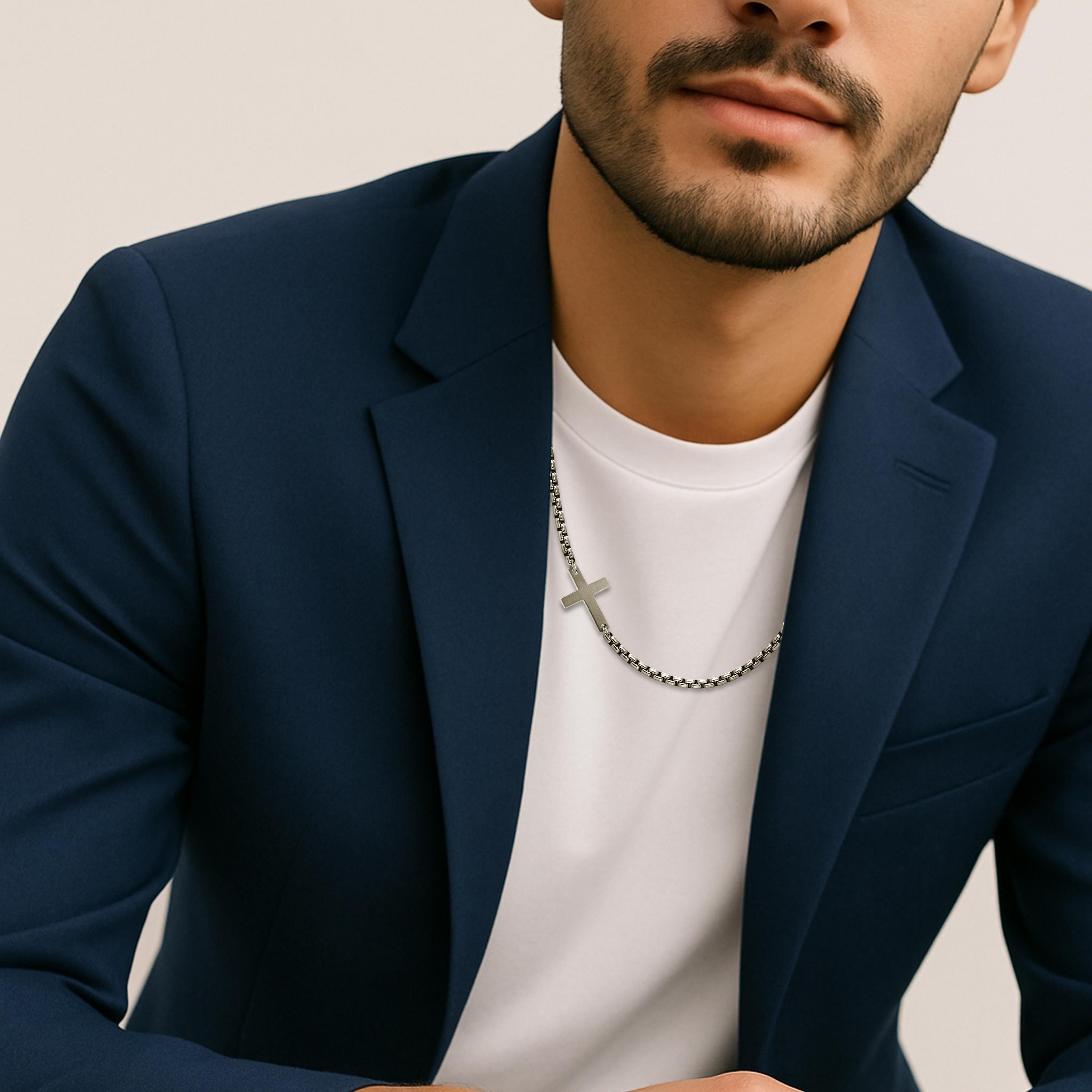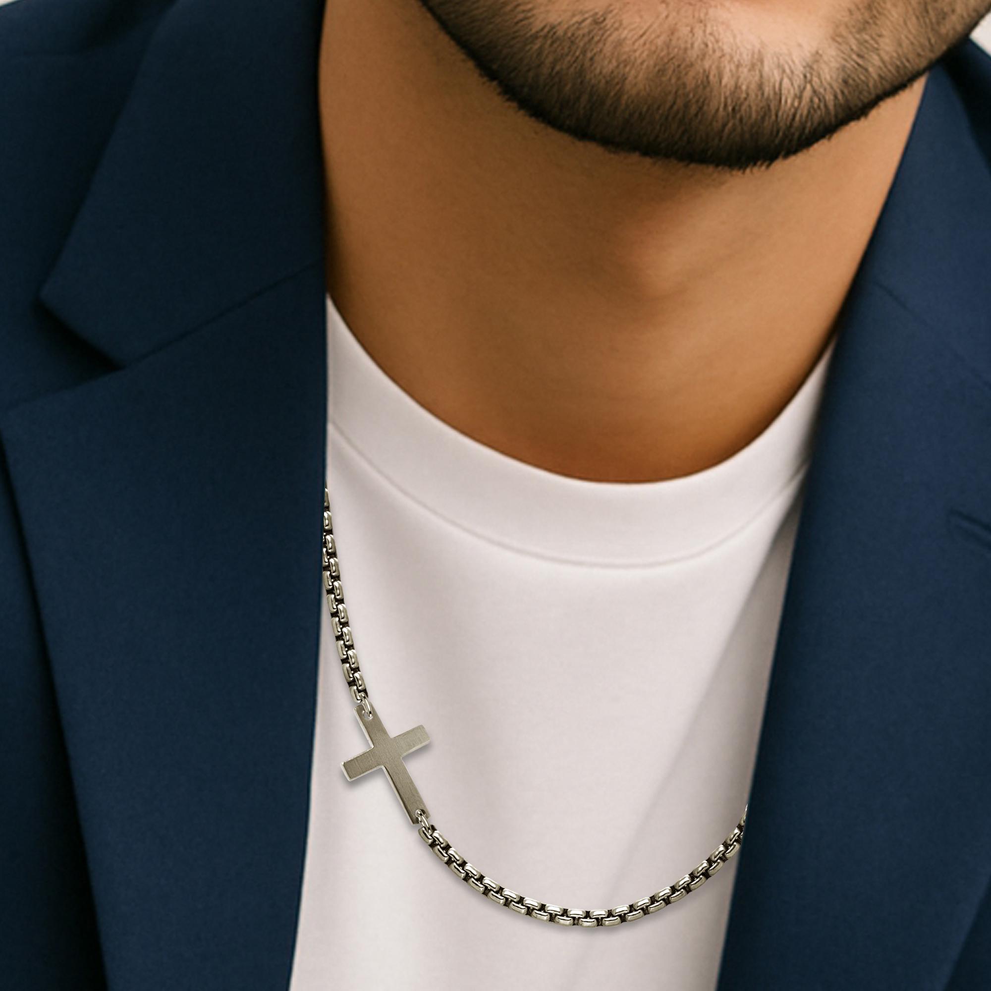 An elegant fusion of timeless design and modern craftsmanship, this necklace features a sleek 4 mm box link chain delicately accented with a side-mounted cross. Inspired by classic motifs and crafted with meticulous artisanal precision, each link combines strength and subtle sophistication for a piece that’s both refined and durable.