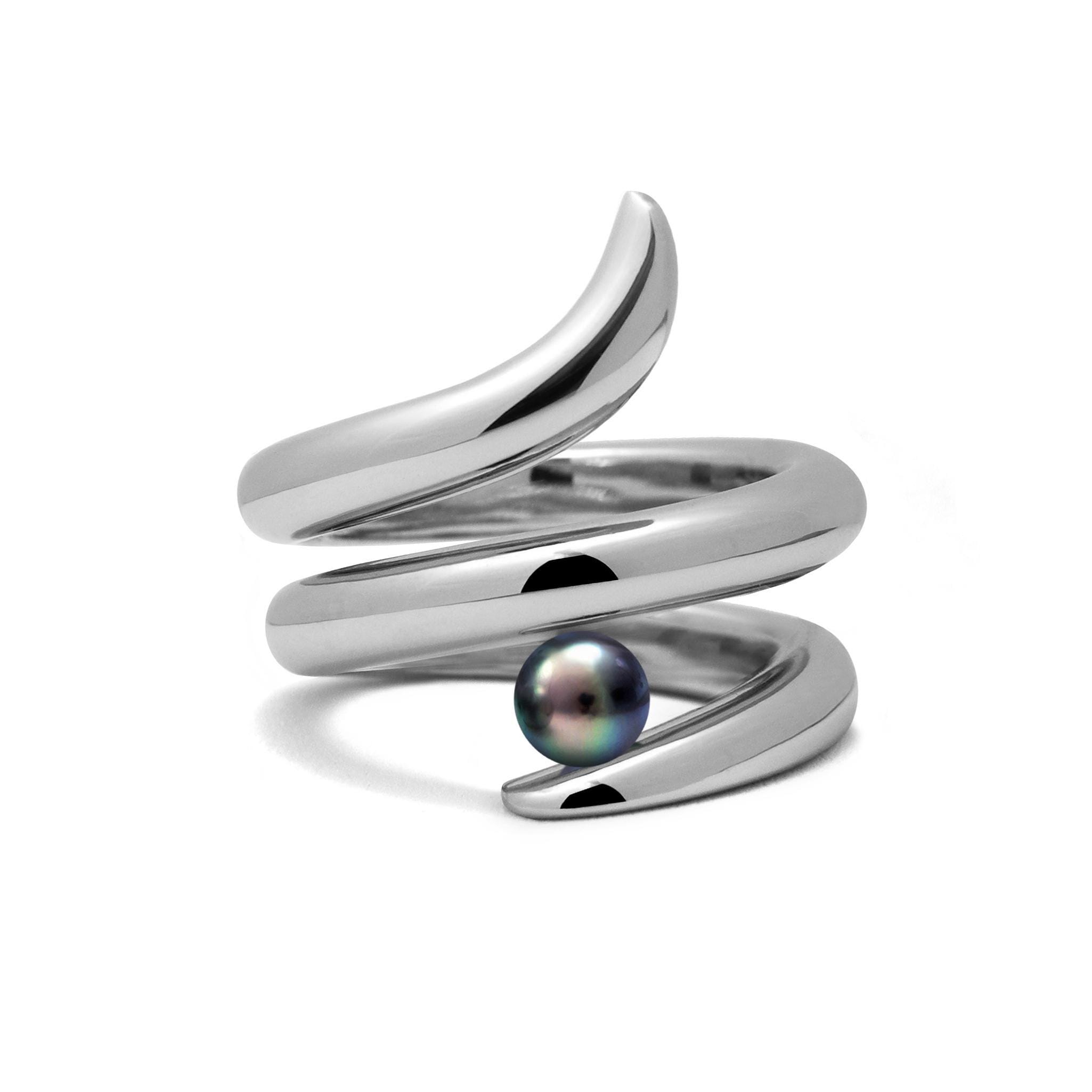 A bold expression of minimal elegance, this sculptural ring is crafted in high-polished stainless steel and features a fluid spiral design that wraps gracefully around the finger. At its center, a cultured black pearl is tension-set between the curved ends, creating the illusion of a floating gem. Sleek and architectural, this ring blends strength with sophistication—perfect for those who appreciate refined design with a modern edge.