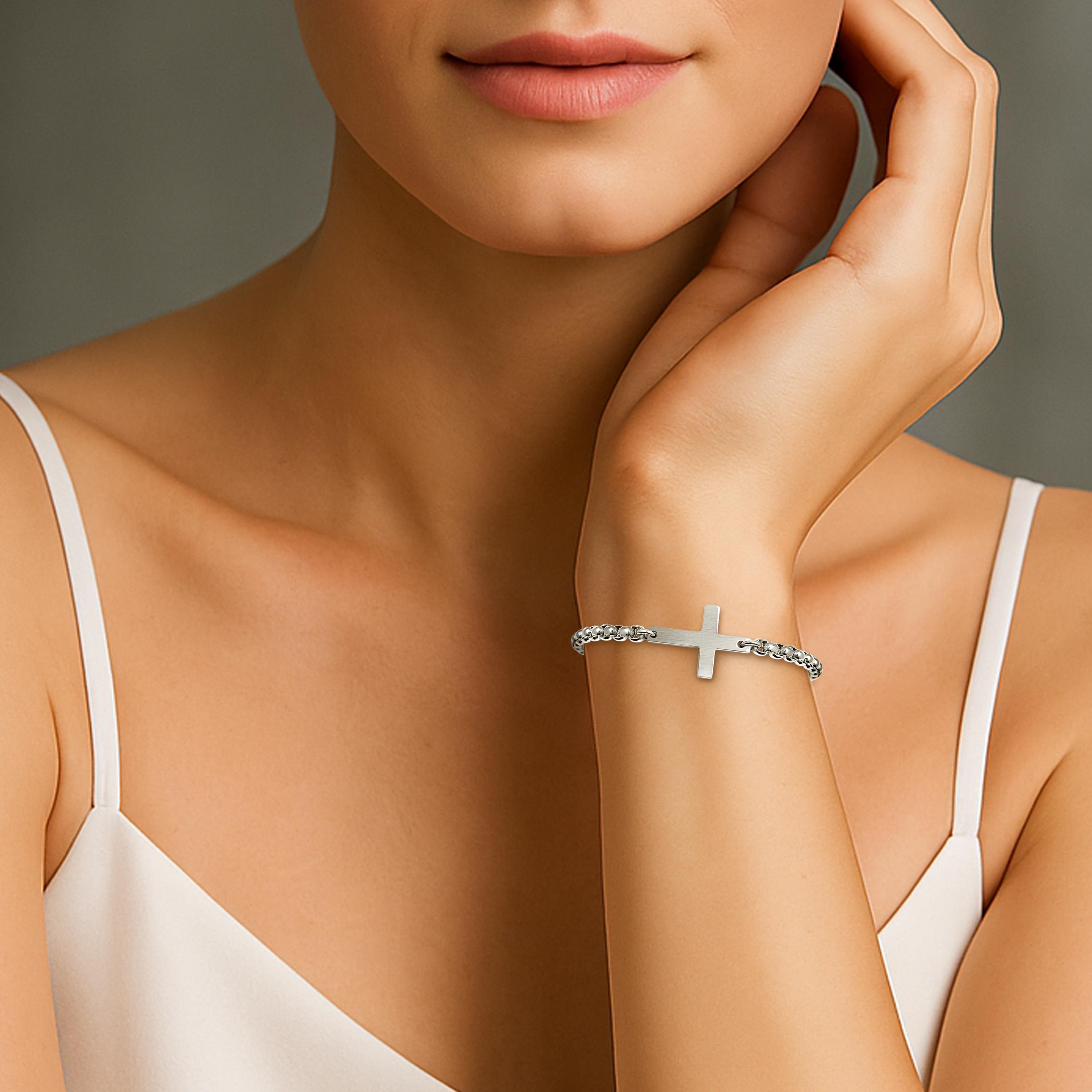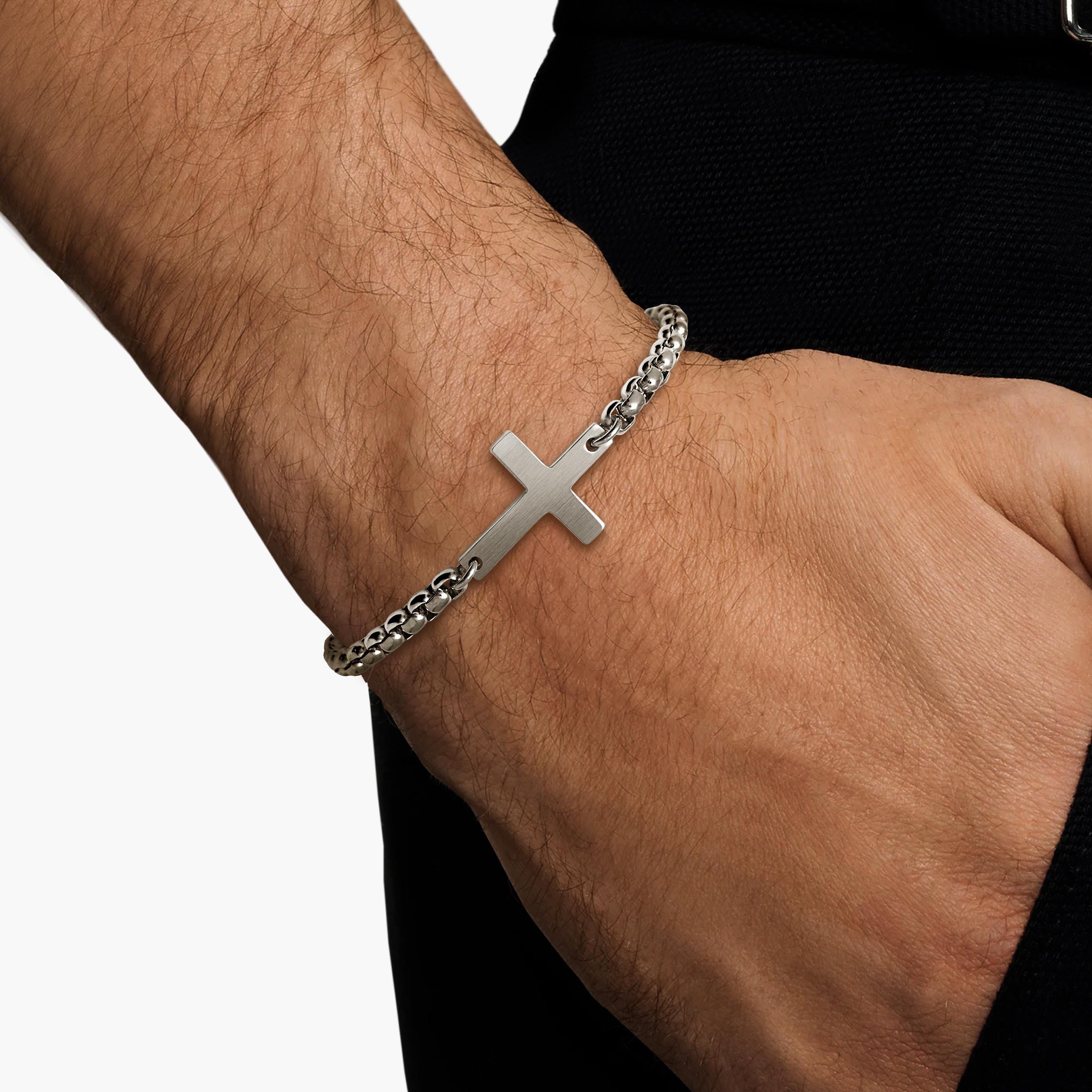 Trendy box link chain cross station bracelet, crafted stainless steel. The highlight of the design is a fully handmade cross, carved from a single solid piece of metal, not cast or assembled— bringing an authenticity and strength that elevates its spiritual significance.