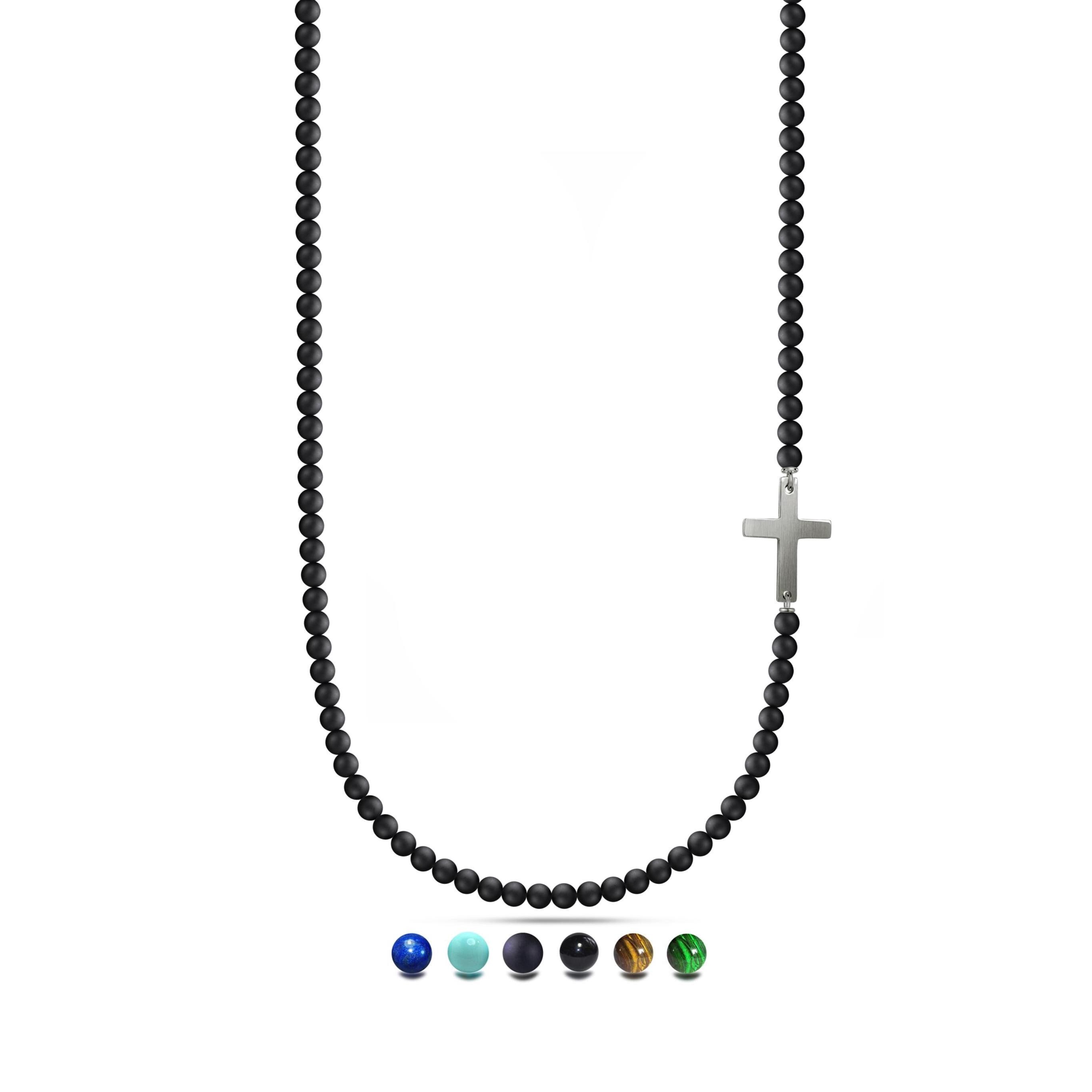 This refined 4mm bead necklace from Taormina Jewelry merges faith-inspired symbolism with meticulous artisanal craftsmanship. Strung on a resilient double-coated stainless steel cable, it offers both durability and comfort for daily wear. The highlight of the design is a fully handmade cross, carved from a single solid piece of metal, not cast or assembled— bringing an authenticity and strength that elevates its spiritual significance.