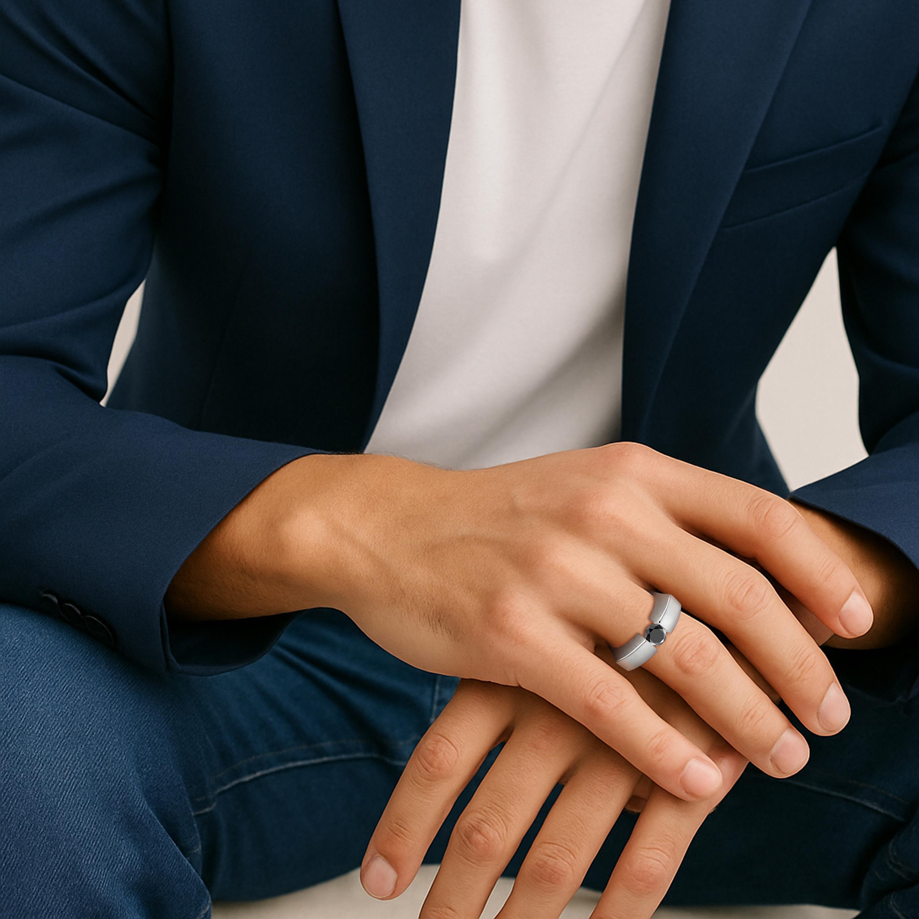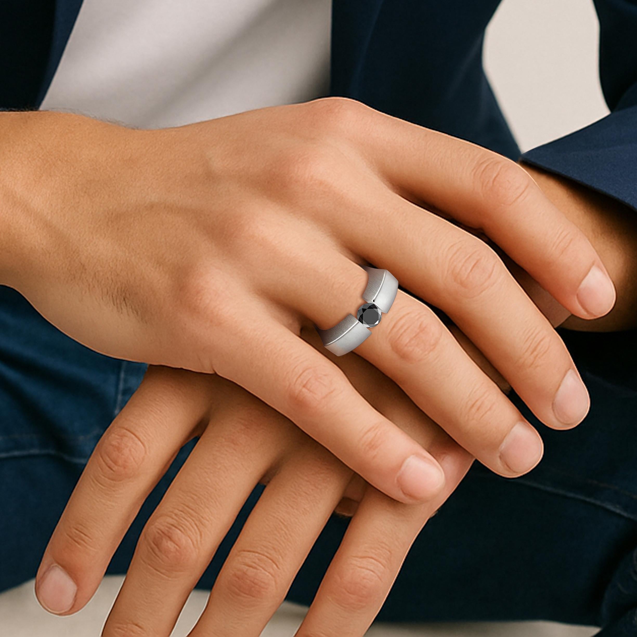 Designed for him, loved by anyone who appreciates its bold style, this striking ring marries ergonomic design with architectural elegance. The band’s graceful curves are sculpted to follow the natural contour of your finger—delivering unmatched comfort without sacrificing visual impact. An expertly crafted tension setting suspends the gemstone in a seemingly magical embrace, creating the illusion that it floats in space, held securely by invisible force.