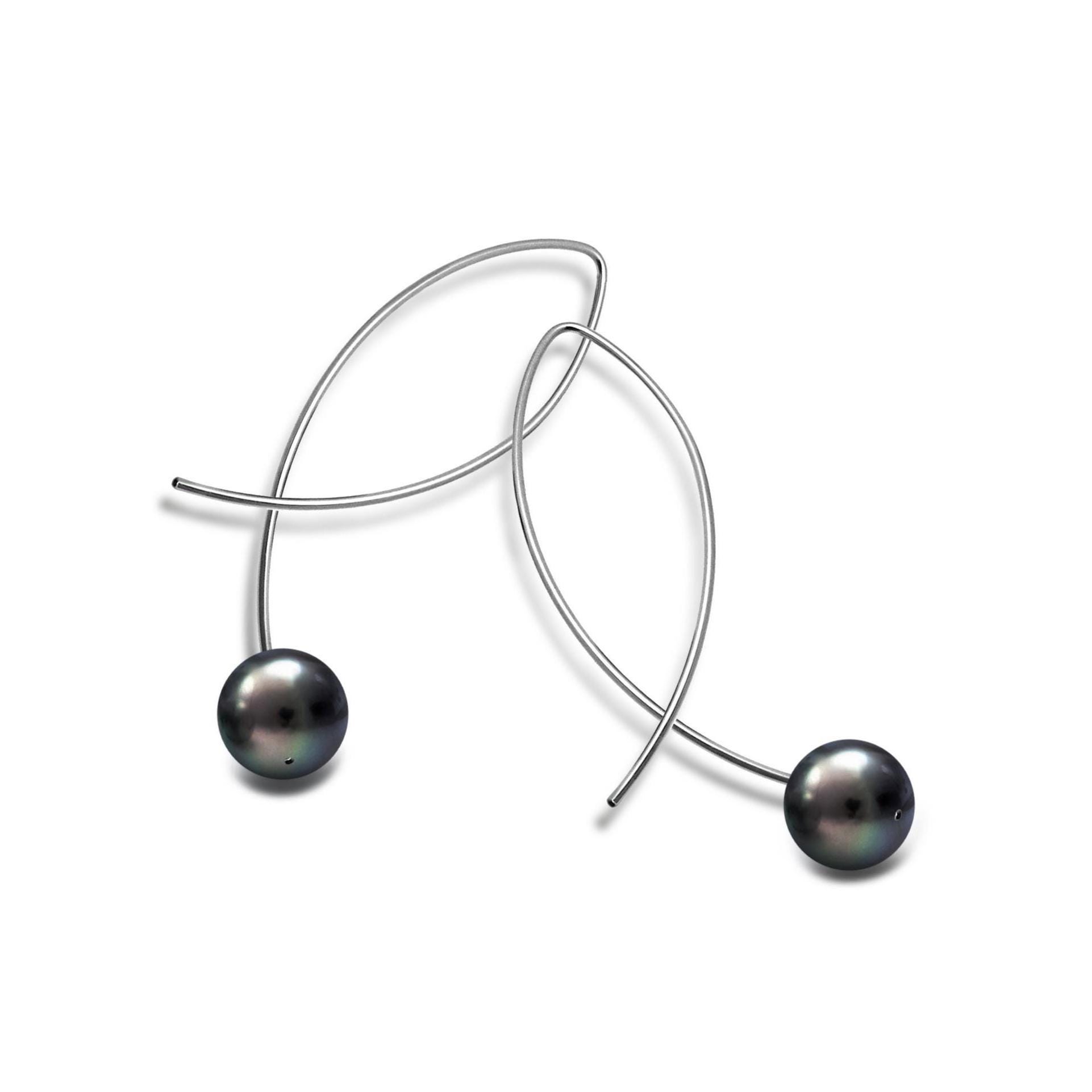 A luminous genuine black pearl anchors the end of the wire, offering a refined contrast to the minimal metal curve. The result is a floating, sculptural look that plays with asymmetry and lightness. Ideal for those who appreciate modern jewelry with architectural edge.