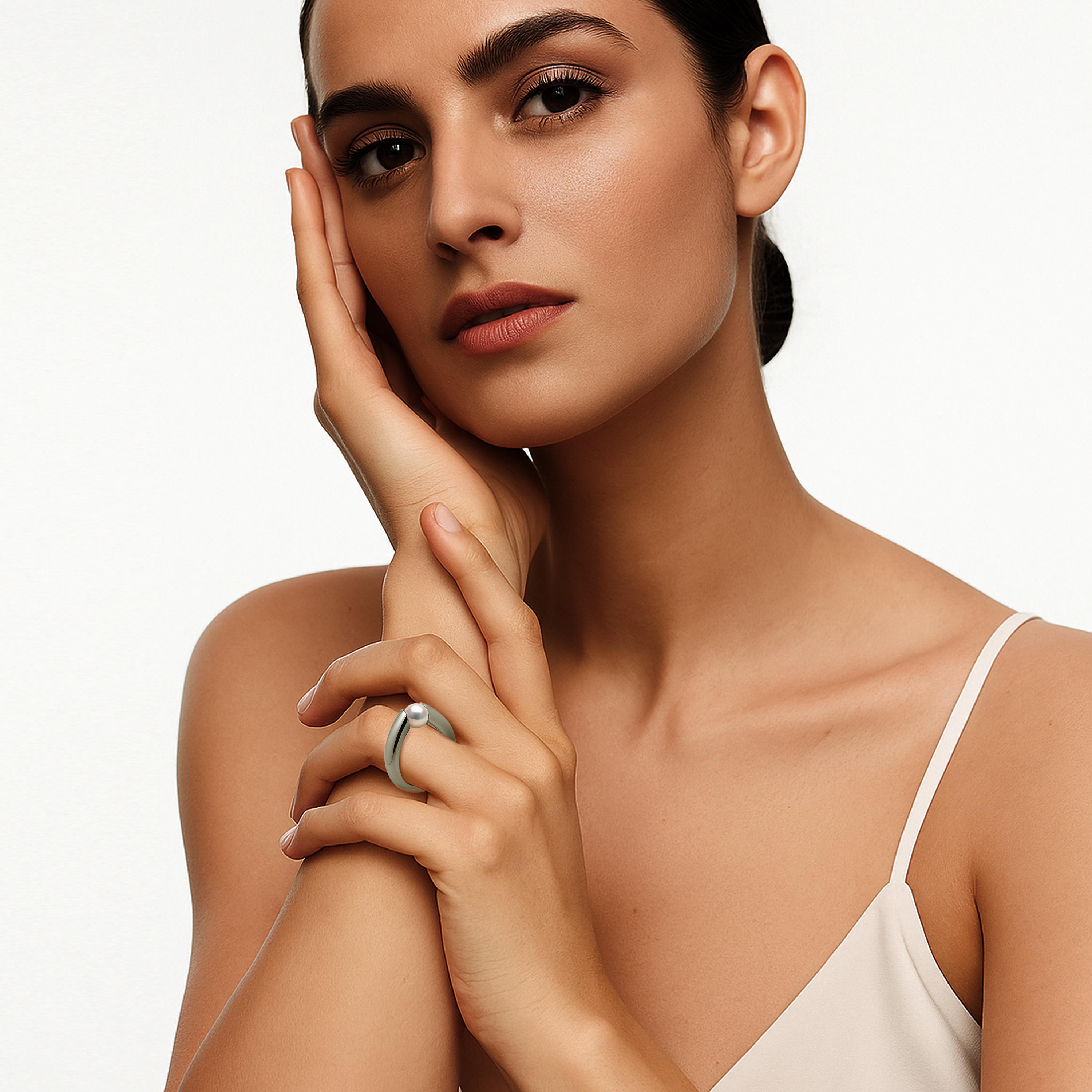 Refined and commanding, the Alba's ring features a high-polished stainless steel band with a bold, elevated silhouette. The design showcases a luminous cultured white pearl held in a dramatic high tension setting. The arched form lifts the pearl above the band, creating a striking floating effect that’s both modern and architectural. A powerful statement of minimalist luxury—elevated in every sense.