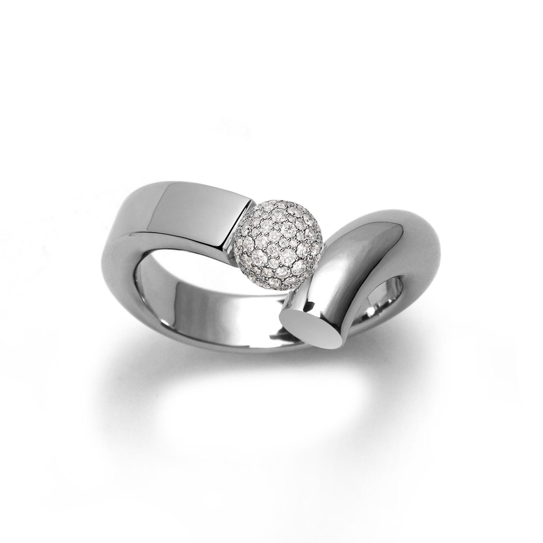 Taormina PROFILO Flat & Rounded Bypass Ring is a bold expression of sculptural minimalism and refined craftsmanship. Designed with Taormina’s signature architectural precision, this striking ring features a unique bypass silhouette—two bands sweeping past each other in fluid motion, one with a flat edge for clean, modern structure, the other rounded for softness and organic balance. At the center, a tension set sphere with Pavé-set white sapphires between the bands, appearing to float effortlessly in space. The ring tapers from 3mm at the sides to a bold 5mm at the top, and is finished in a sleek mirror polish.