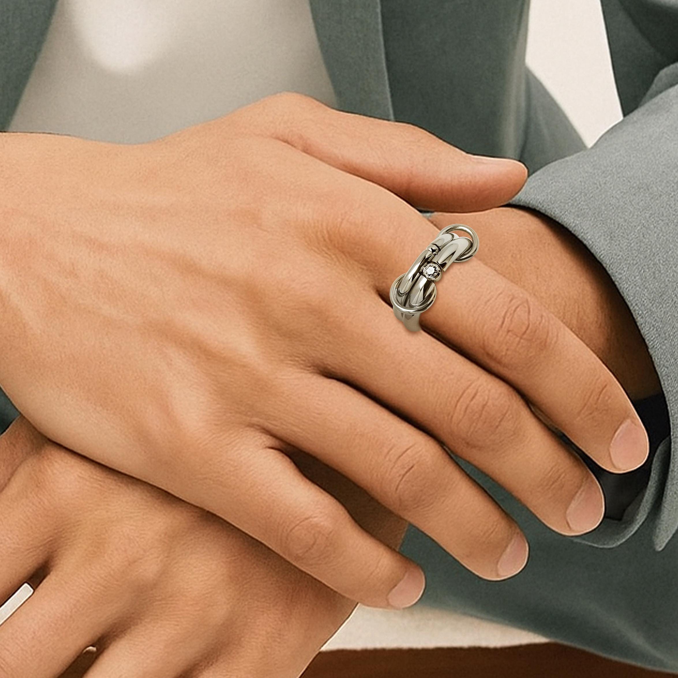 The PLUTO connected contemporary design features two tubular bands of different gauge that support two orbiting annulets, with tension set small sphere and a bezel set white sapphire, offering an everyday style that’s delicate and lightweight, yet powerful in its minimalism. Two connectors small rings link each band together, encouraging this design to be worn spread across multiple fingers or stacked as a sculptural whole ensemble.