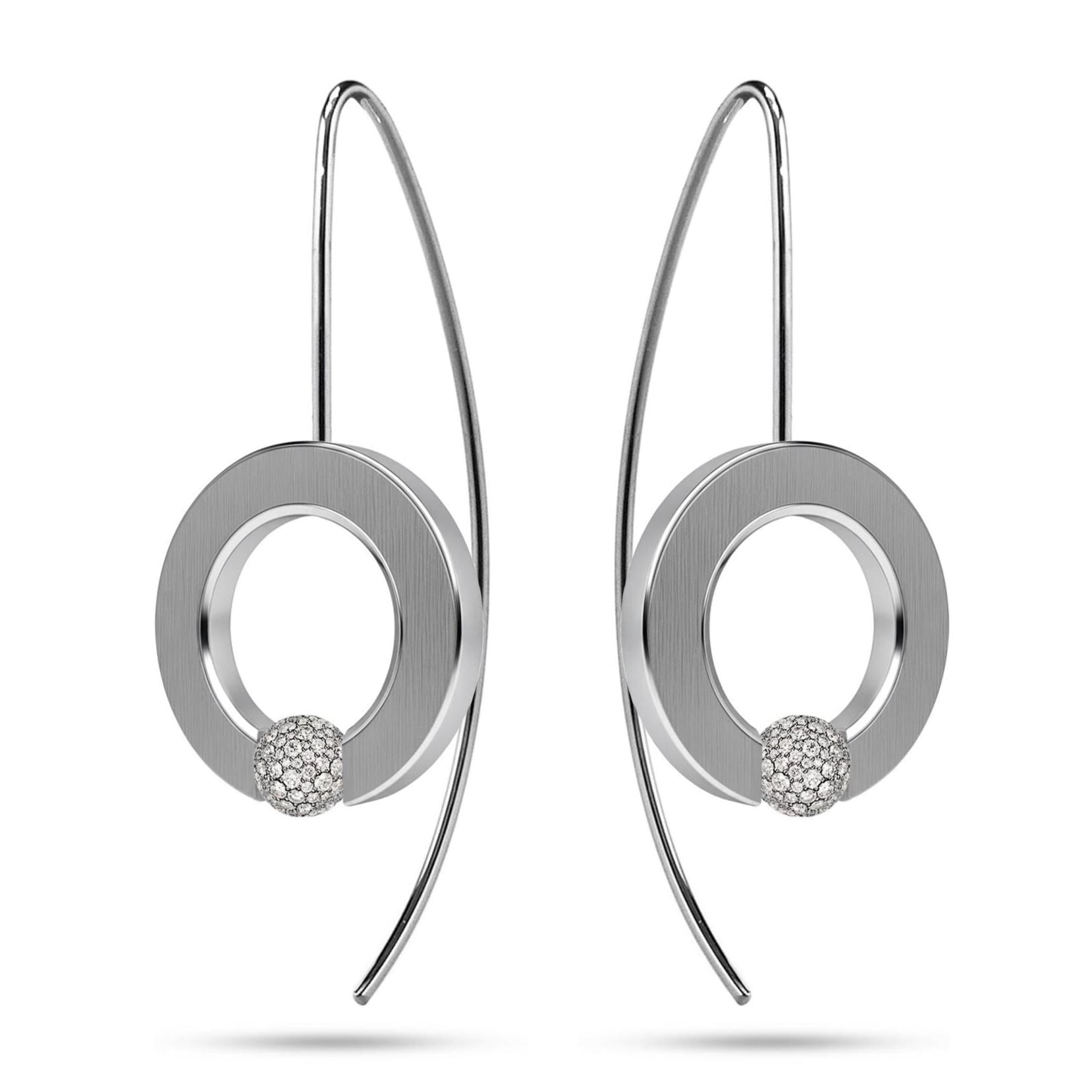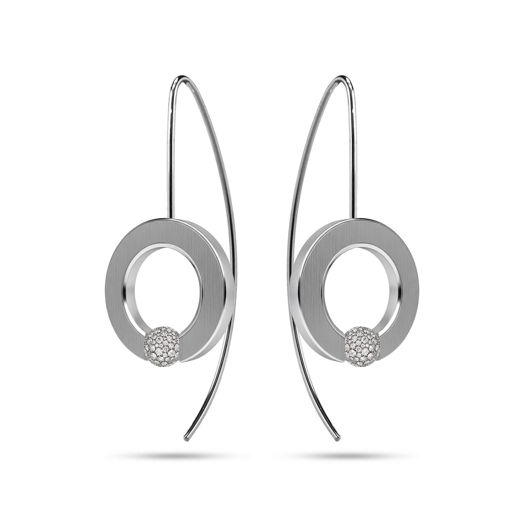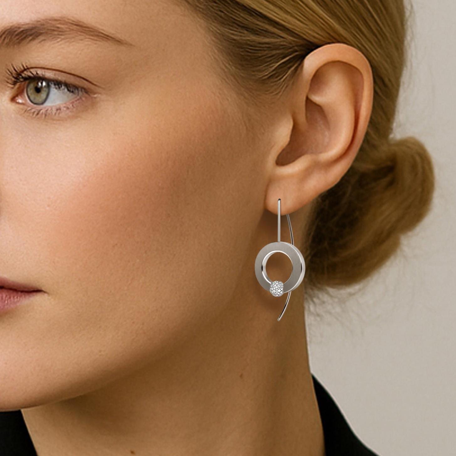 Discover the ABBRACCI flat round drop earrings by Taormina Jewelry, where Italian-inspired craftsmanship and minimalist elegance unite in perfect harmony. These sophisticated drop feature a precision tension‑set Pavé White Sapphire Station—nestled seamlessly between sleek stainless steel flat circles, suspended from a slender ear wire. The front brushed finish captures and reflects light with a striking, radiant effect, while the outer rim offers a polished contrast for added depth.