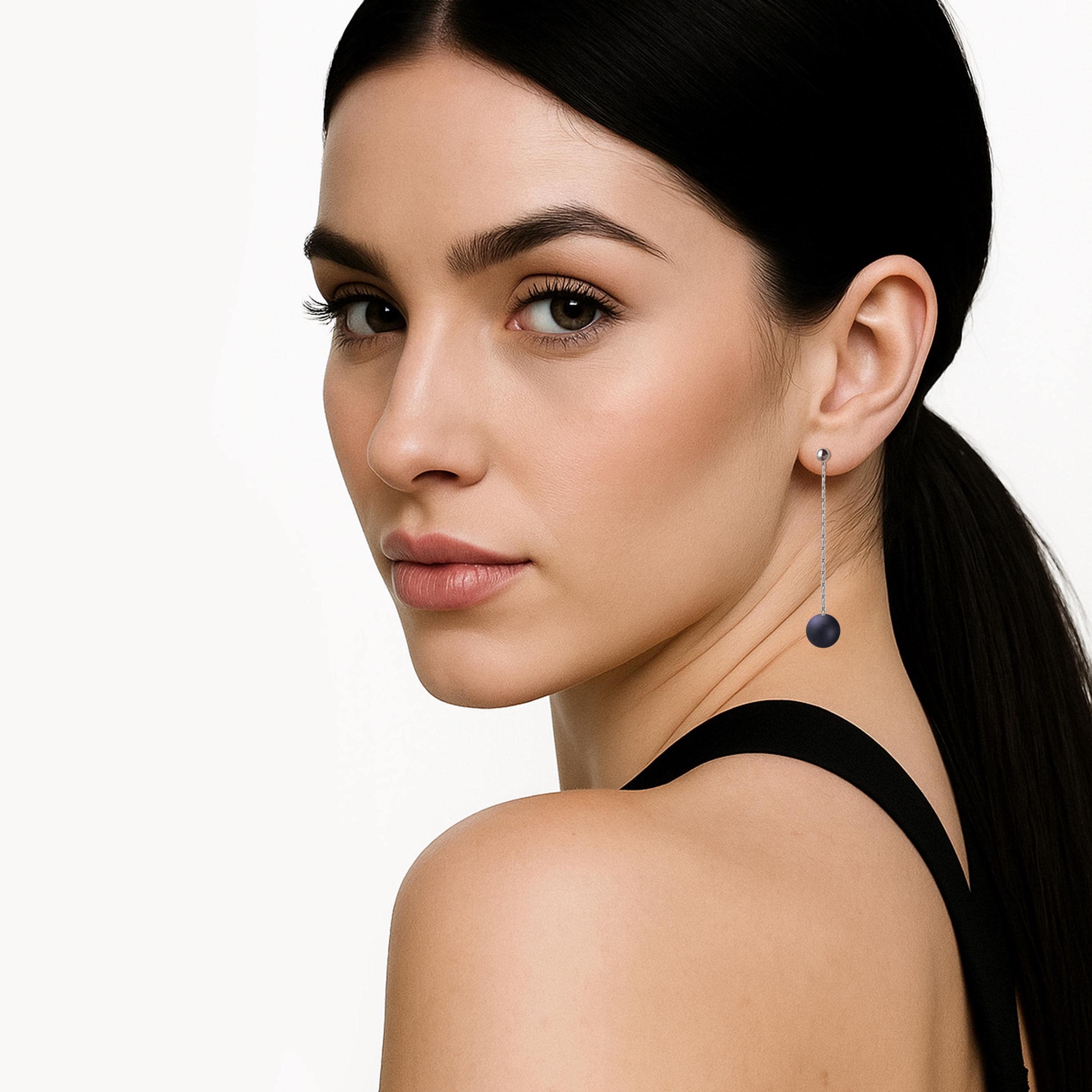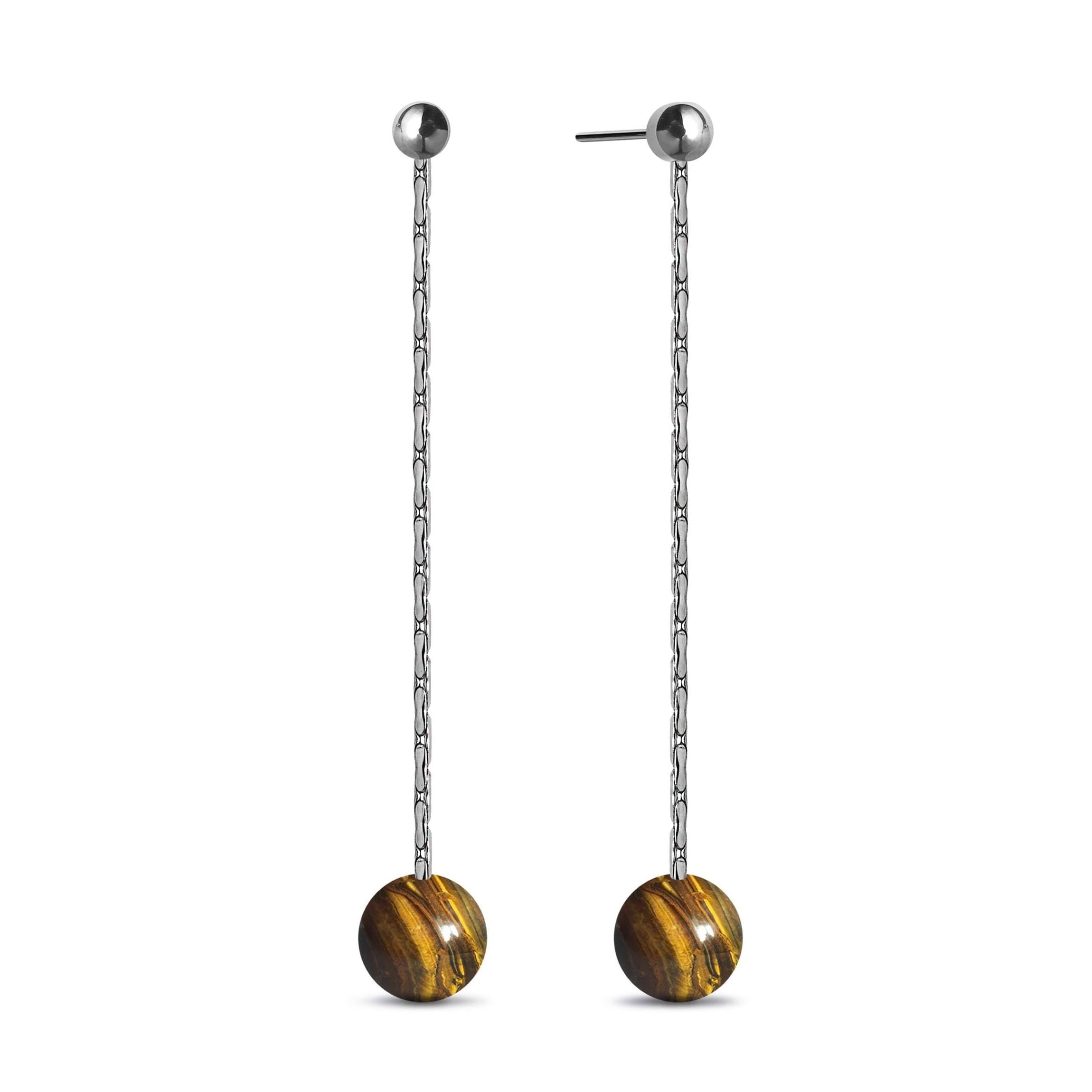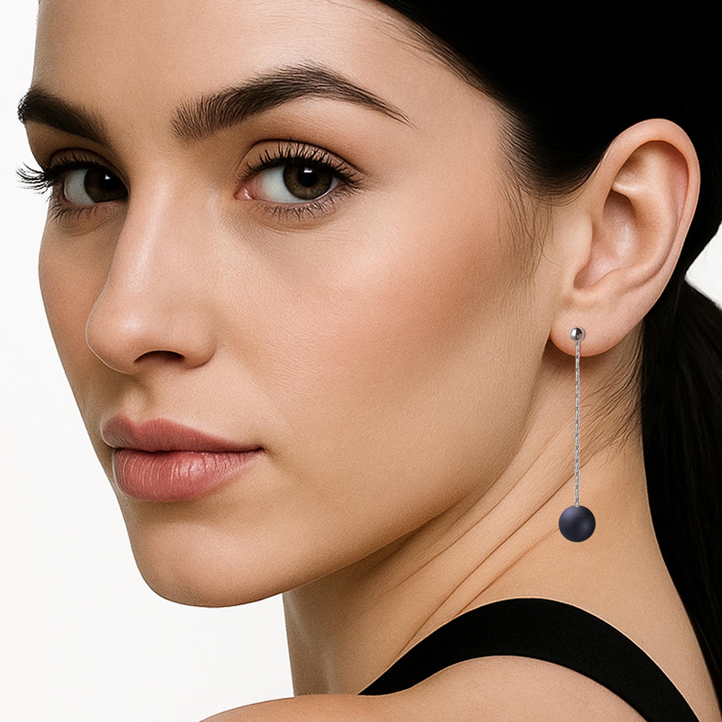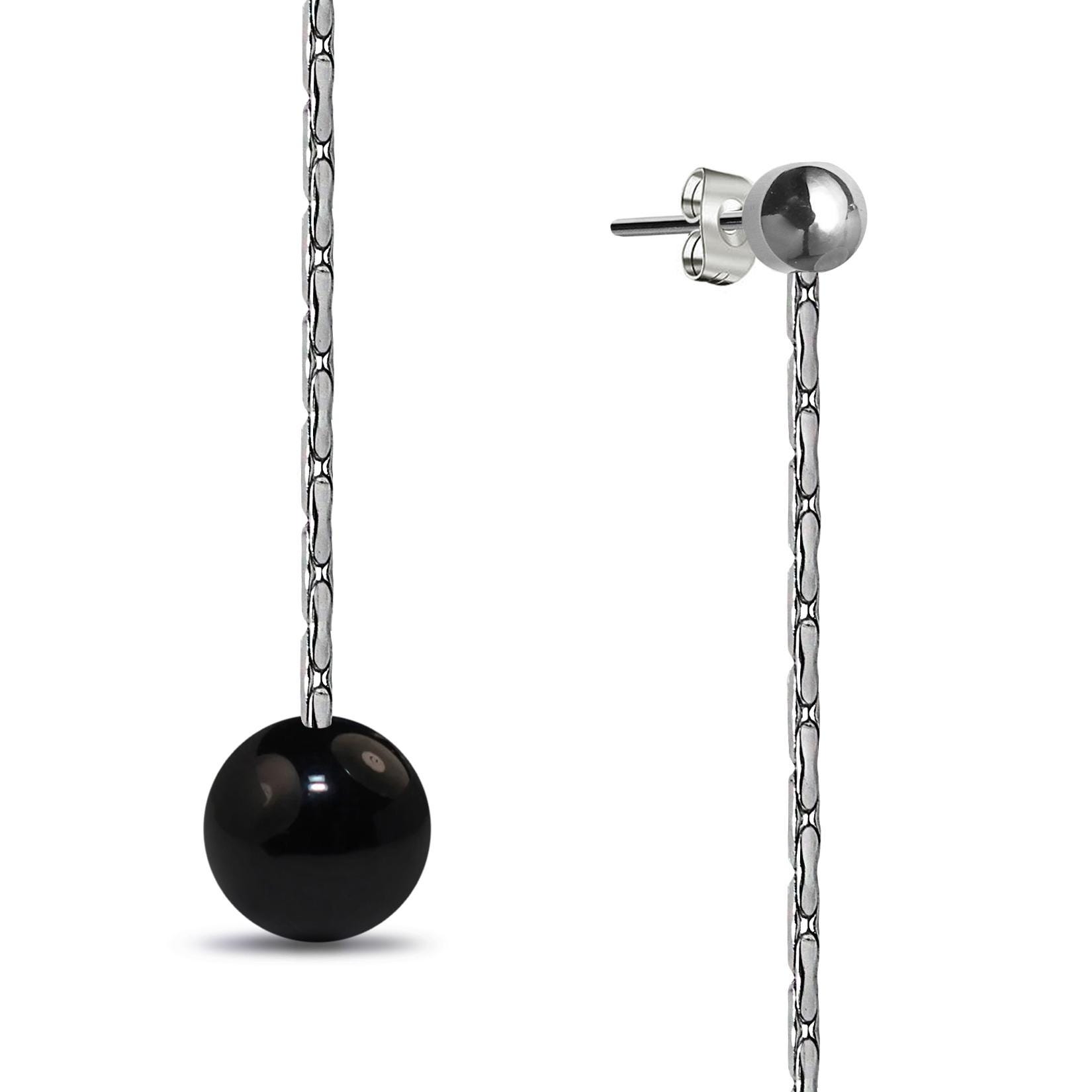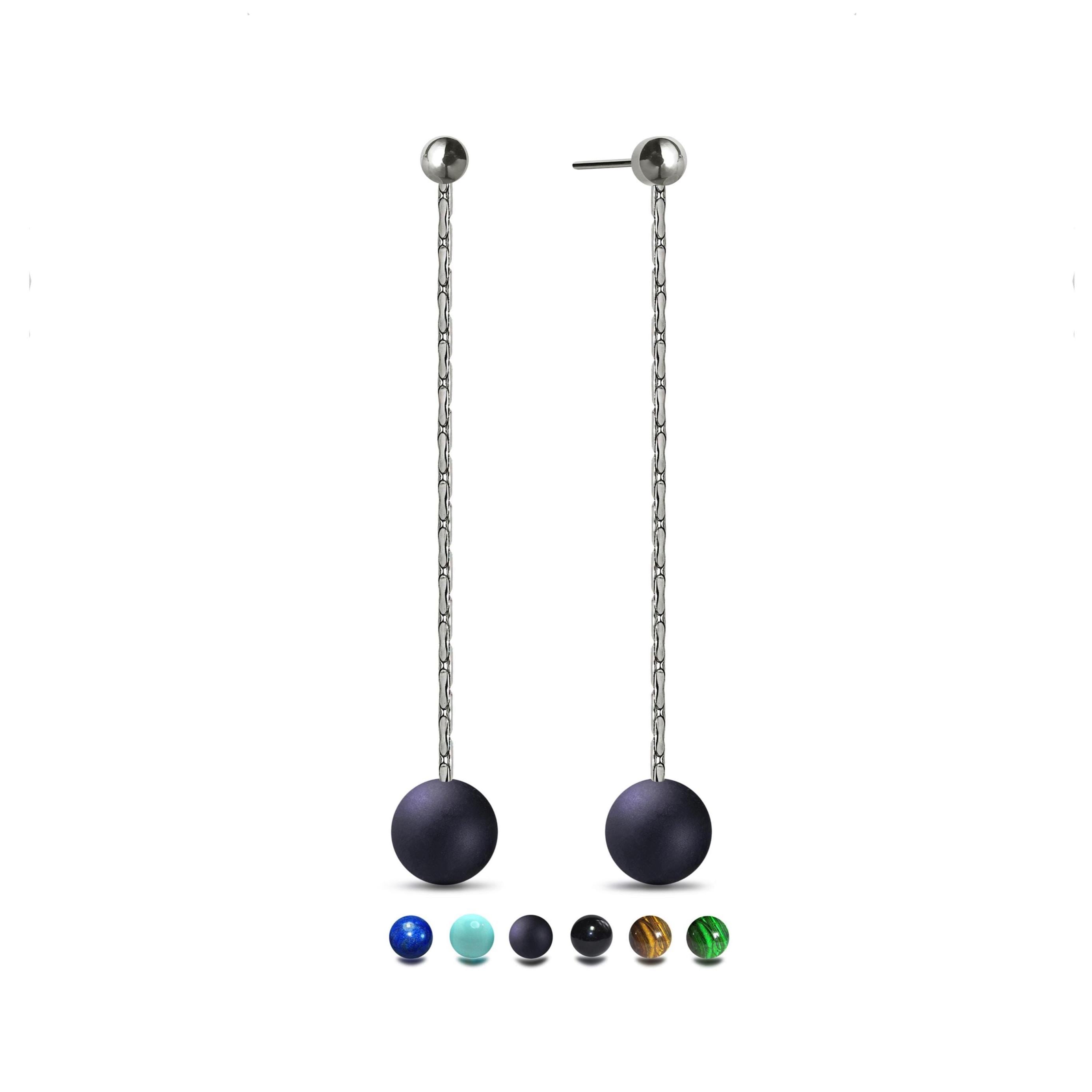 Sleek and sculptural, these handcrafted earrings by Taormina Jewelry feature a long, square-style extra thin chain suspended from a polished stud, finished with a matte natural round stone for a bold yet refined silhouette.