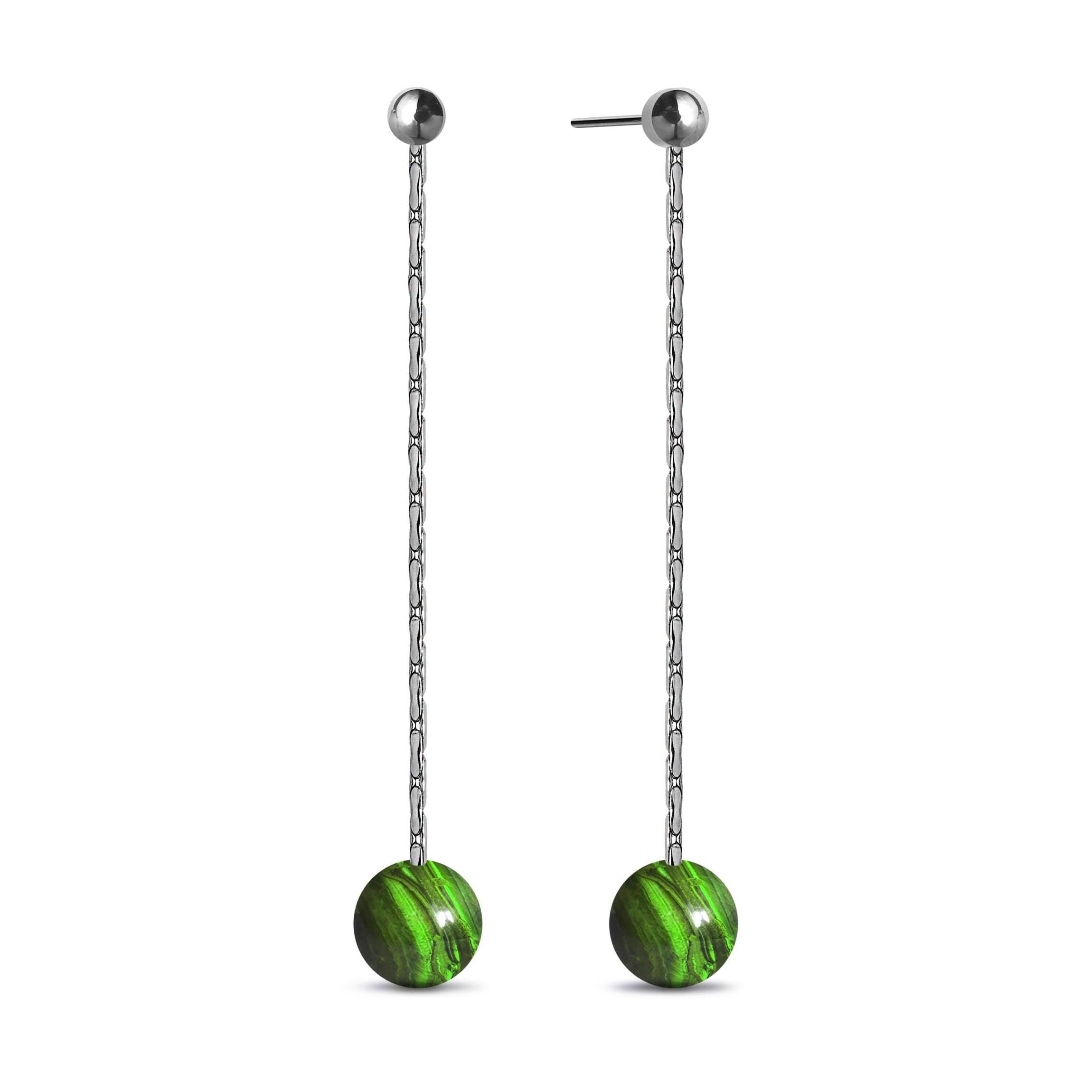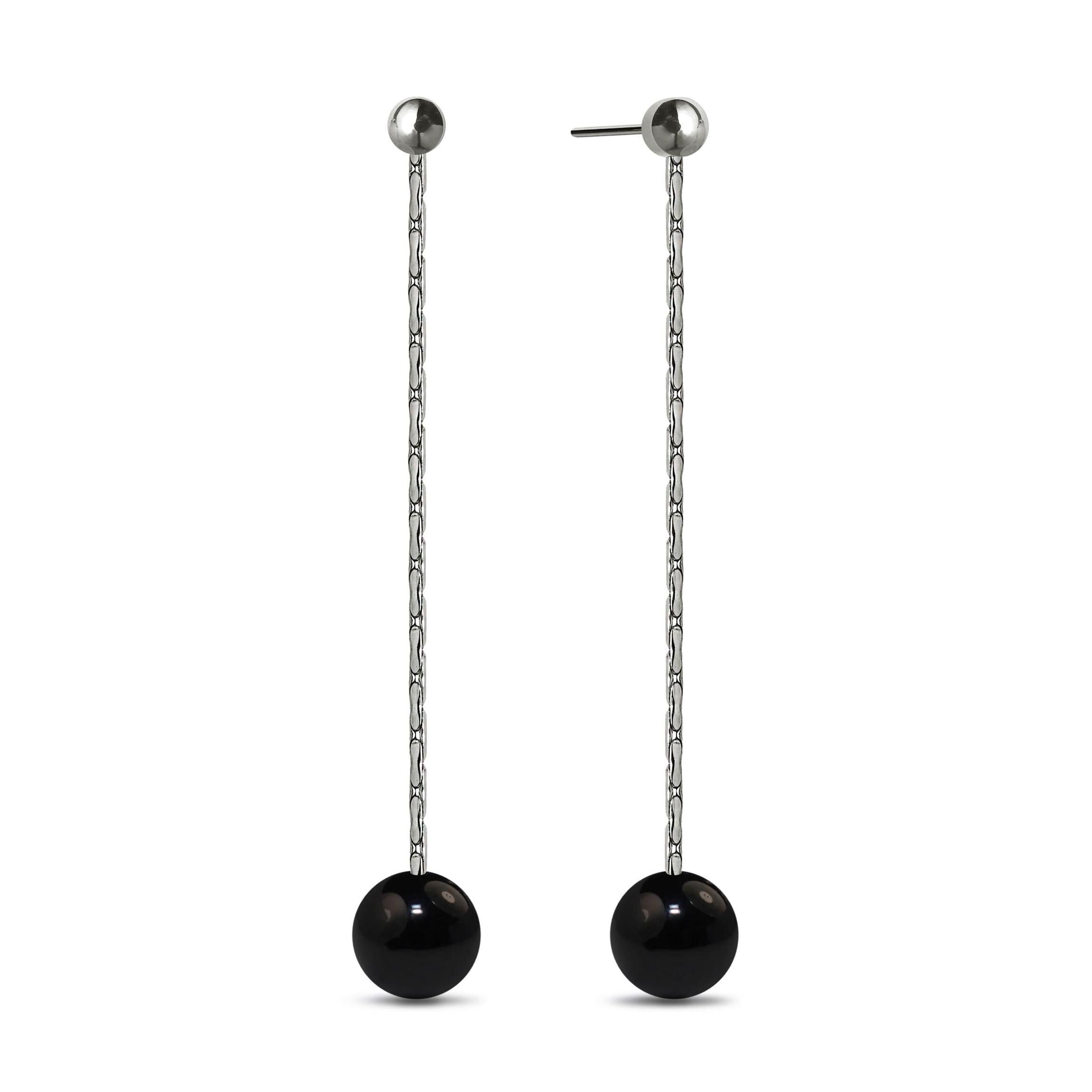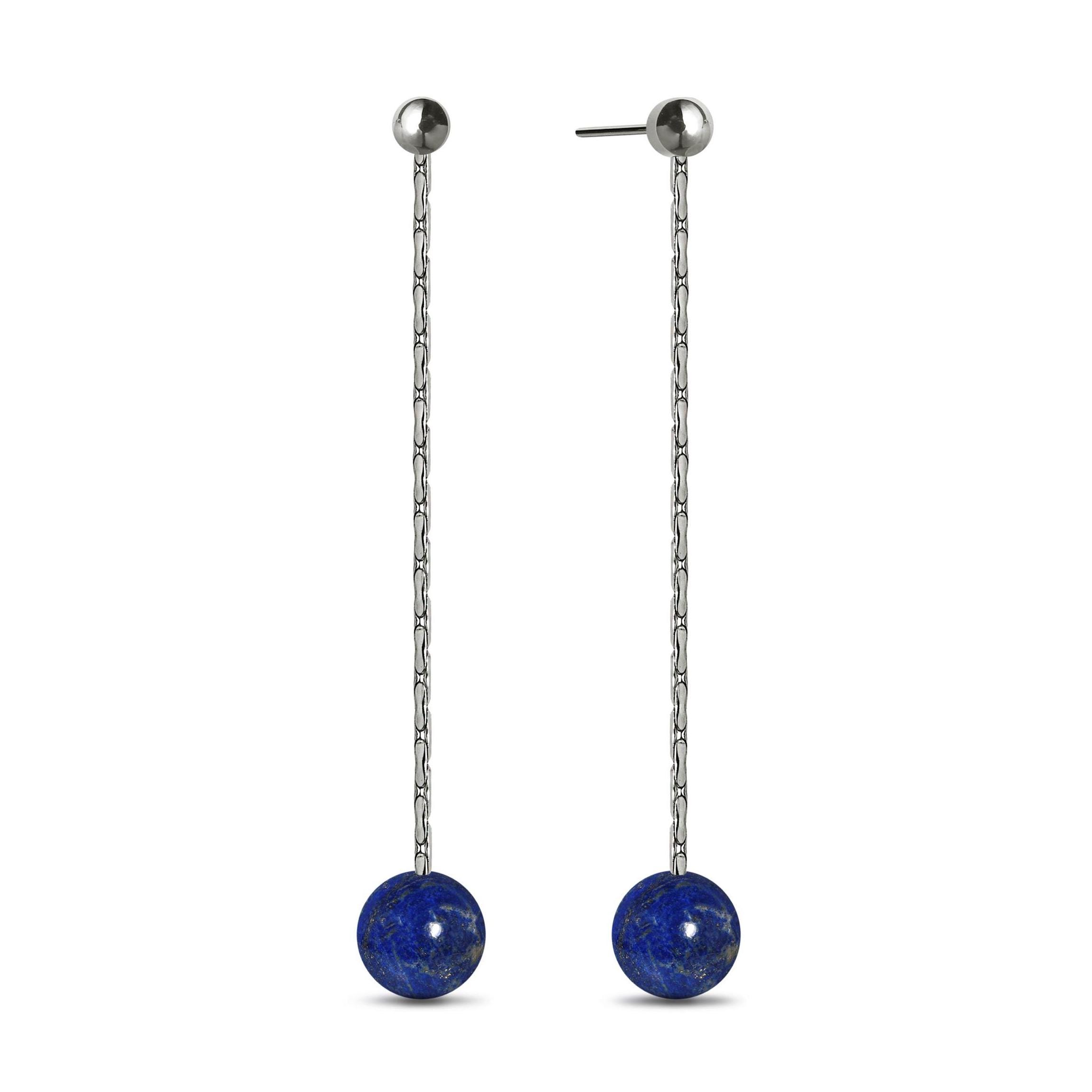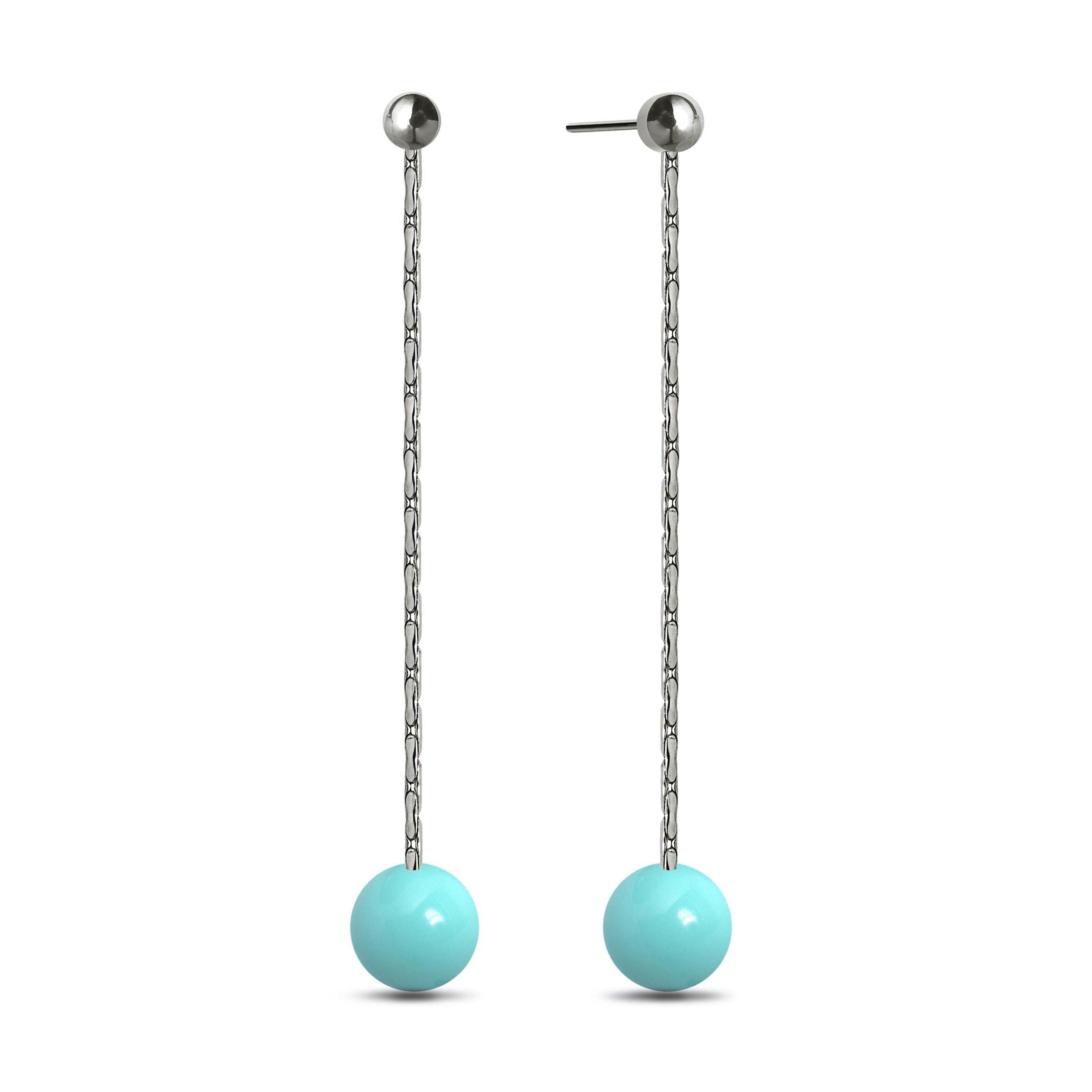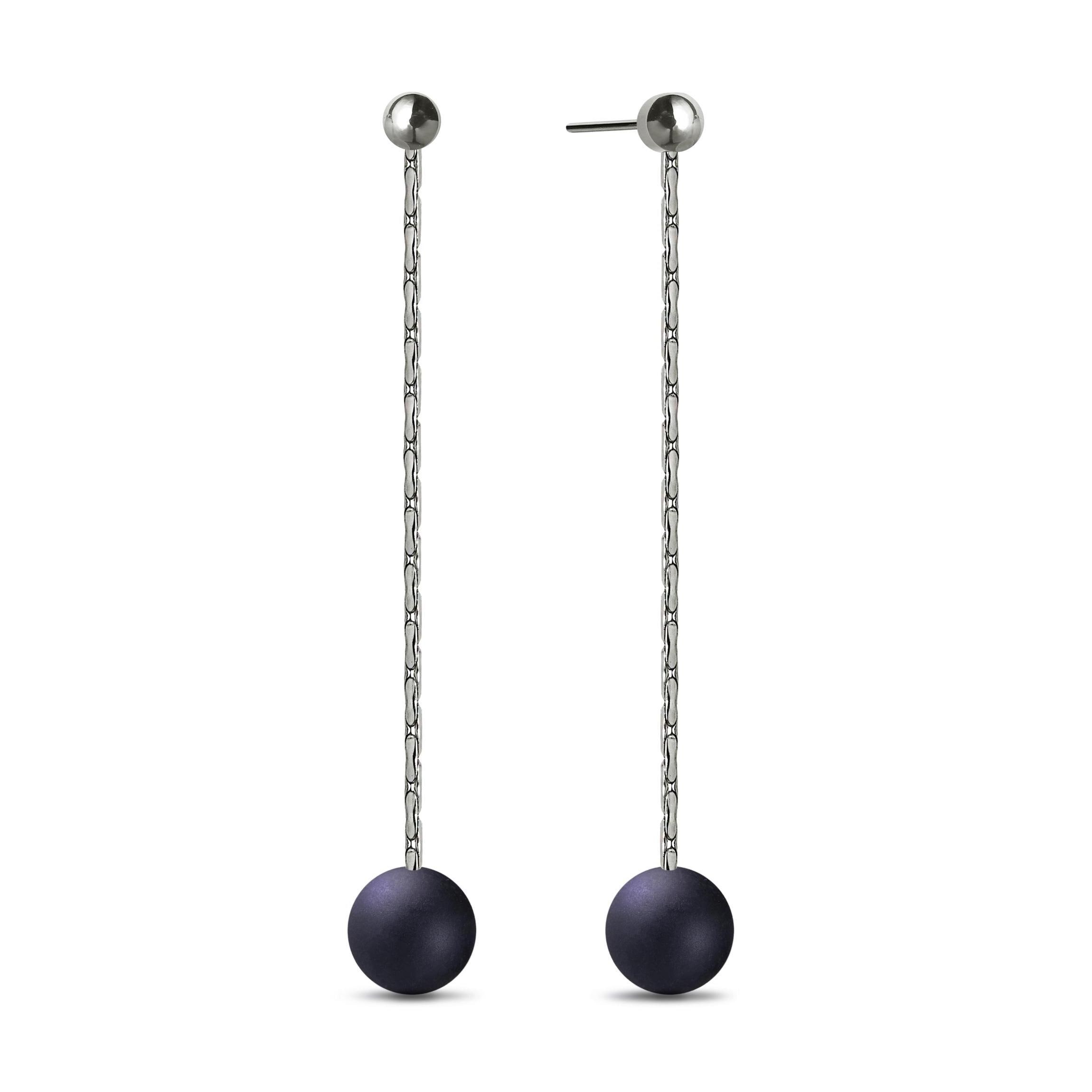 Sleek and sculptural, these handcrafted earrings by Taormina Jewelry feature a long, square-style extra thin chain suspended from a polished stud, finished with a matte natural round stone for a bold yet refined silhouette.