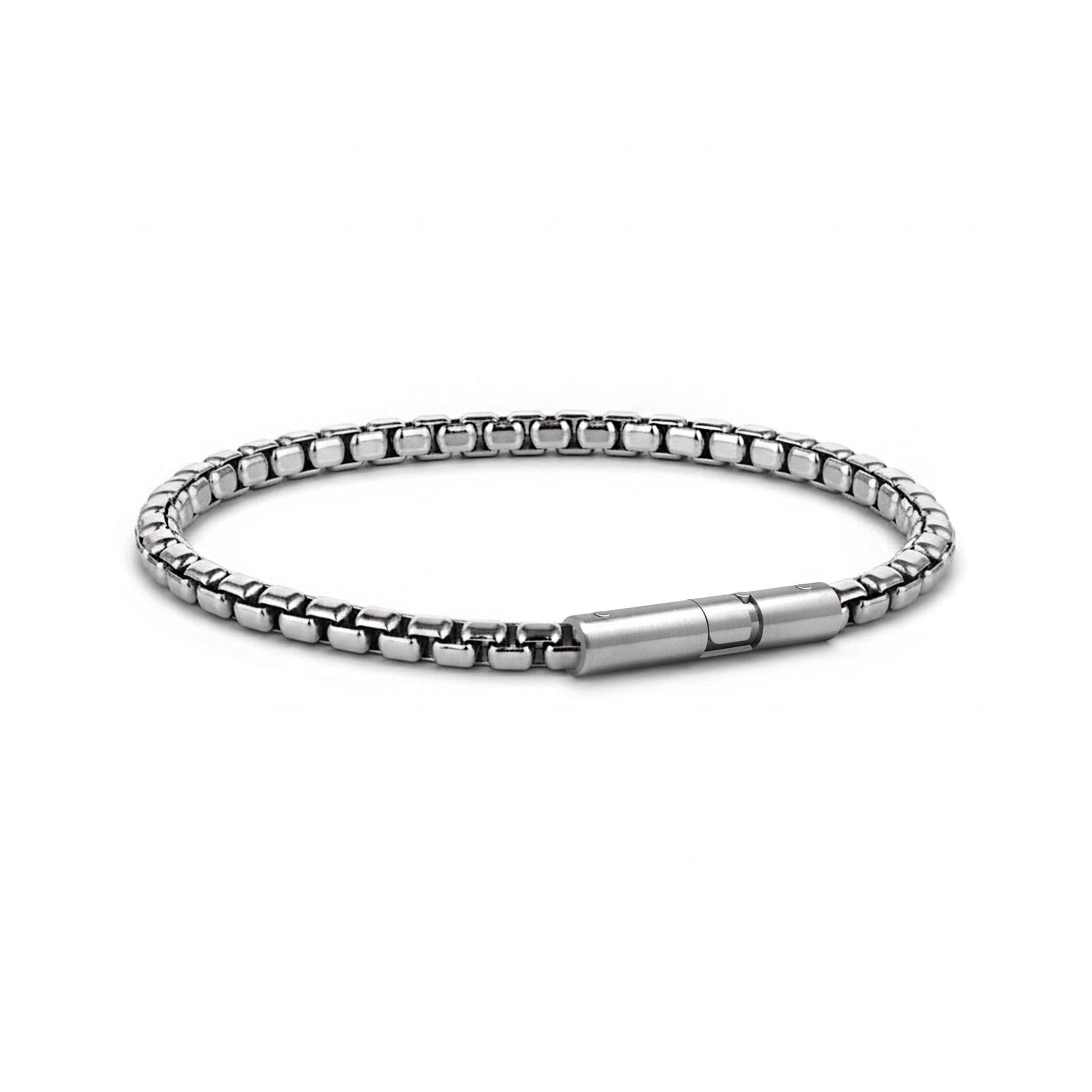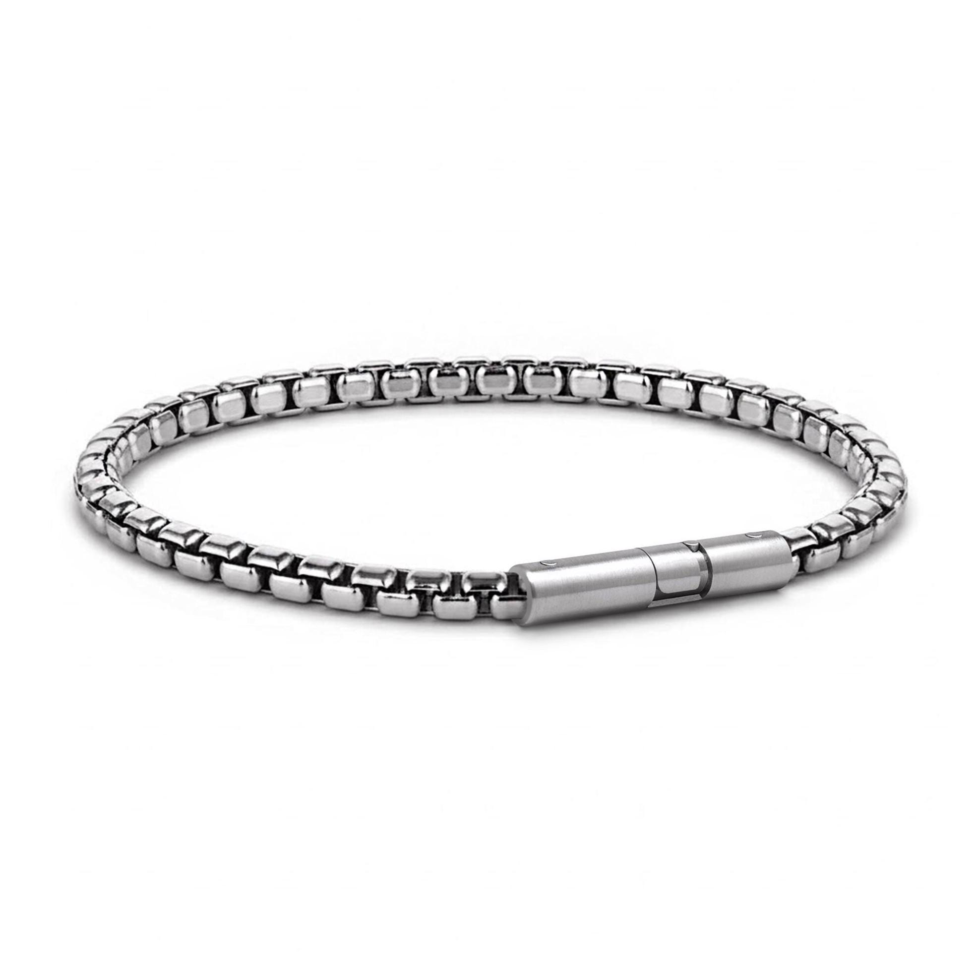 This 4mm box chain bracelet is crafted from high-quality stainless steel with a polished finish, offering a refined industrial look. The sturdy high precision twist bayonet clasp that features a secure twist-locking mechanism, is in brushed finish and designed and crafted in-house, its minimalist form creates a single, unbroken line, allowing the box chain to flow gracefully around the wrist. The clasp is riveted directly into the chain, making it virtually unbreakable, ensuring both durability and a seamless, secure fit. Designed for those who appreciate clean lines and understated strength, this bracelet pairs effortlessly with both casual and formal attire.