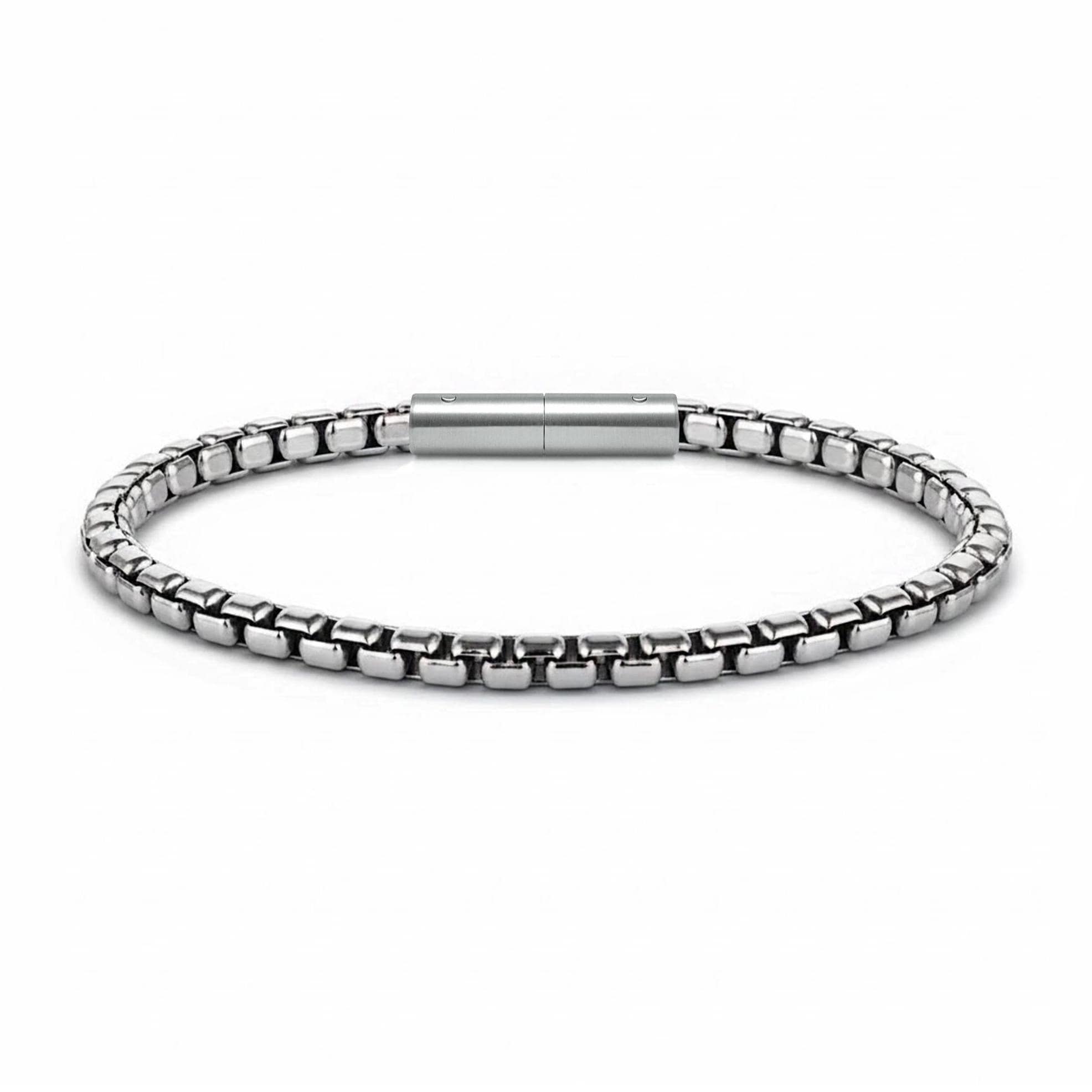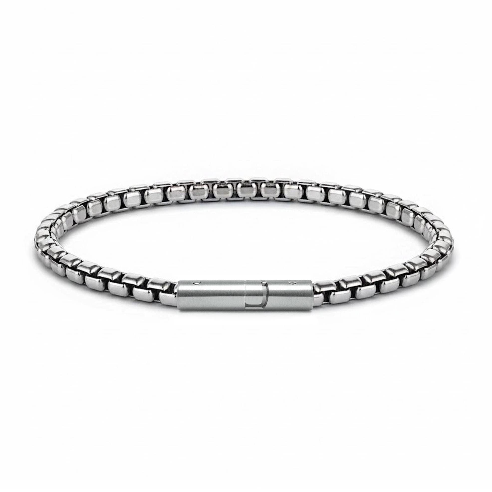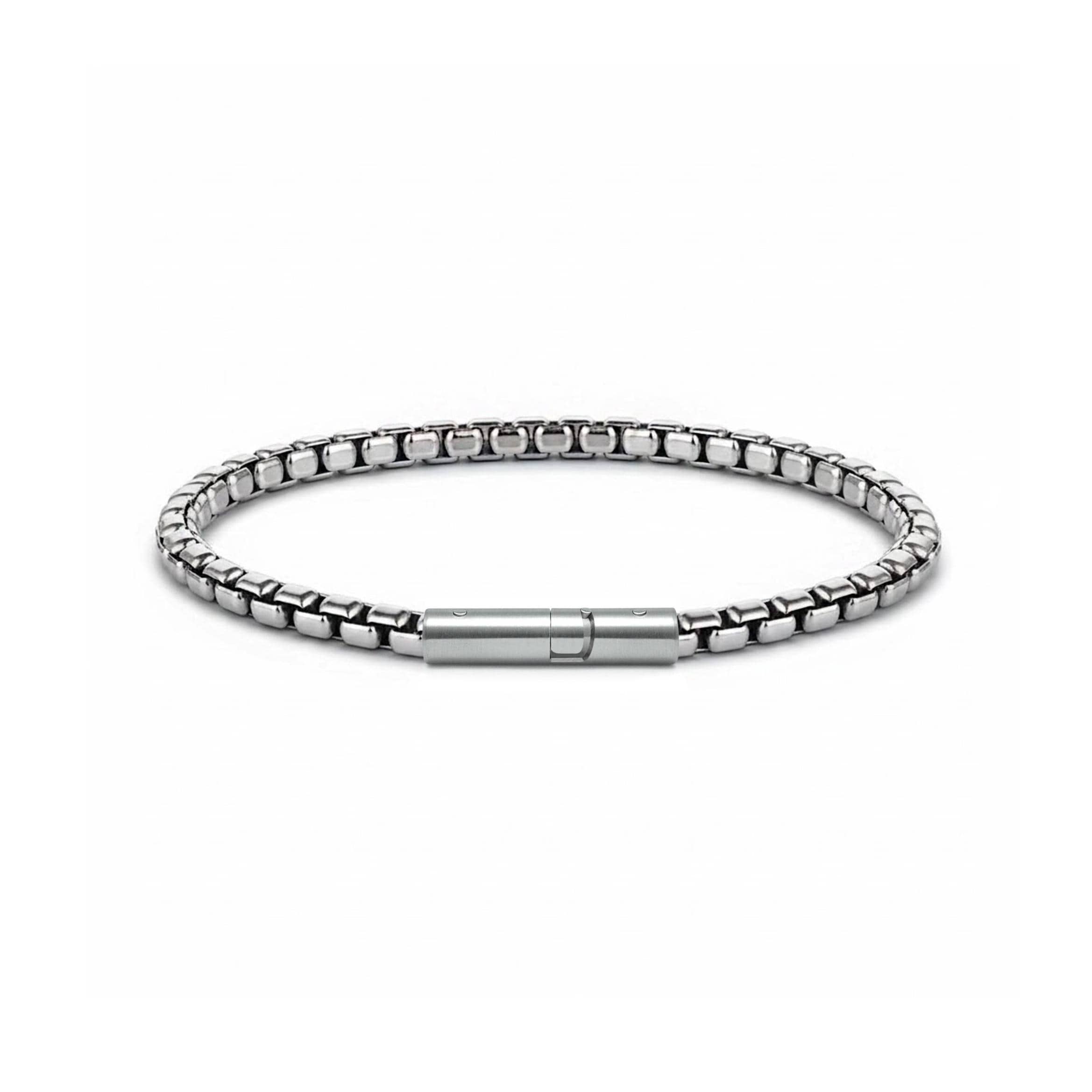 This 4mm box chain bracelet is crafted from high-quality stainless steel with a polished finish, offering a refined industrial look. The sturdy high precision twist bayonet clasp that features a secure twist-locking mechanism, is in brushed finish and designed and crafted in-house, its minimalist form creates a single, unbroken line, allowing the box chain to flow gracefully around the wrist. The clasp is riveted directly into the chain, making it virtually unbreakable, ensuring both durability and a seamless, secure fit. Designed for those who appreciate clean lines and understated strength, this bracelet pairs effortlessly with both casual and formal attire.