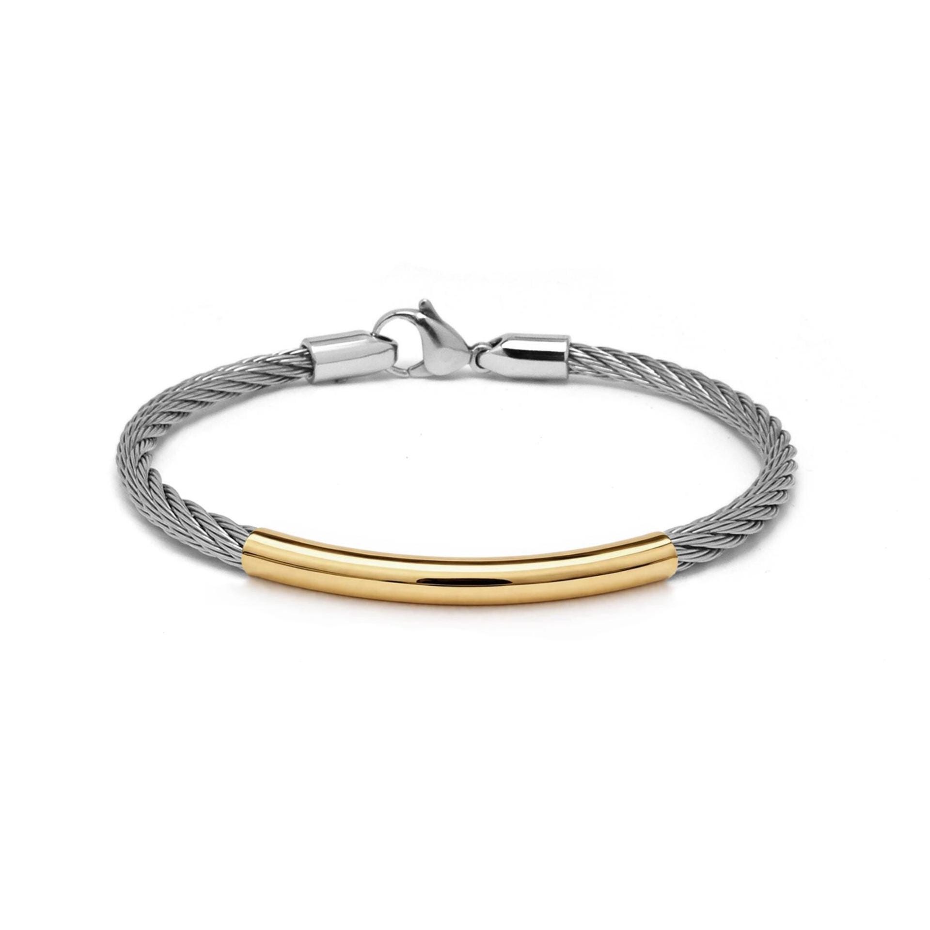 Bold. Resilient. Refined. 4mm stainless steel wirerope Industrial wire twisted rope bracelet with gold tube and lobster clasp is designed for those who value clean lines and effortless elegance. Featuring a tightly braided Industrial wire twisted rope construction, it delivers a modern industrial edge while maintaining a minimal, gender-neutral aesthetic.