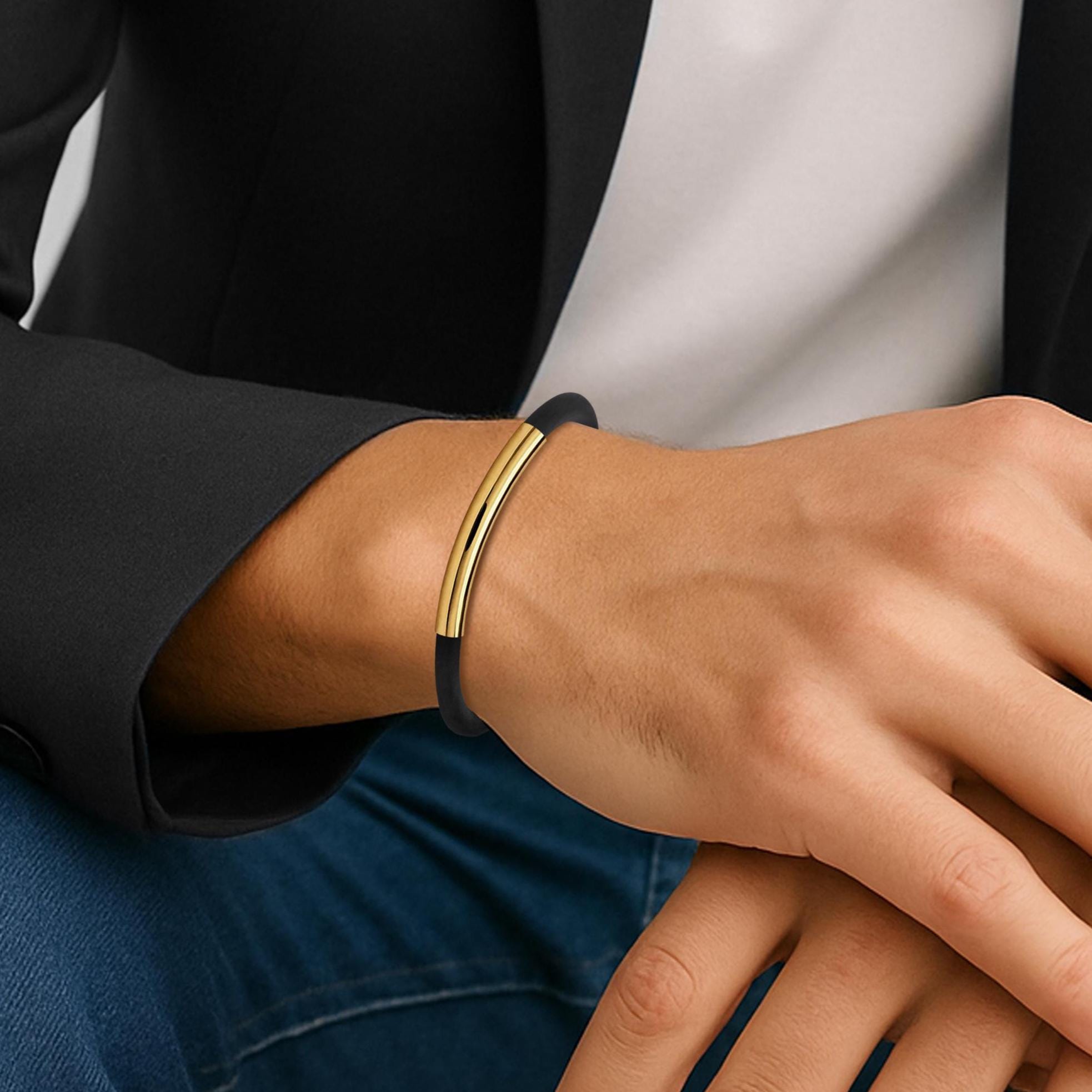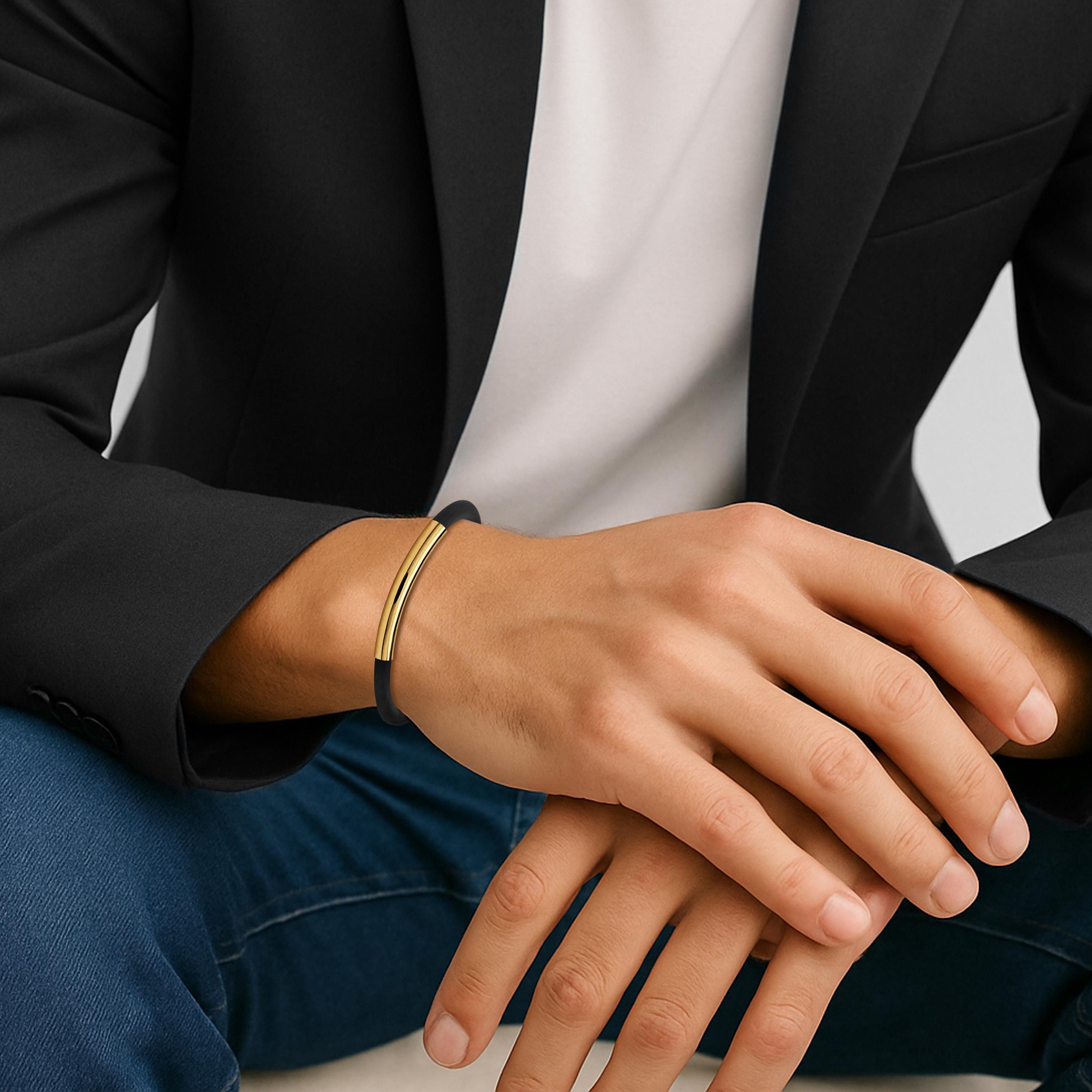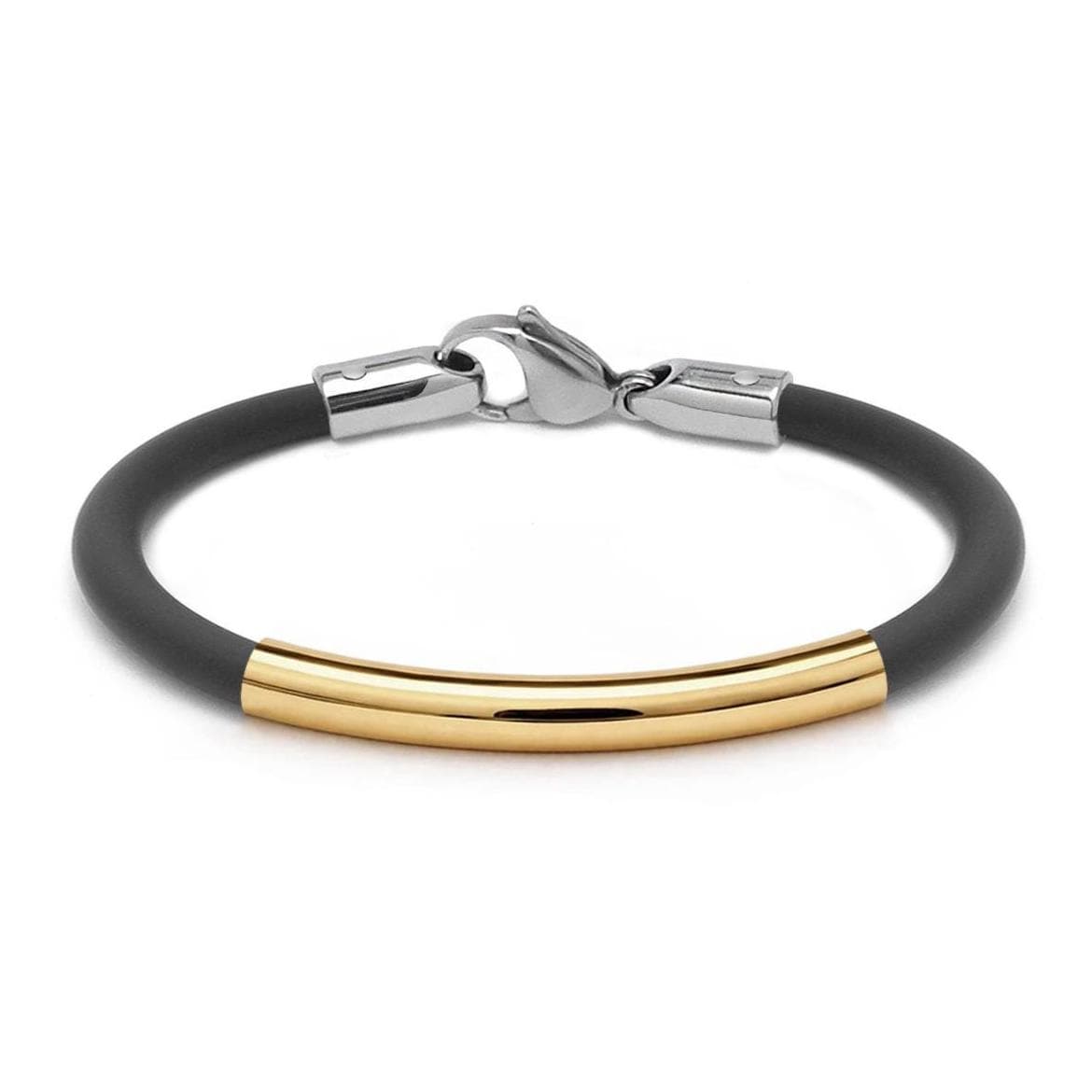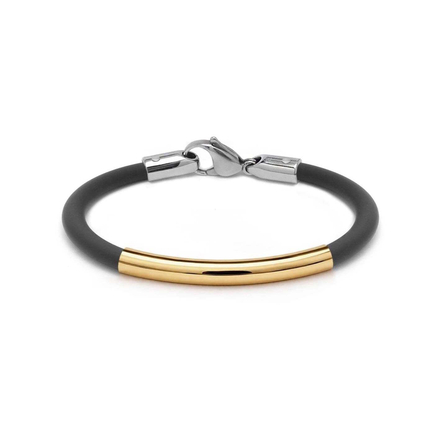 Expertly handcrafted, this bracelet pairs soft black 4mm silicone rubber secured with a gold tube and a precision-engineered lobster clasp in stainless steel—designed for a seamless fit and confident closure.