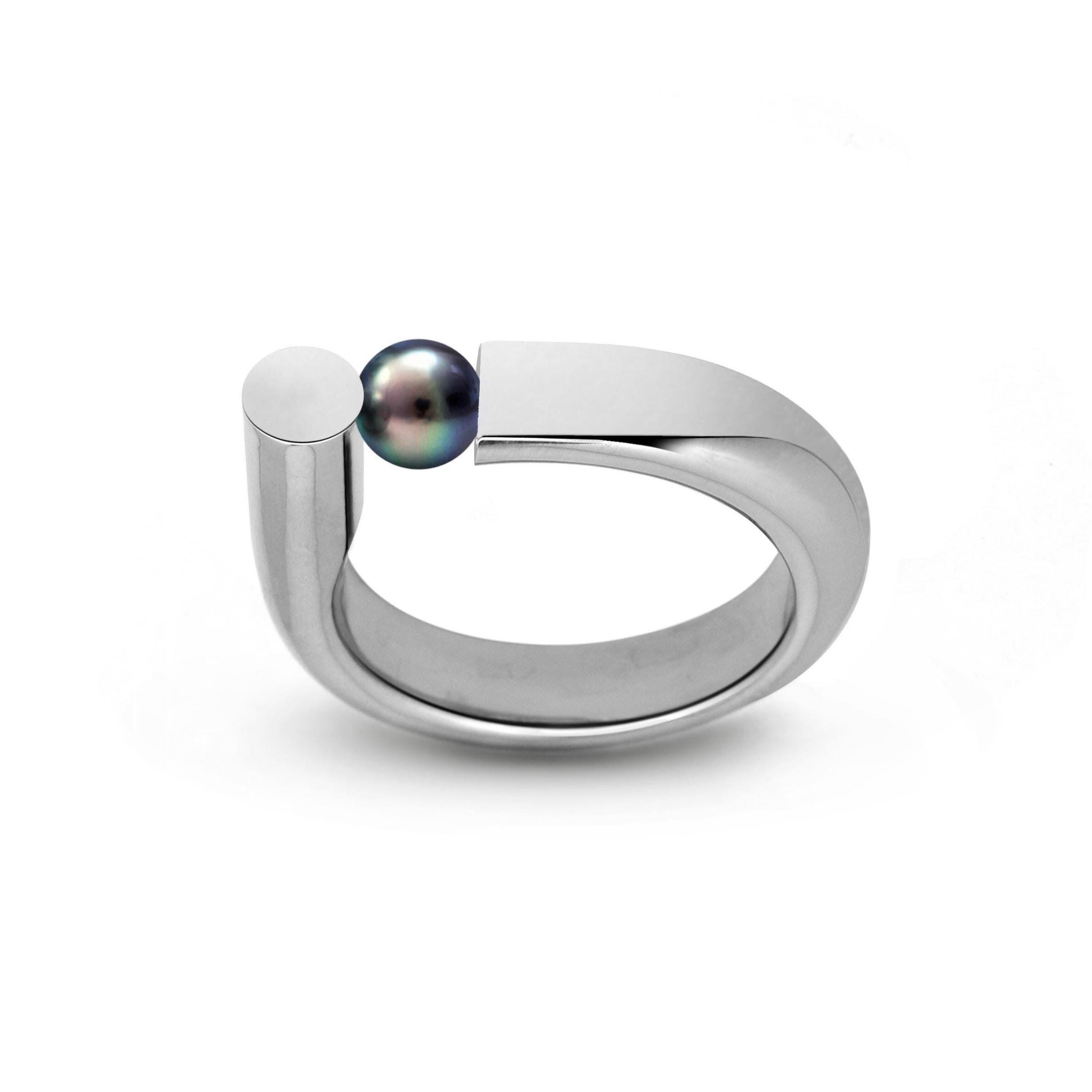 This exquisite ring is a masterful interplay of contrasts, where tubular and flat silhouettes meet in perfect harmony. Sculpted in polished stainless steel, its fluid design curves gracefully to cradle a luminous off-centered round Black Pearl, suspended as though floating between the two ends. The sleek tubular side balances with the refined flat surface, creating a modern yet timeless aesthetic that speaks of both strength and elegance. Versatile in its allure, this piece can be worn as a distinctive pinky ring, adding a refined touch of individuality and sophistication to any ensemble.