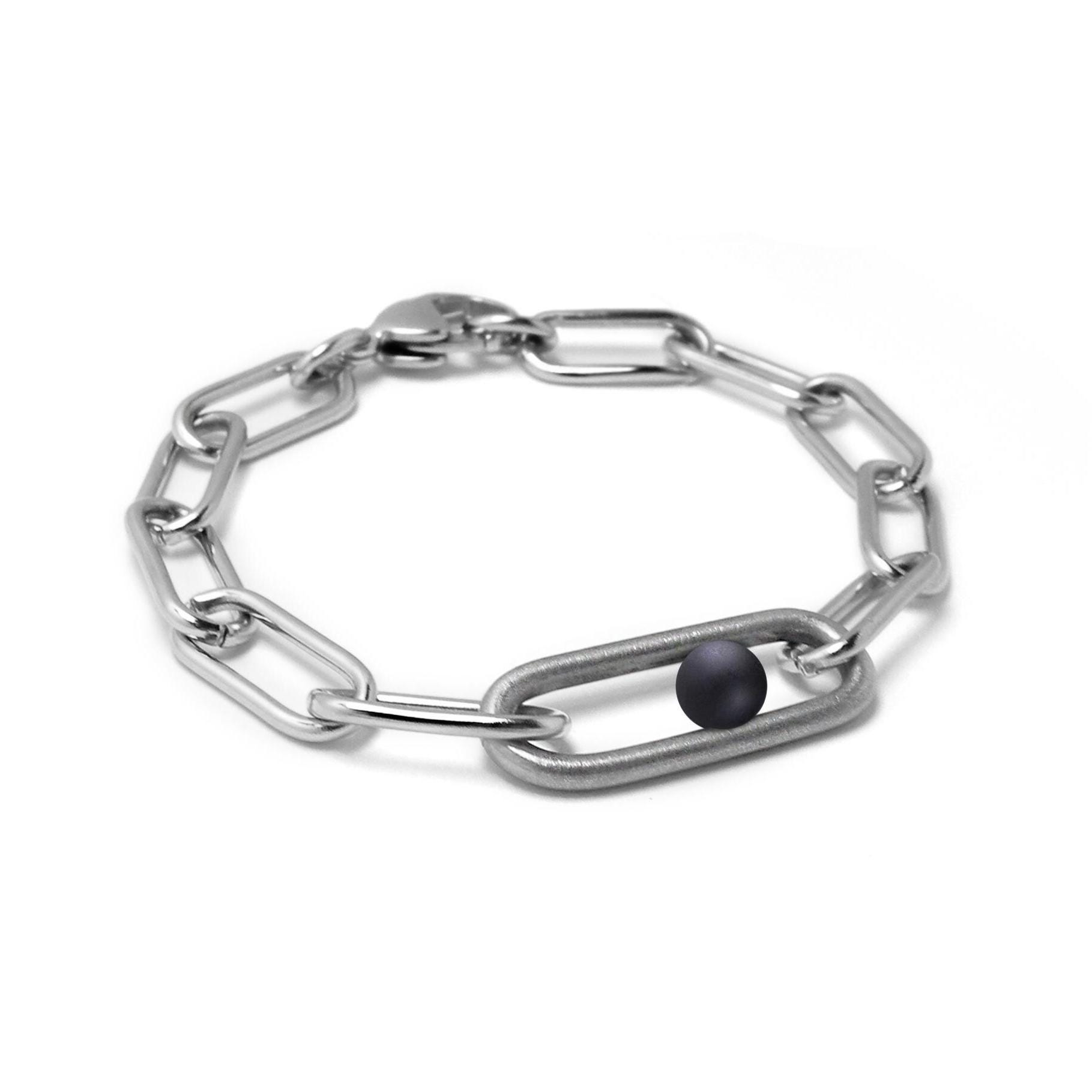 This unique bracelet features a robust stainless steel paperclip style chain, characterized by elongated links. One central larger link stands out with a brushed finish, providing a subtle textural contrast. Within this brushed central link, a smooth, matte black obsidian bead is securely set between its two bars, creating a striking interplay of texture and color. The minimalist yet eye-catching design makes this bracelet a versatile accessory, perfect for adding a touch of contemporary style to any outfit. The stainless steel lobster clasp ensures a secure and comfortable fit.
