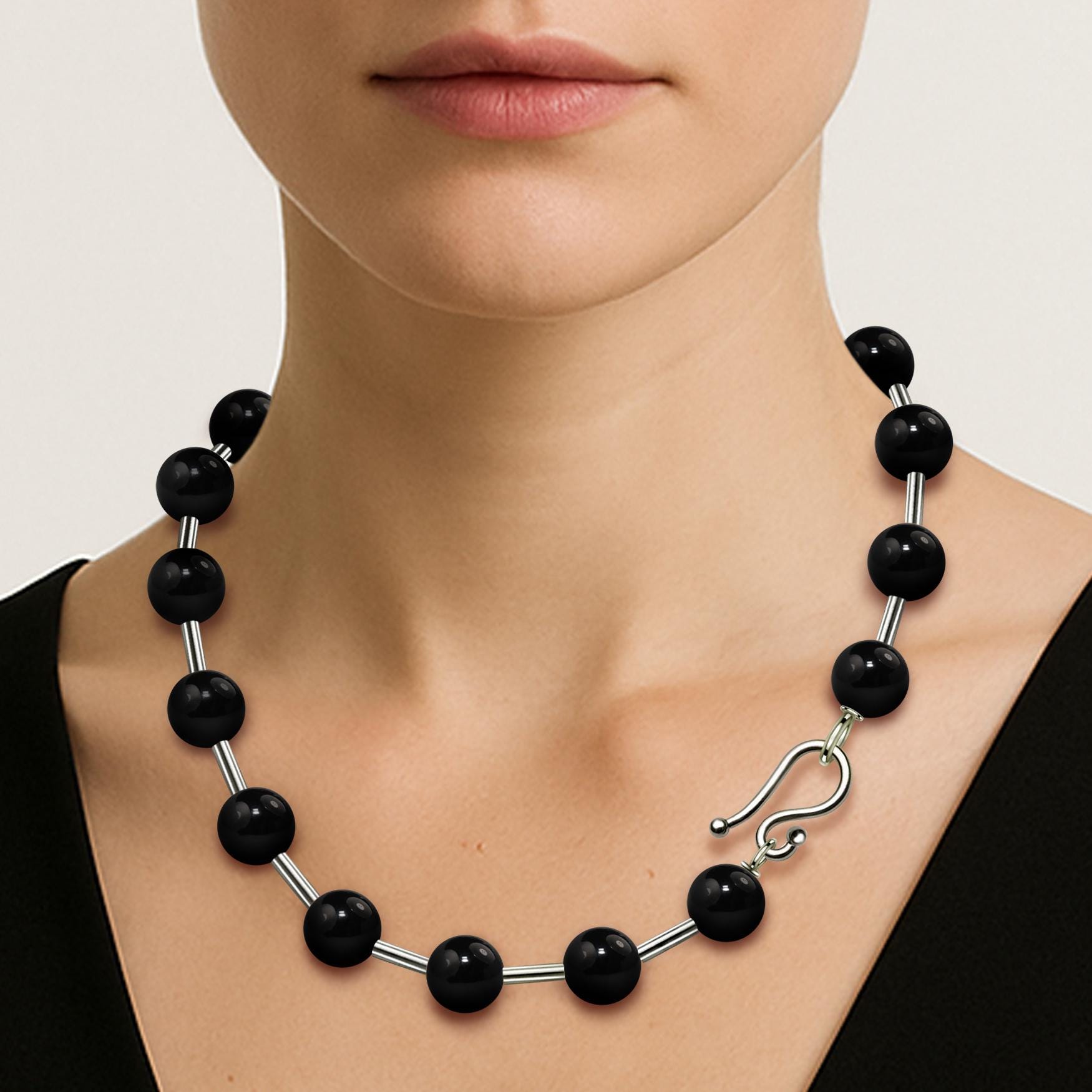 A statement of modern elegance, this necklace combines the deep, lustrous allure of polished black onyx with the sleek sophistication of satin-finished stainless steel tubes. Each element is strung on a soft yet durable steel cable, ensuring both flexibility and long-lasting security, while preserving the refined flow of the design. The natural intensity of onyx meets the cool, contemporary lines of steel in a bold yet timeless rhythm. The piece is completed with an artisan-inspired hook clasp — both secure and effortlessly stylish — that underscores its luxurious character. Perfect for those who appreciate jewelry that embodies strength, minimalism, and prestige.