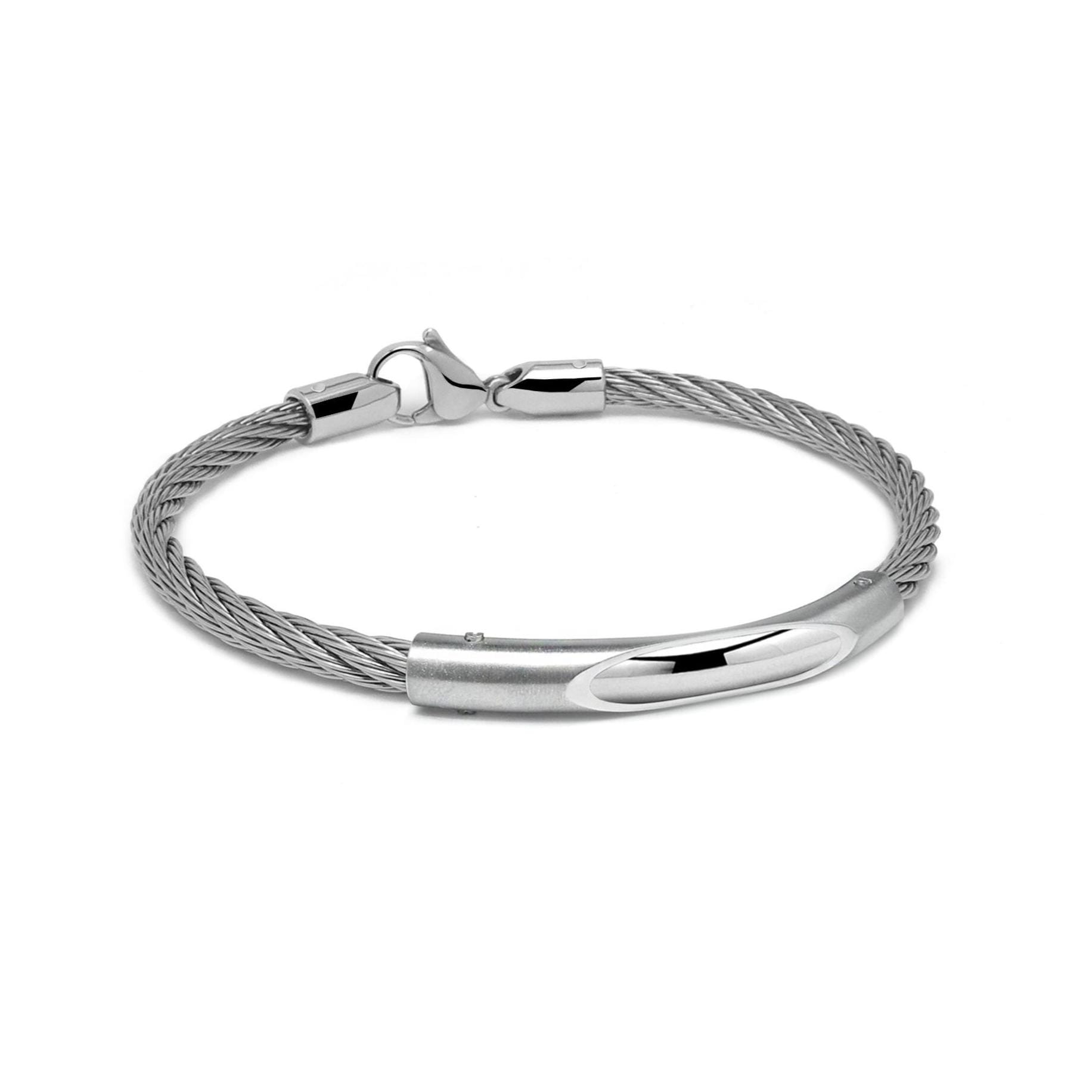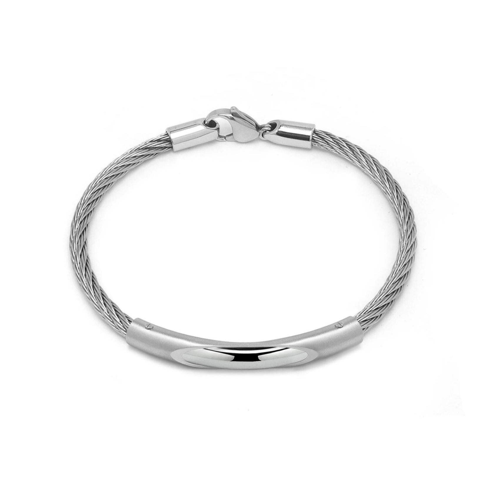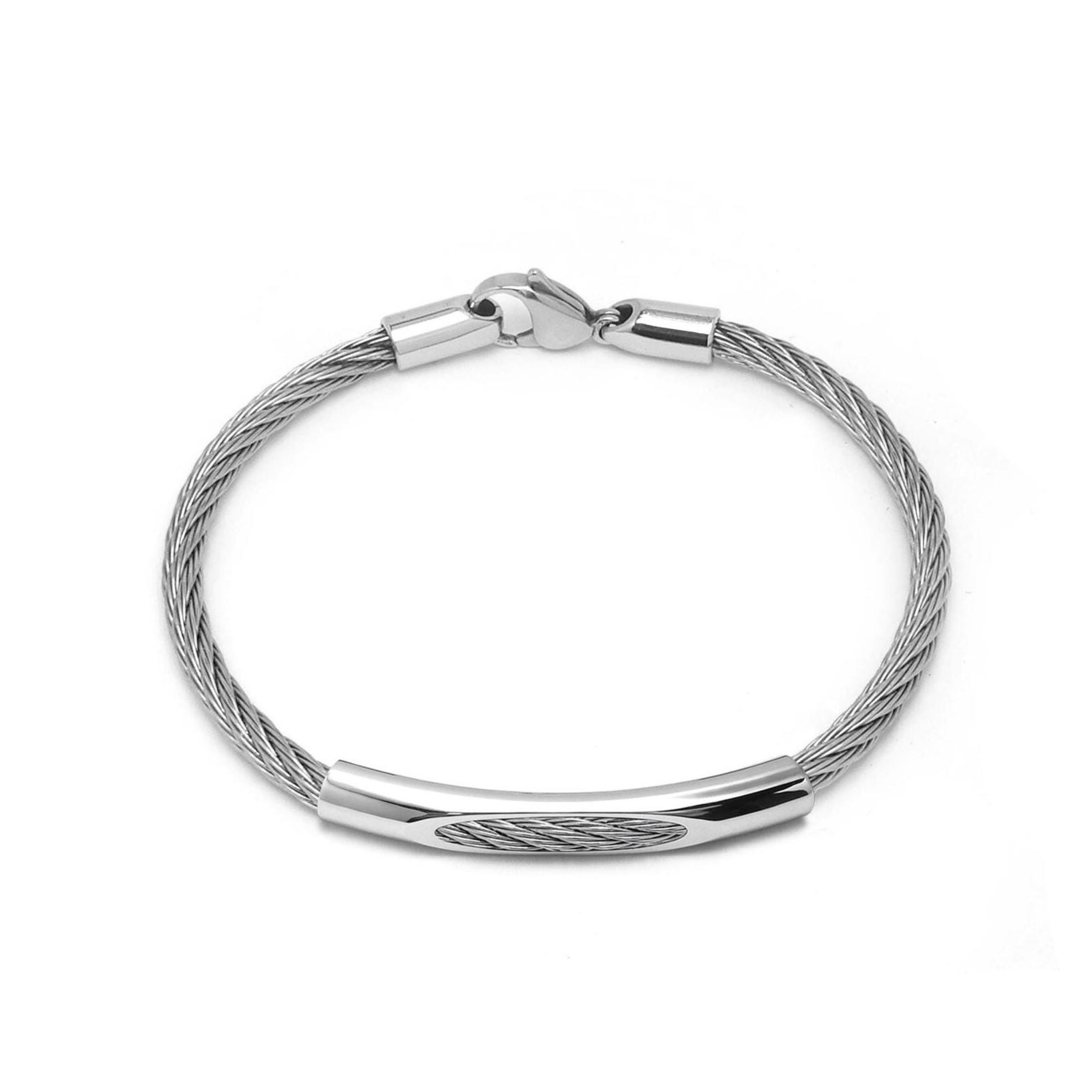 The side caps are securely riveted into the cable, ensuring a robust and reliable connection. This bracelet is perfect worn solo or layered with other pieces for a personalized look. Lightweight and versatile, it transitions seamlessly from office to evening.