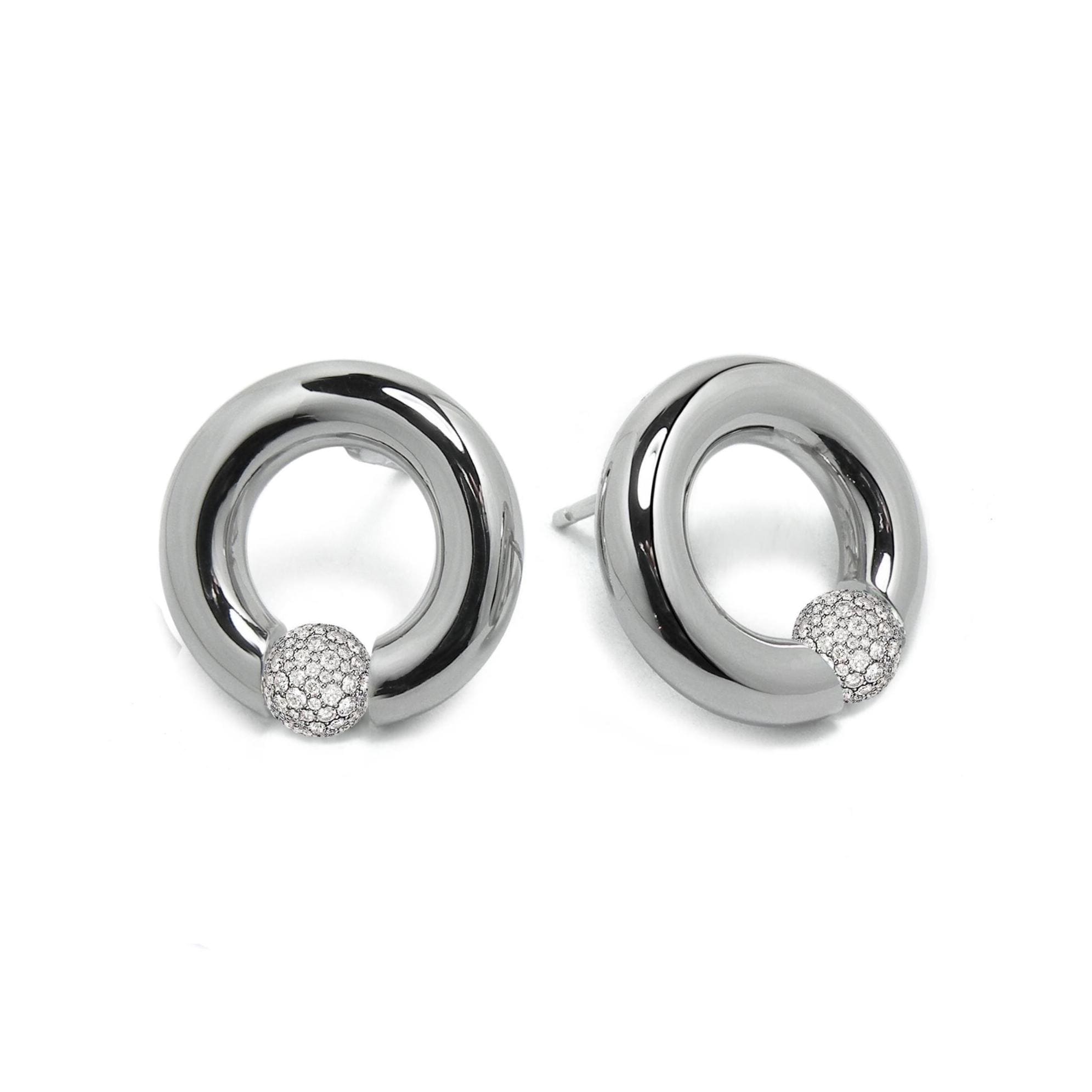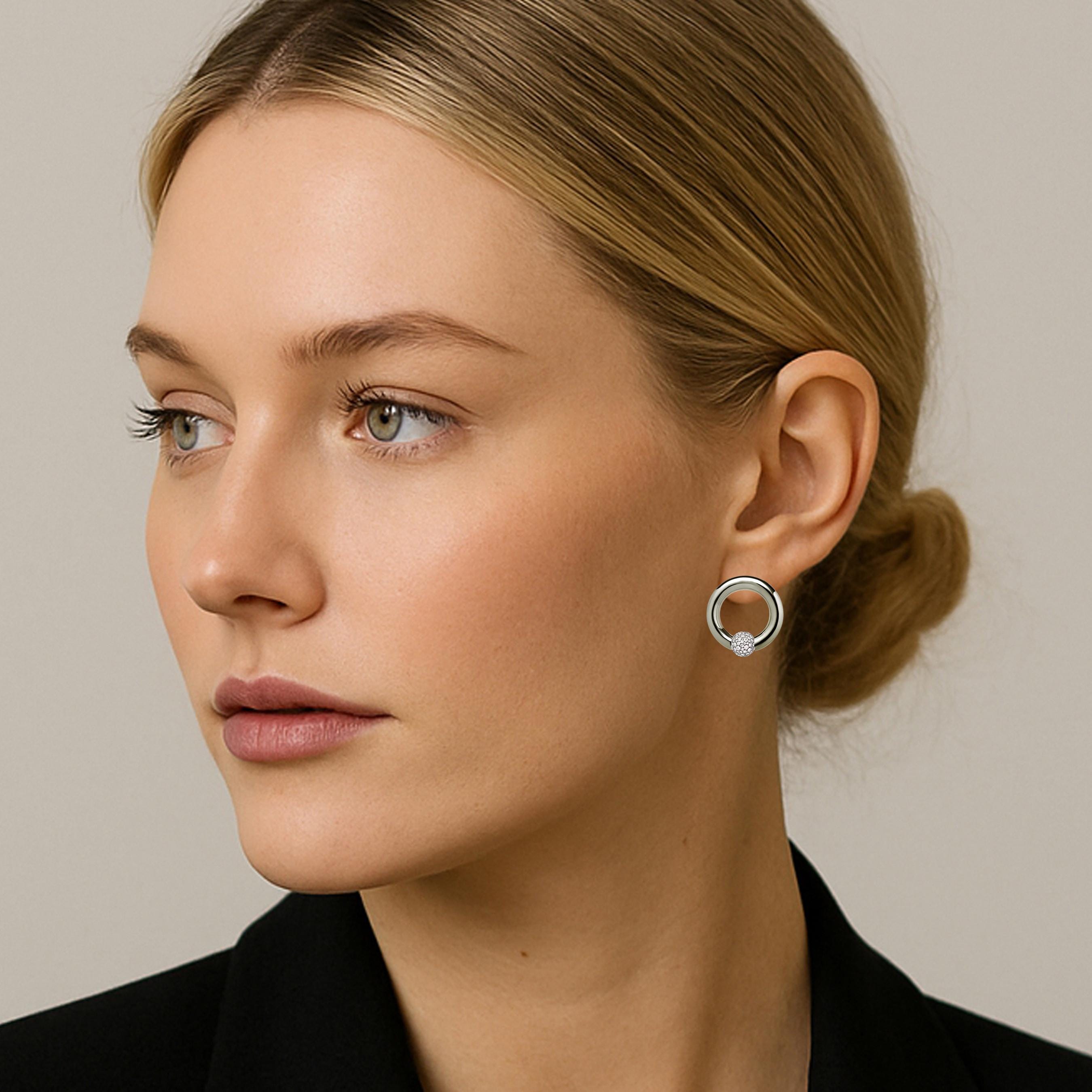 A seamless fusion of architectural minimalism and luminous sparkle, the LUNA stud earrings embody modern elegance. Each earring showcases a slender tubular stainless-steel O-Ring, centered at the base, a 6 mm tension-set pavé white sapphire sphere nestles between the ring ends—capturing light from every angle and appearing to hover in place.